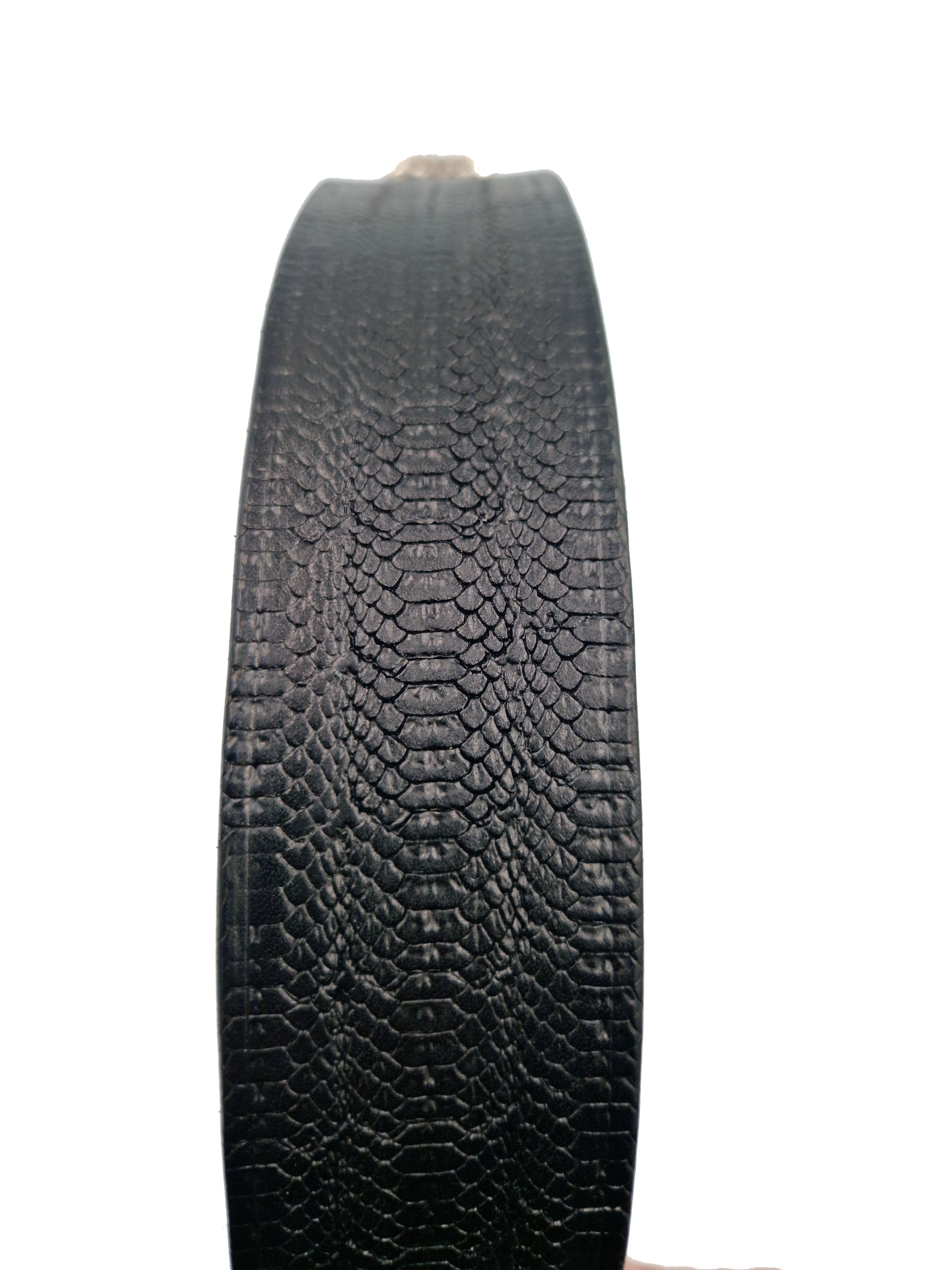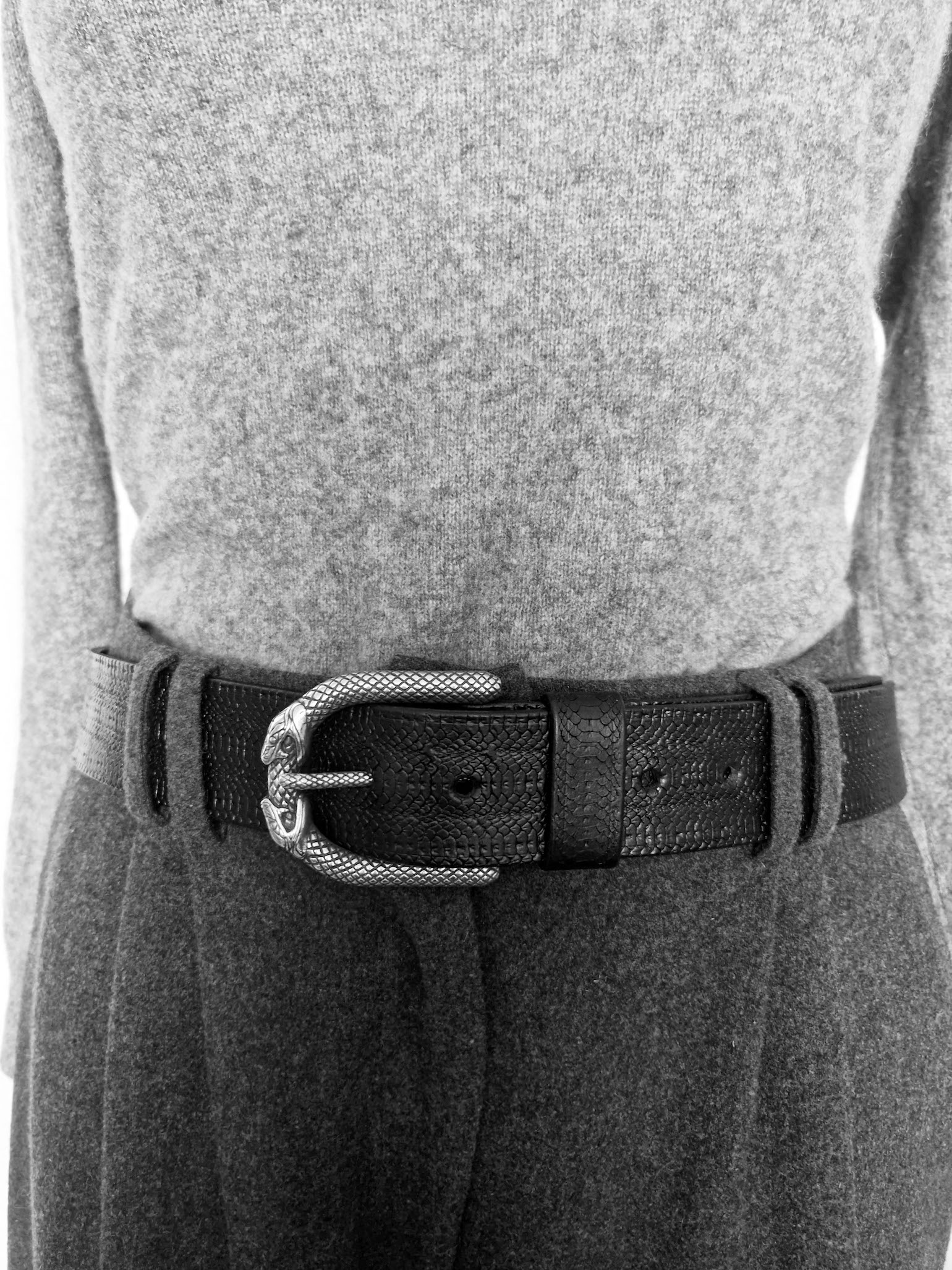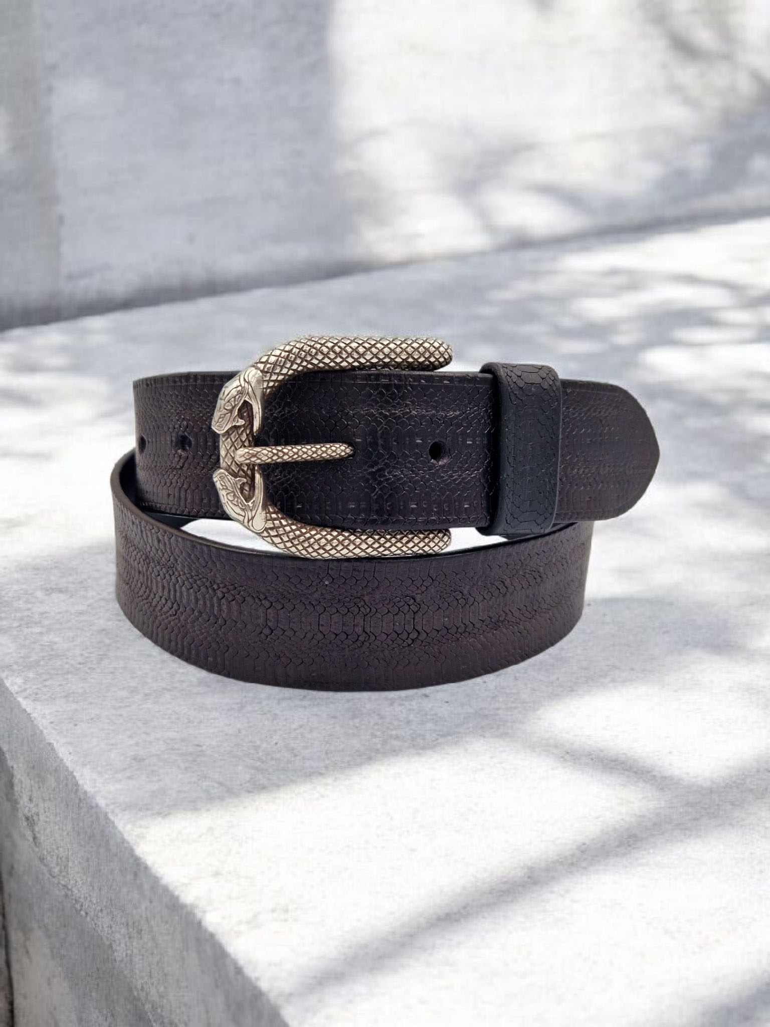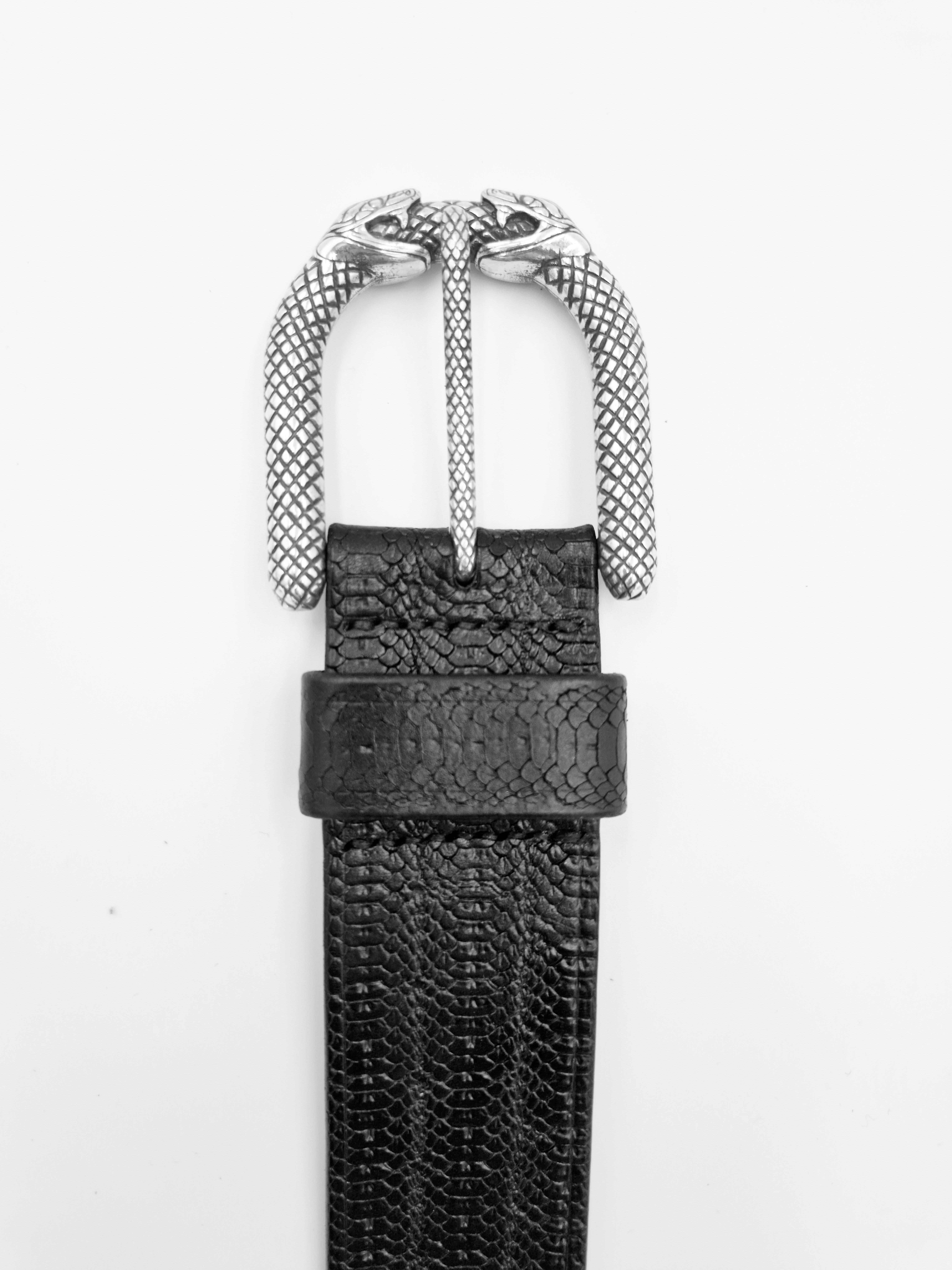 Pagamintas iš augalinio išdirbimo odos, su rankomis iškaltu gyvatės odos faktūra – todėl kiekvienas diržas vienetinis.