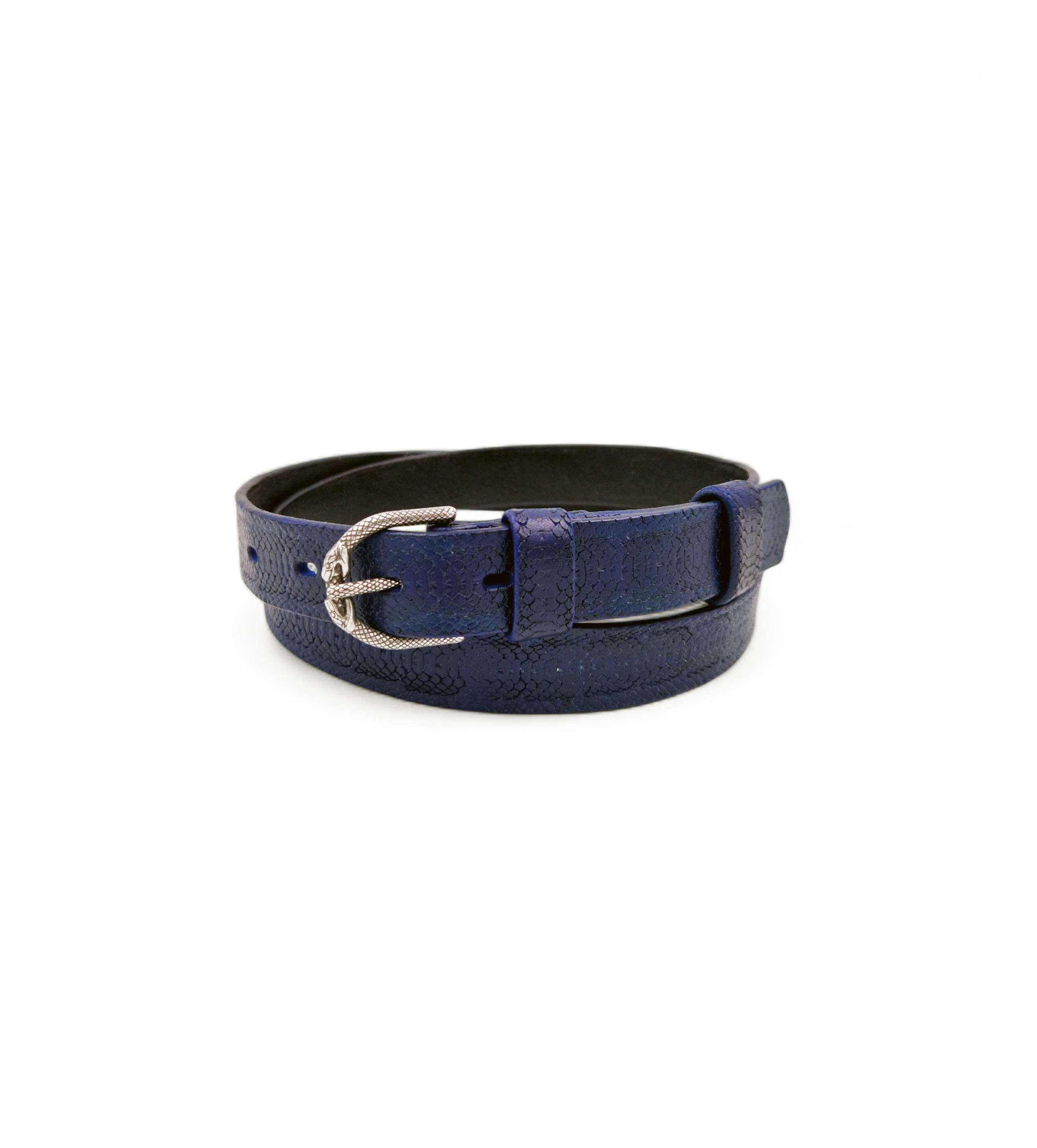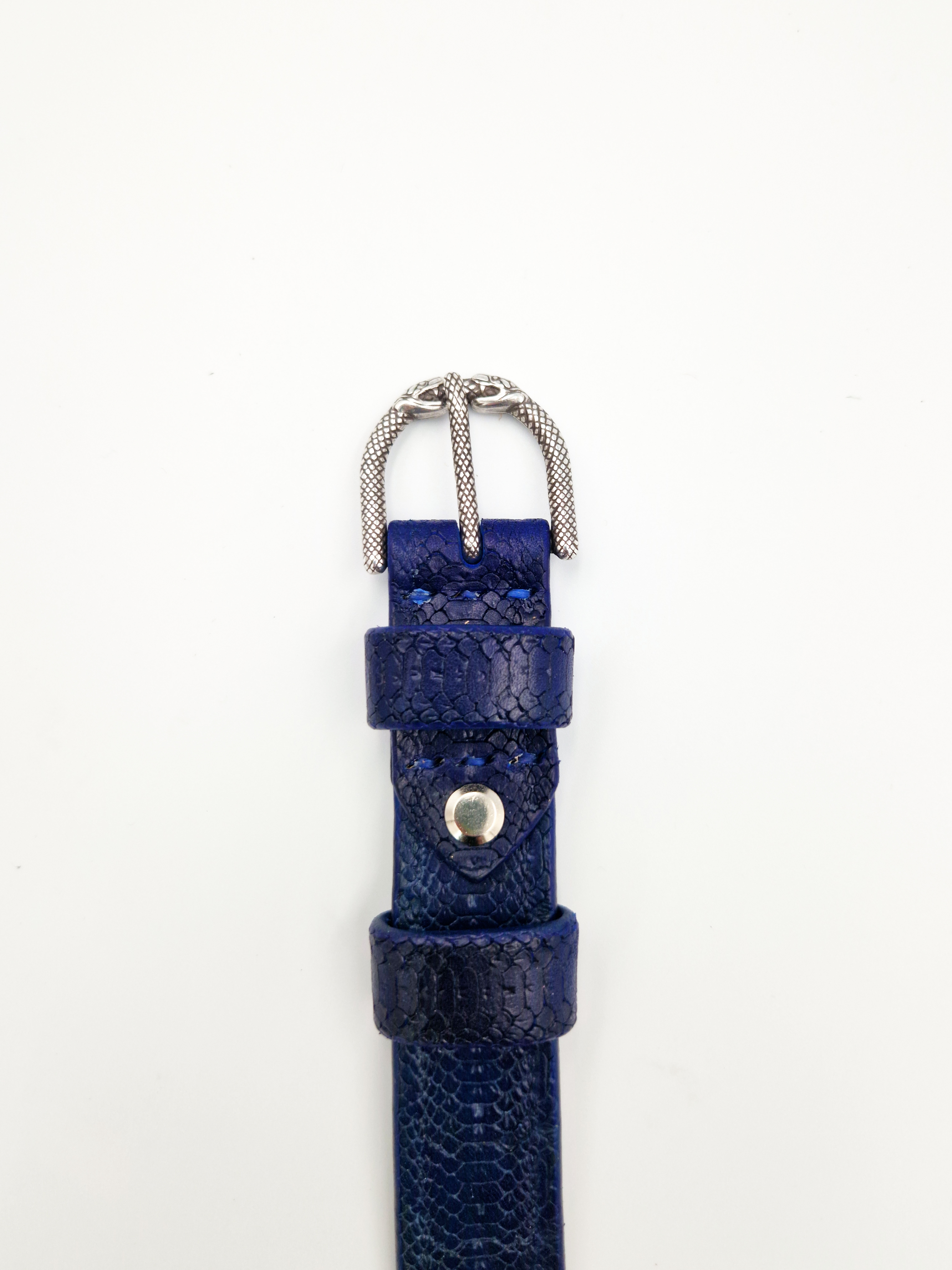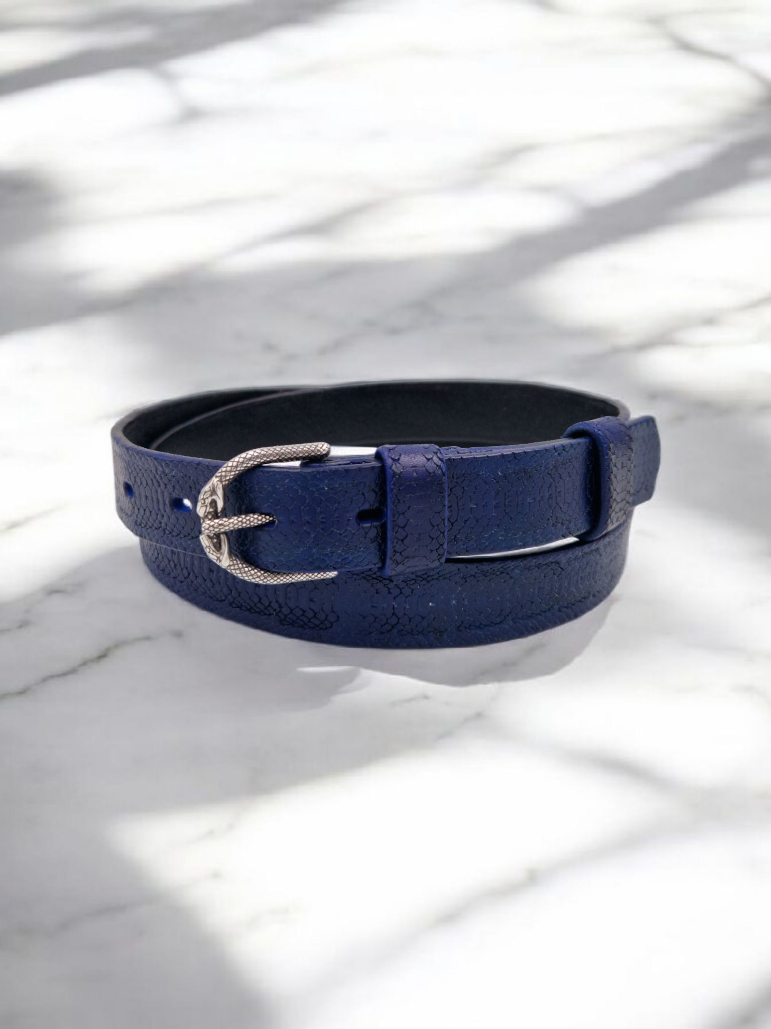 Išskirtinis rankų darbo siauras mėlynas odinis diržas su įspūdinga sagtimi „Gyvatė ryjanti save“, simbolizuojančia atsinaujinimą ir stiprybę.