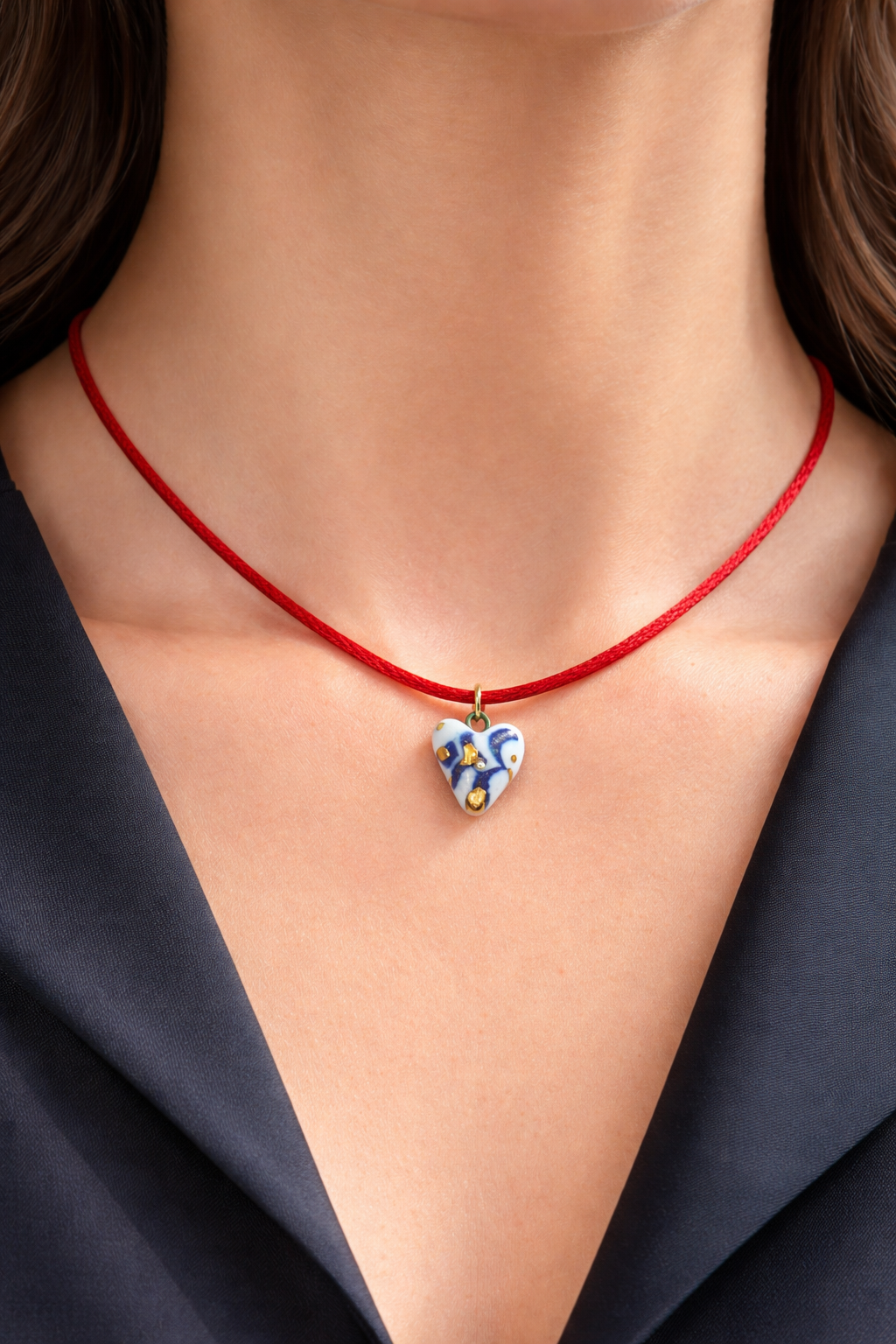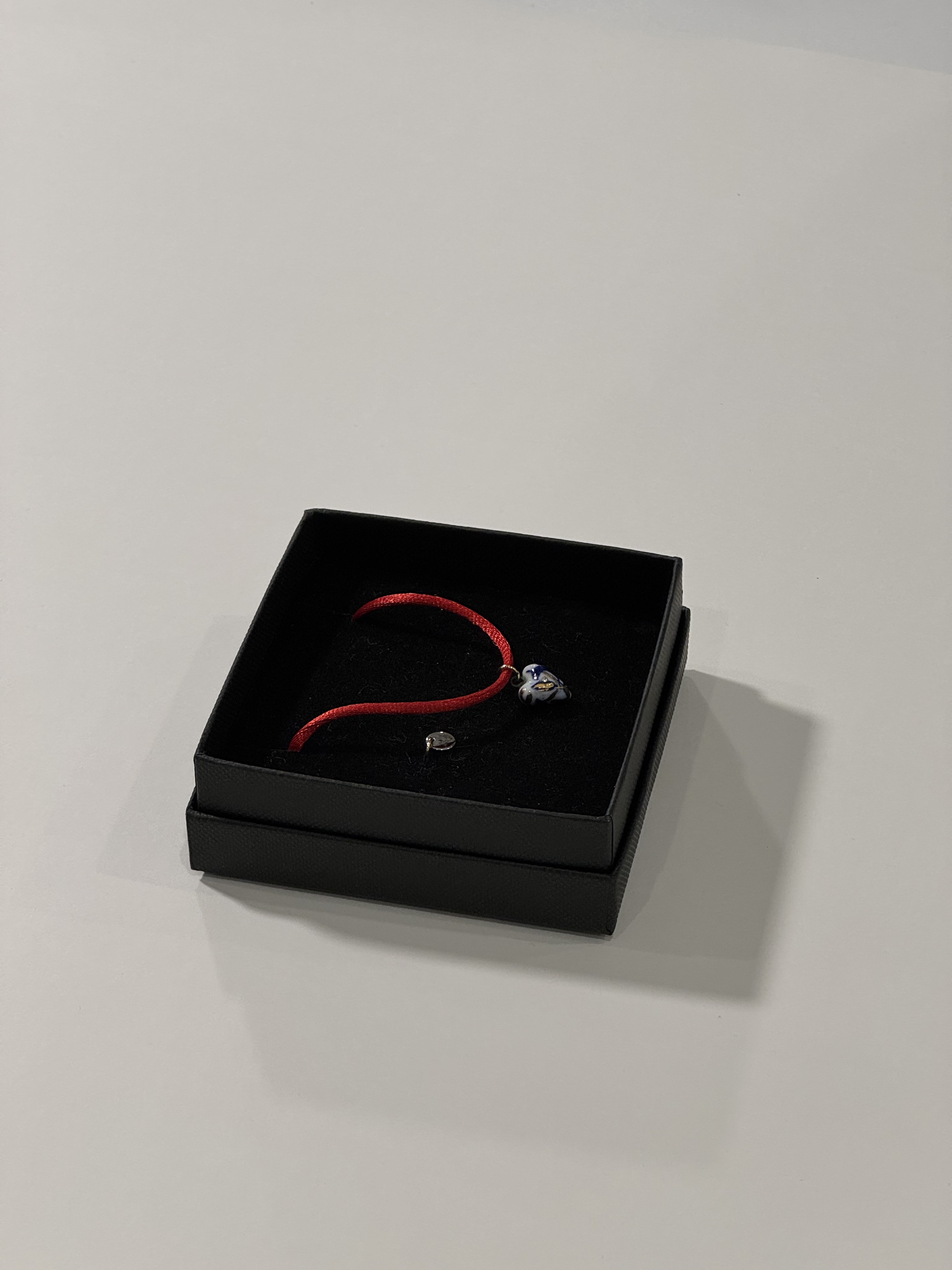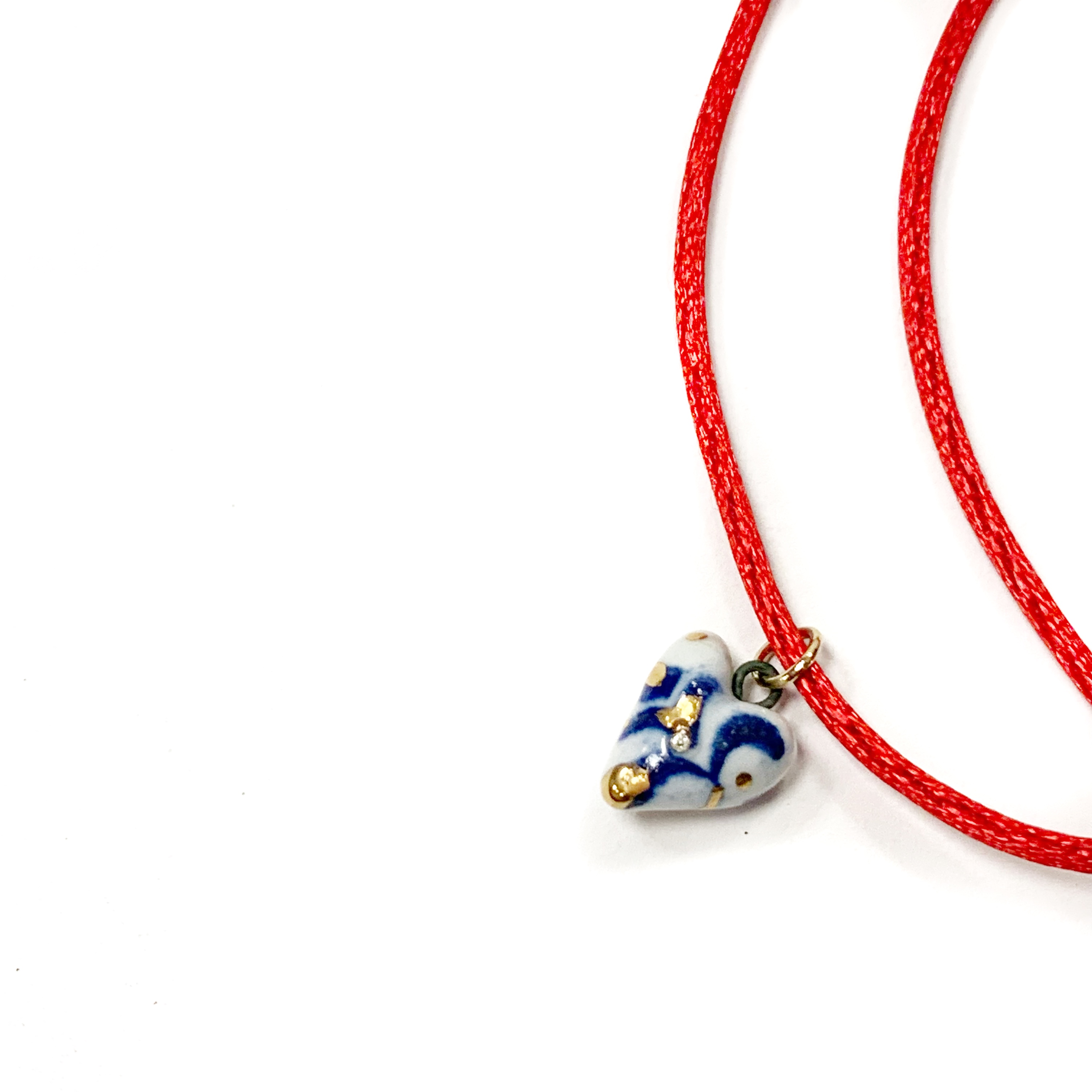 Žavus balto porceliano pakabukas, dekoruotas mėlynais ir auksiniais raštais bei svarovski akutėmis ant raudonos virvelės.