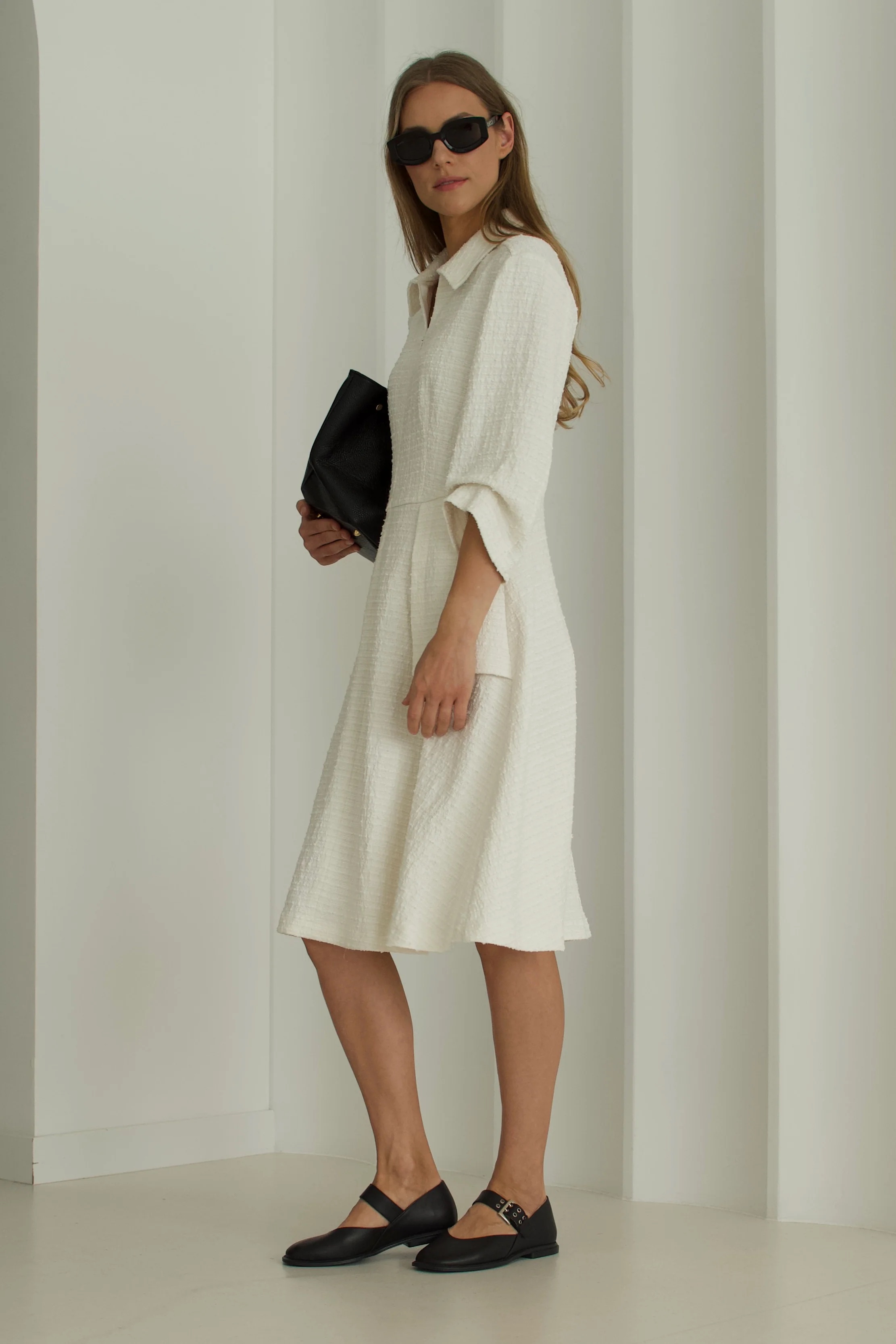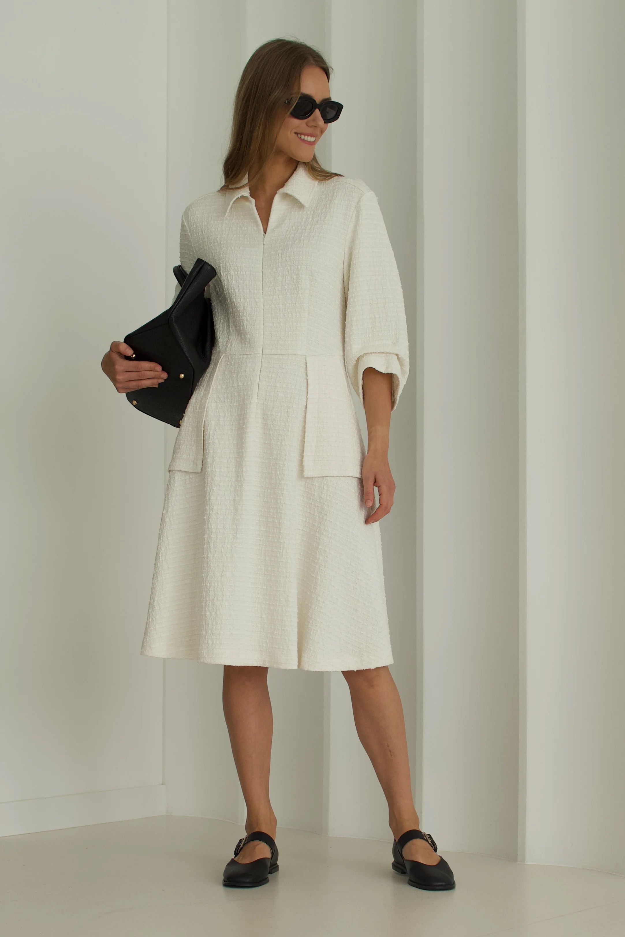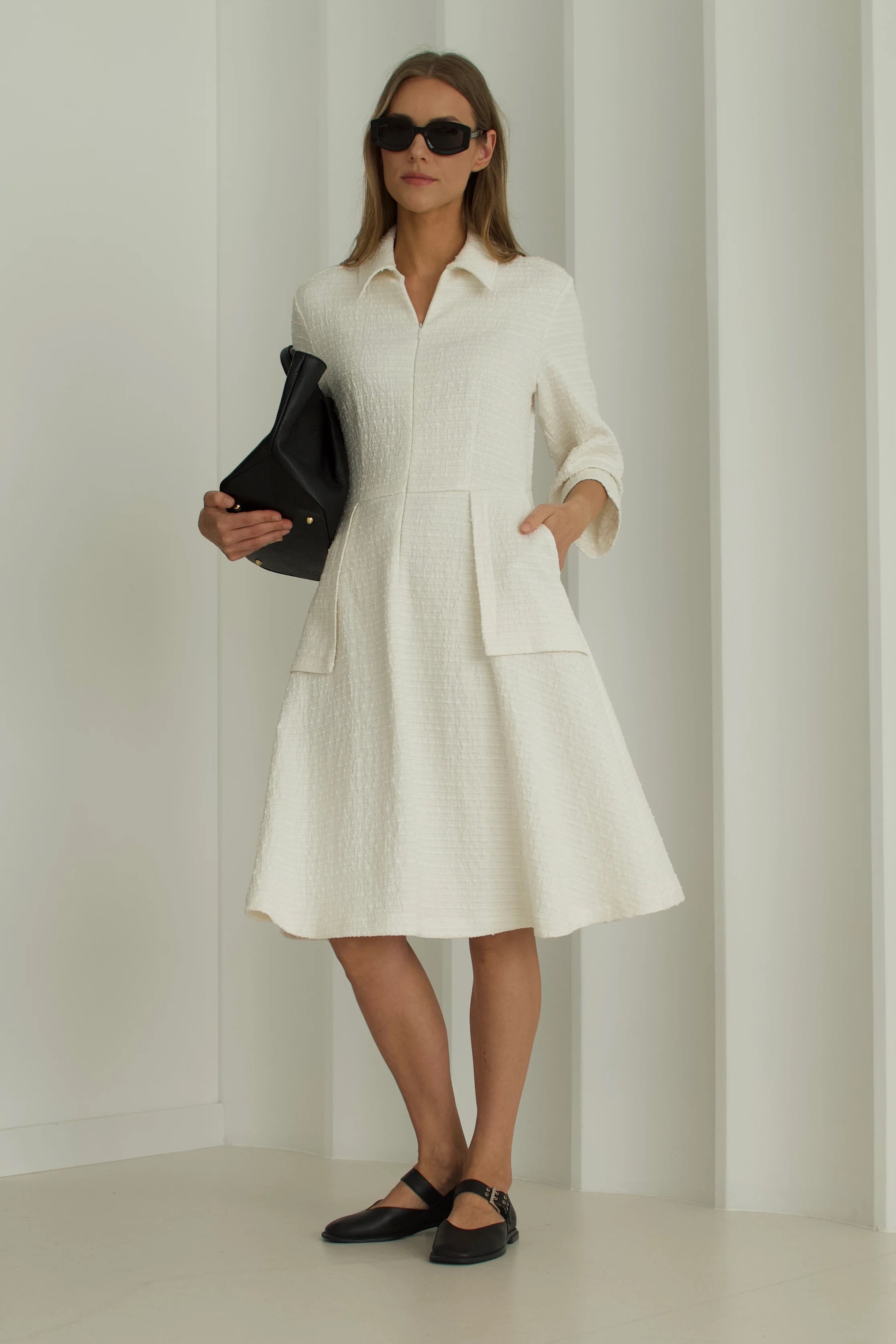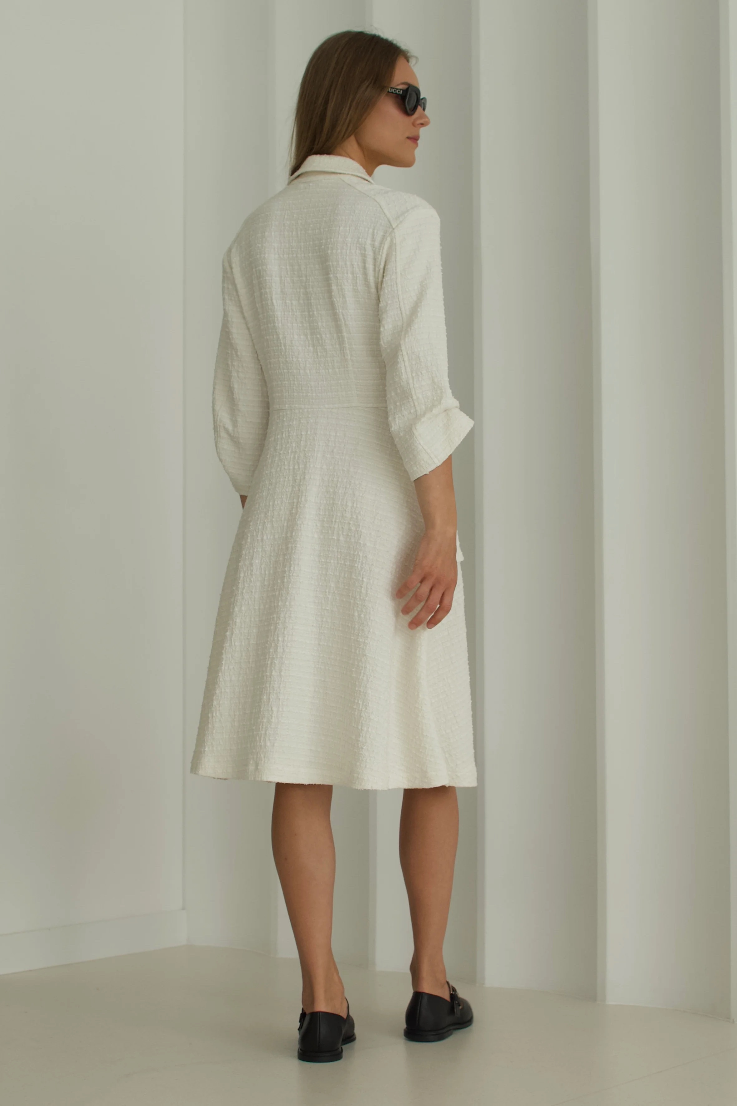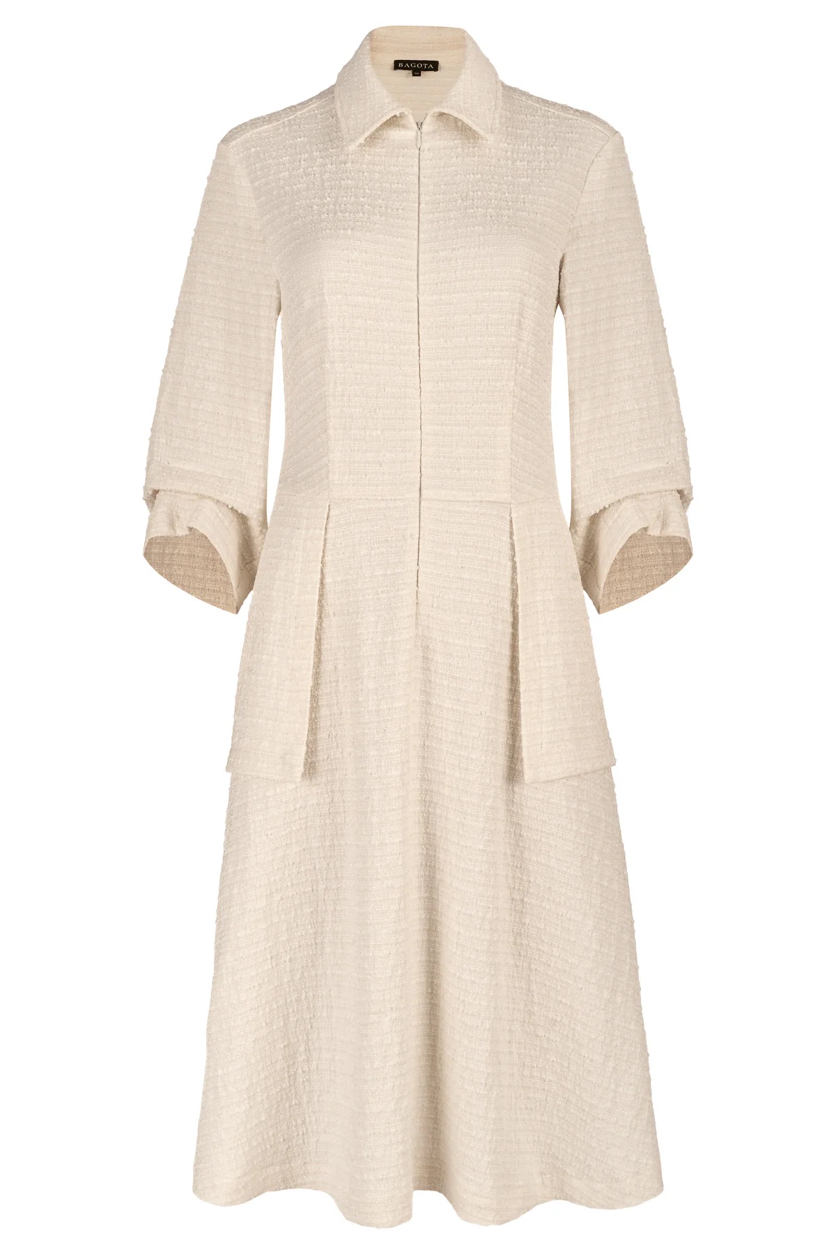Atraskite šiuolaikinę klasiką su šia tvido suknele. Ši šviesi, kreminės spalvos suknelė pasiūta iš aukštos kokybės tekstūruoto tvido audinio, kuris ne tik atrodo stilingai, bet ir suteikia komforto visą dieną.