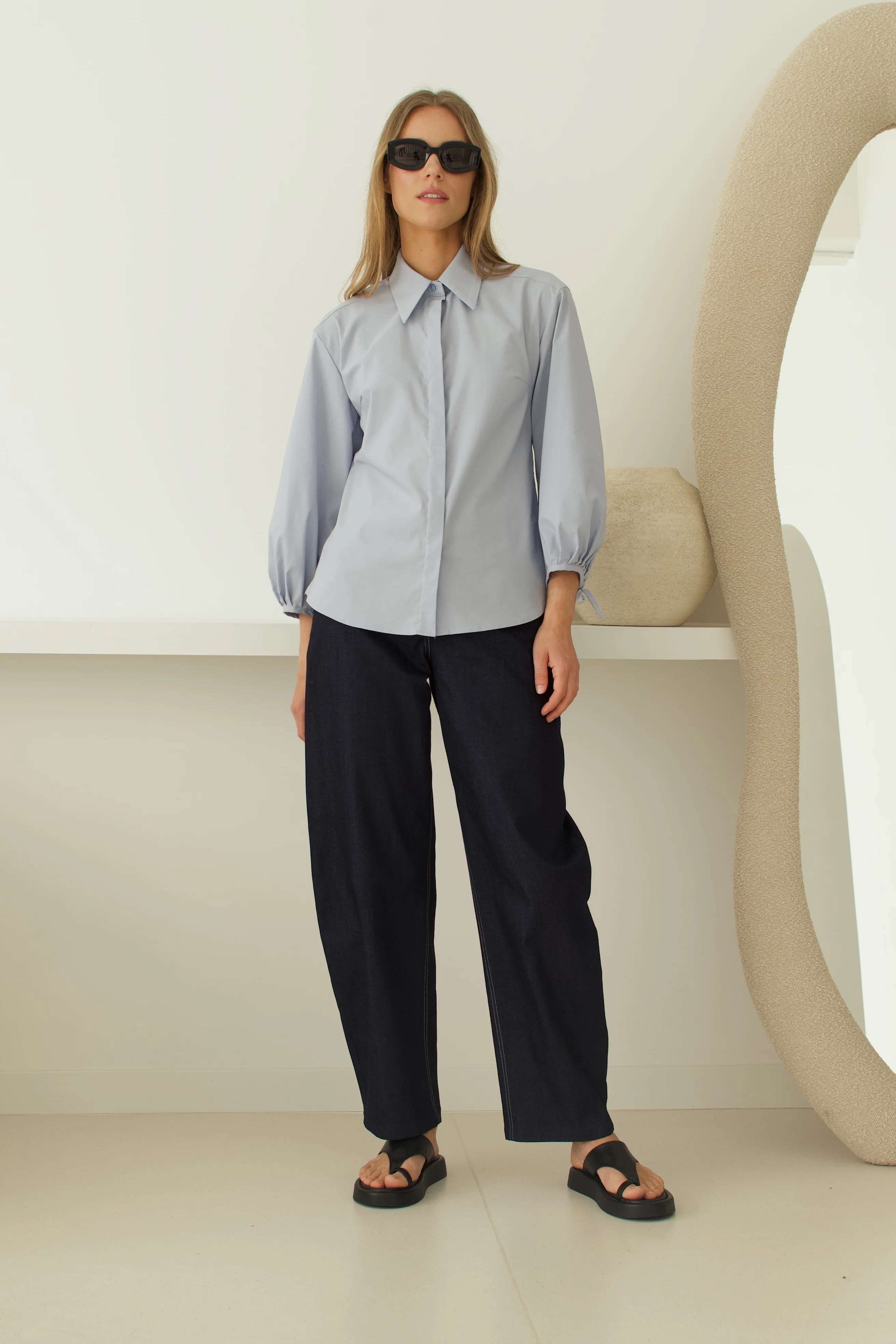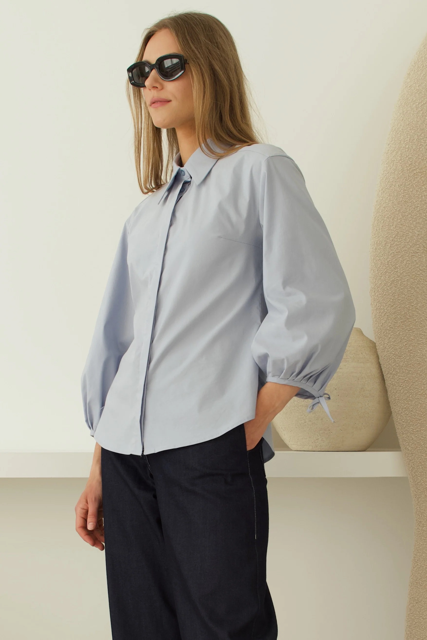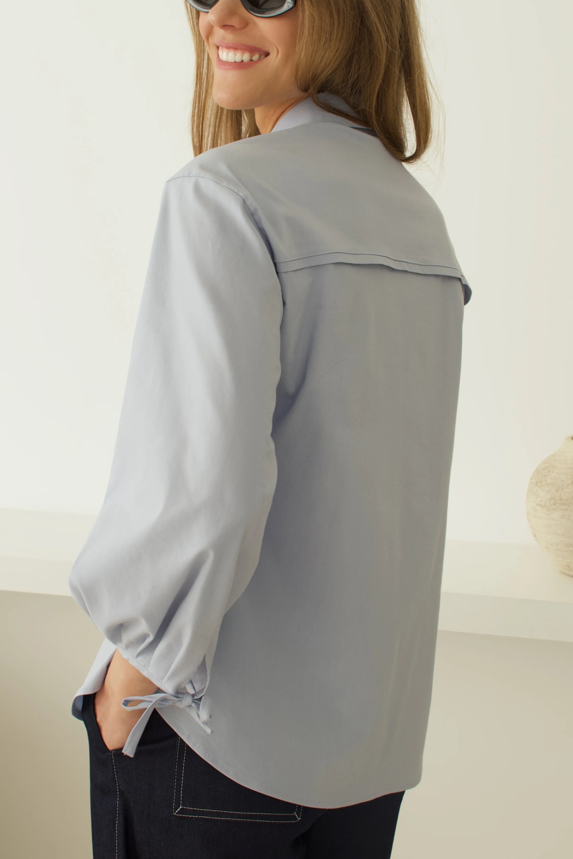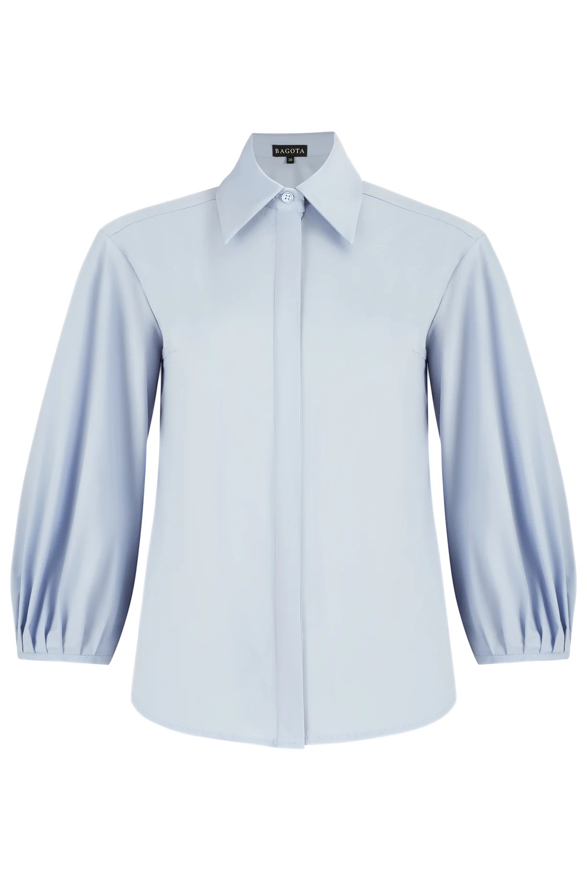 Palaidinė patrumpintomis, gale surauktomis rankovėmis. Įliemenuota, užsisega sagomis.