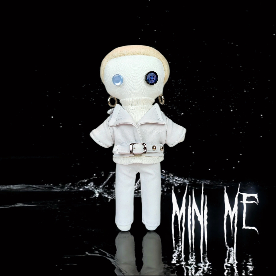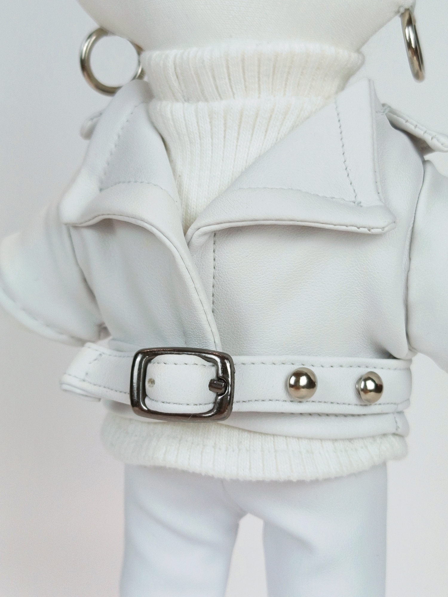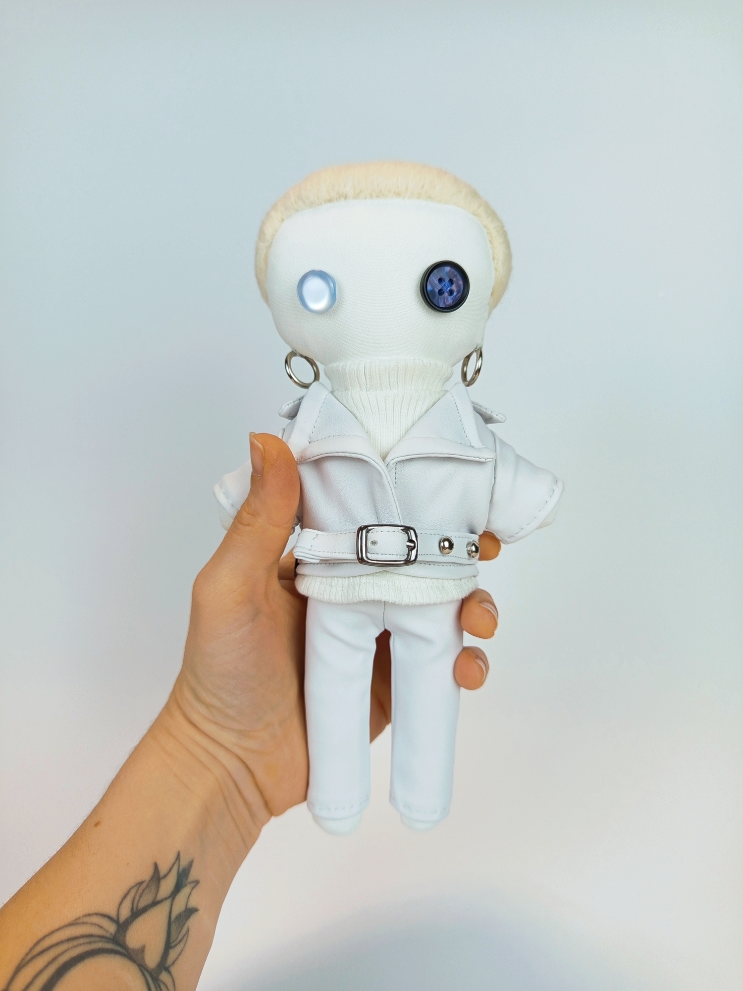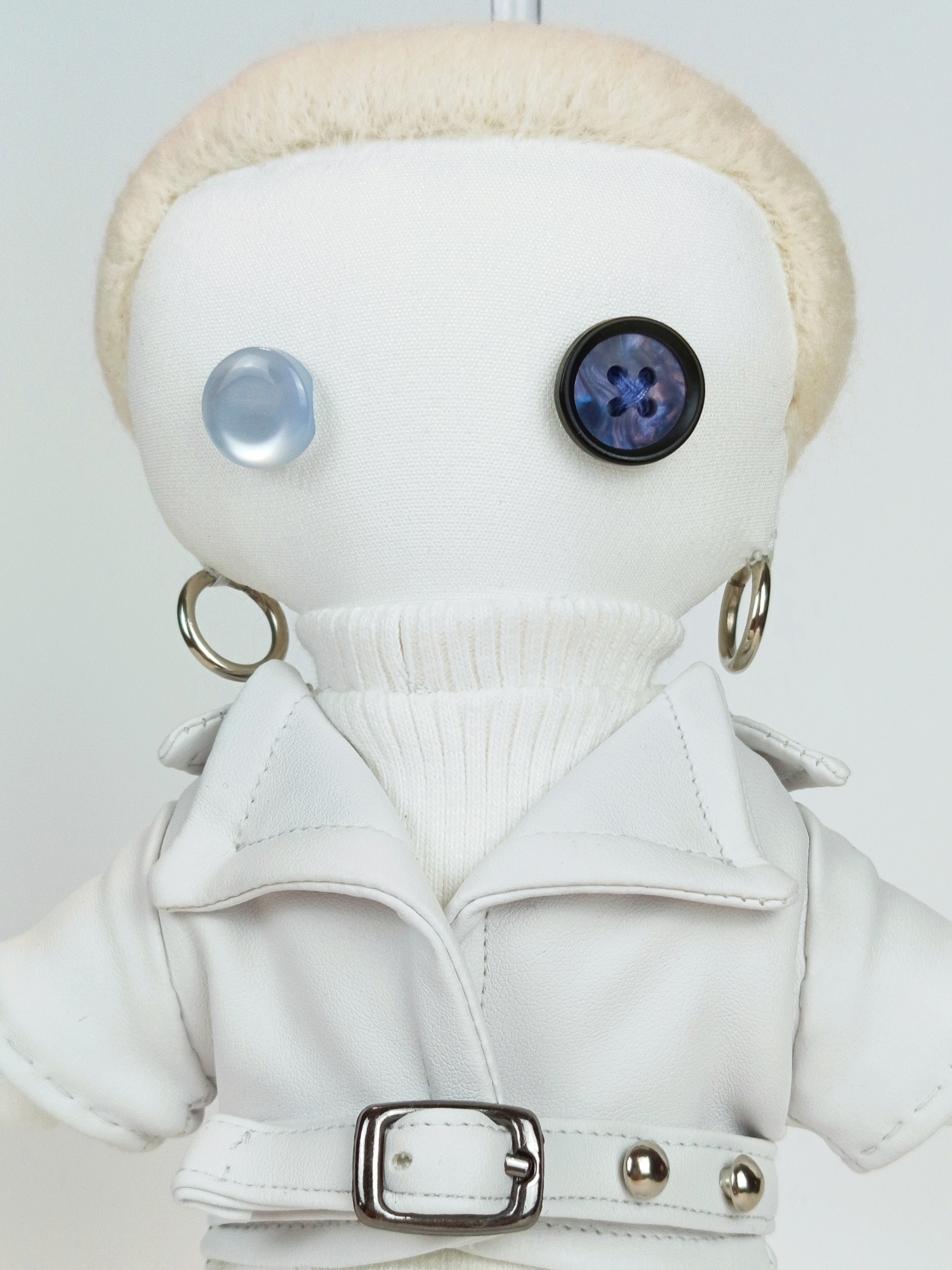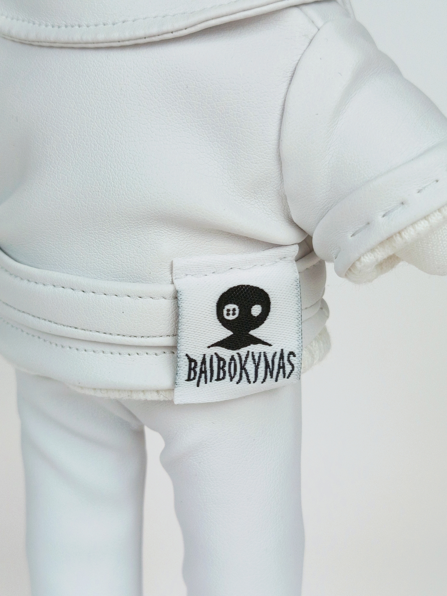 Medžiagos: „Marchiano“ audinys, PES kamšalas, dirbtinė oda, „Ribb“ trikotažas, plastikinės sagos, merino vilna, metaliniai aksesuarai. Pagaminta Lietuvoje, autorinis kūrinys. Nerekomenduojama žaisti vaikams – tai meninė lėlė skirta kolekcionavimui, su kuria reikia elgtis atsargiai.