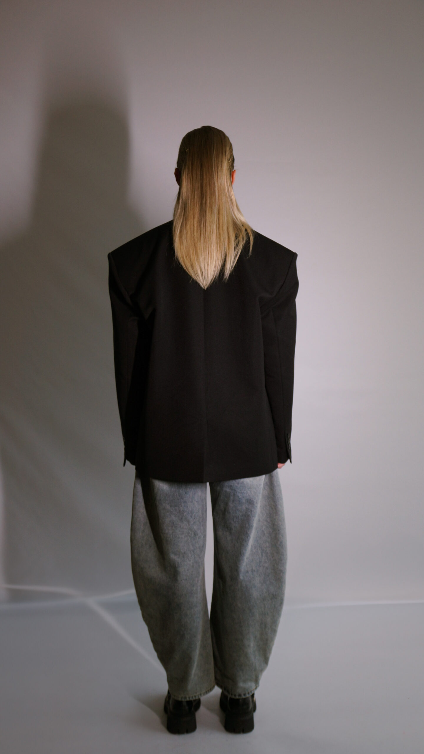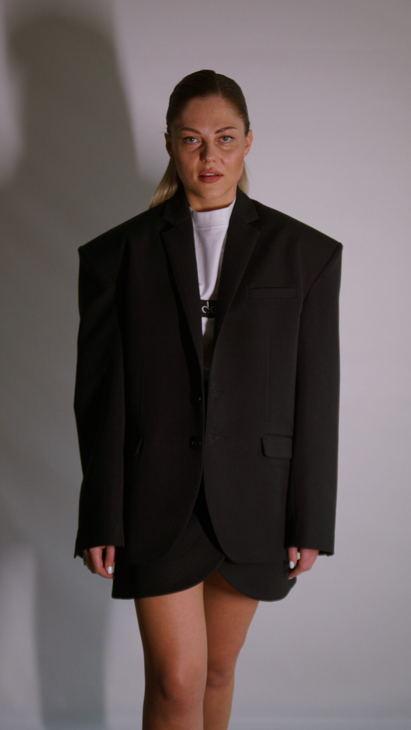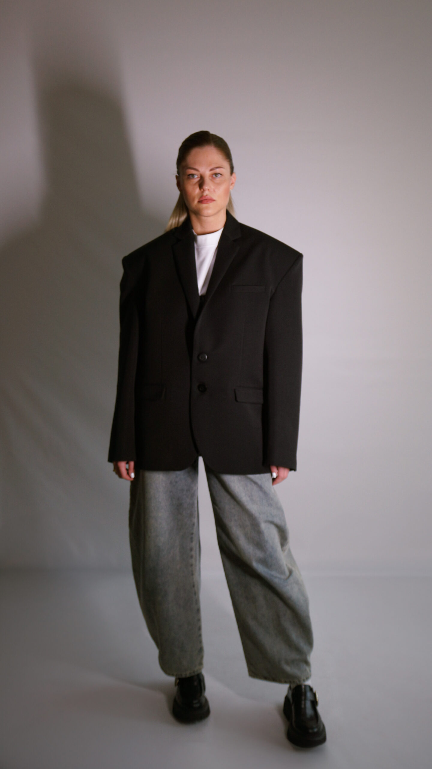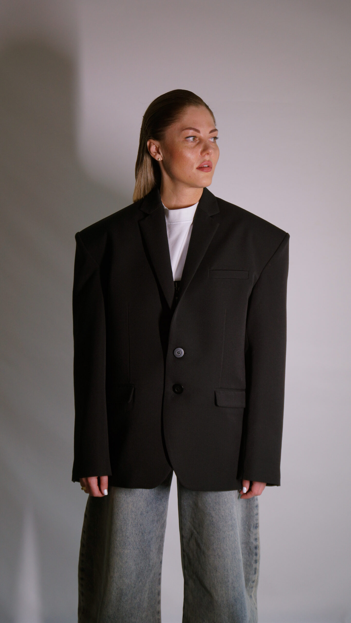 Stipriai padidintais pečiais, oversize tipo, ilgesnėmis rankovėmis, tinkantis tiek vyrams tiek moterims.