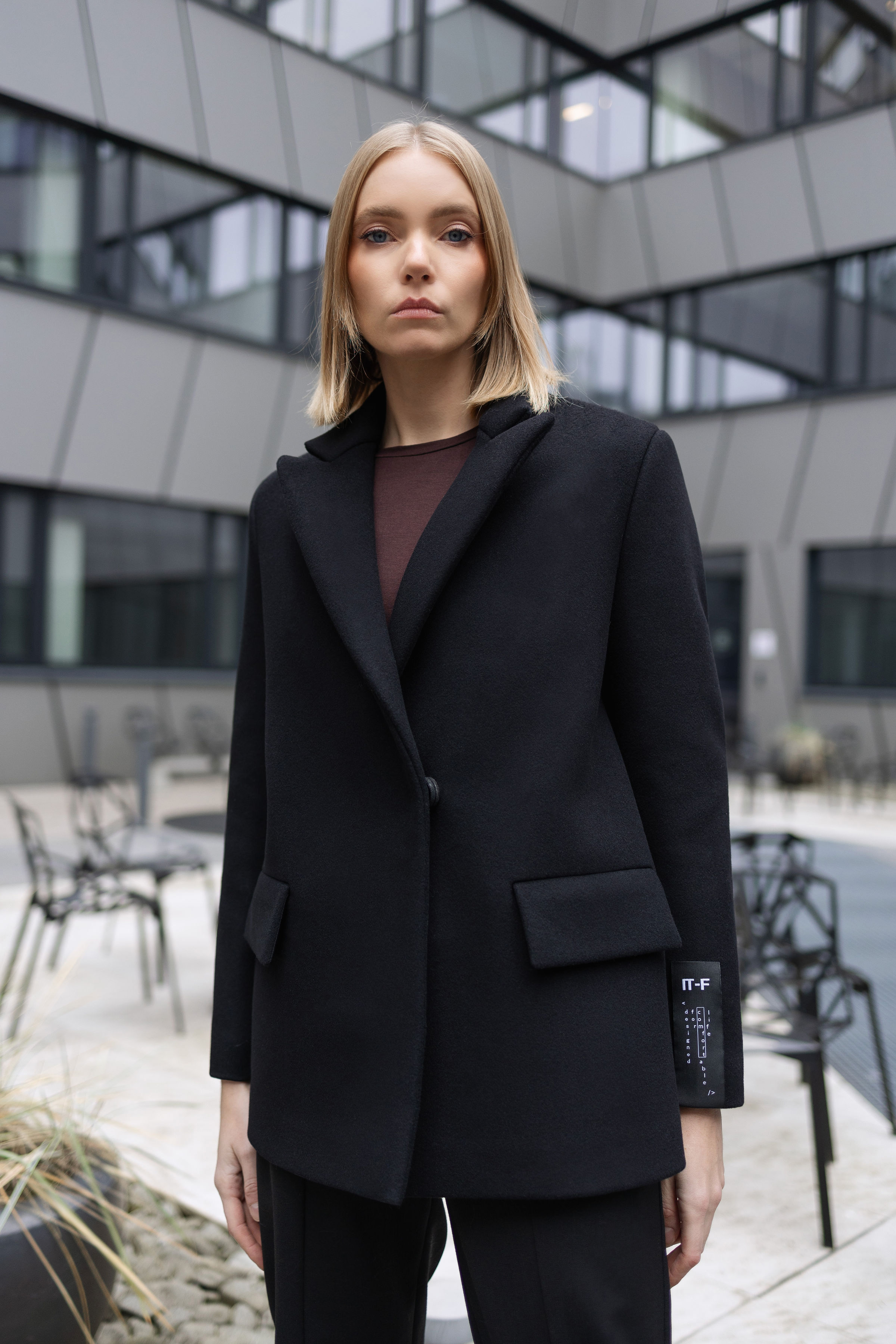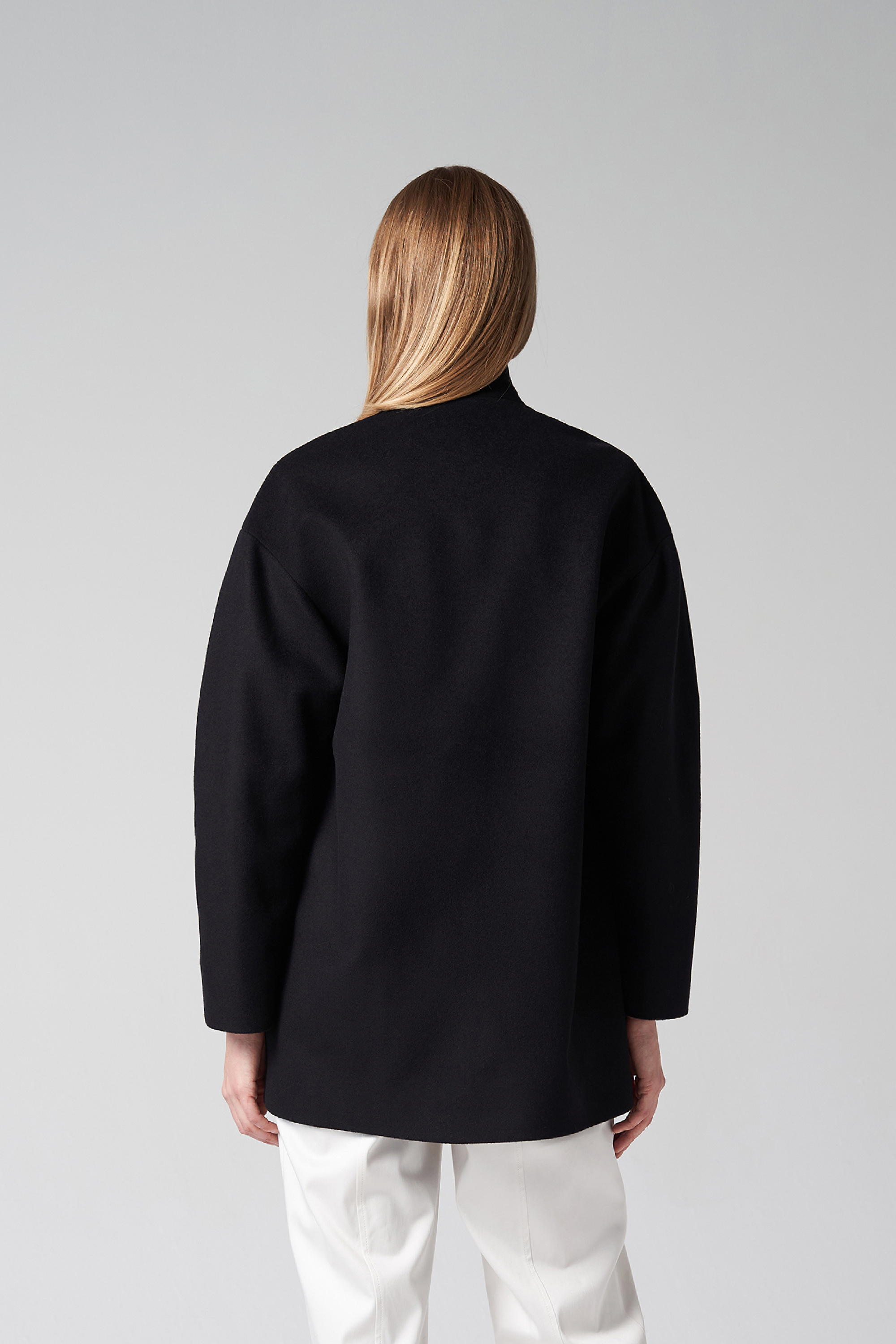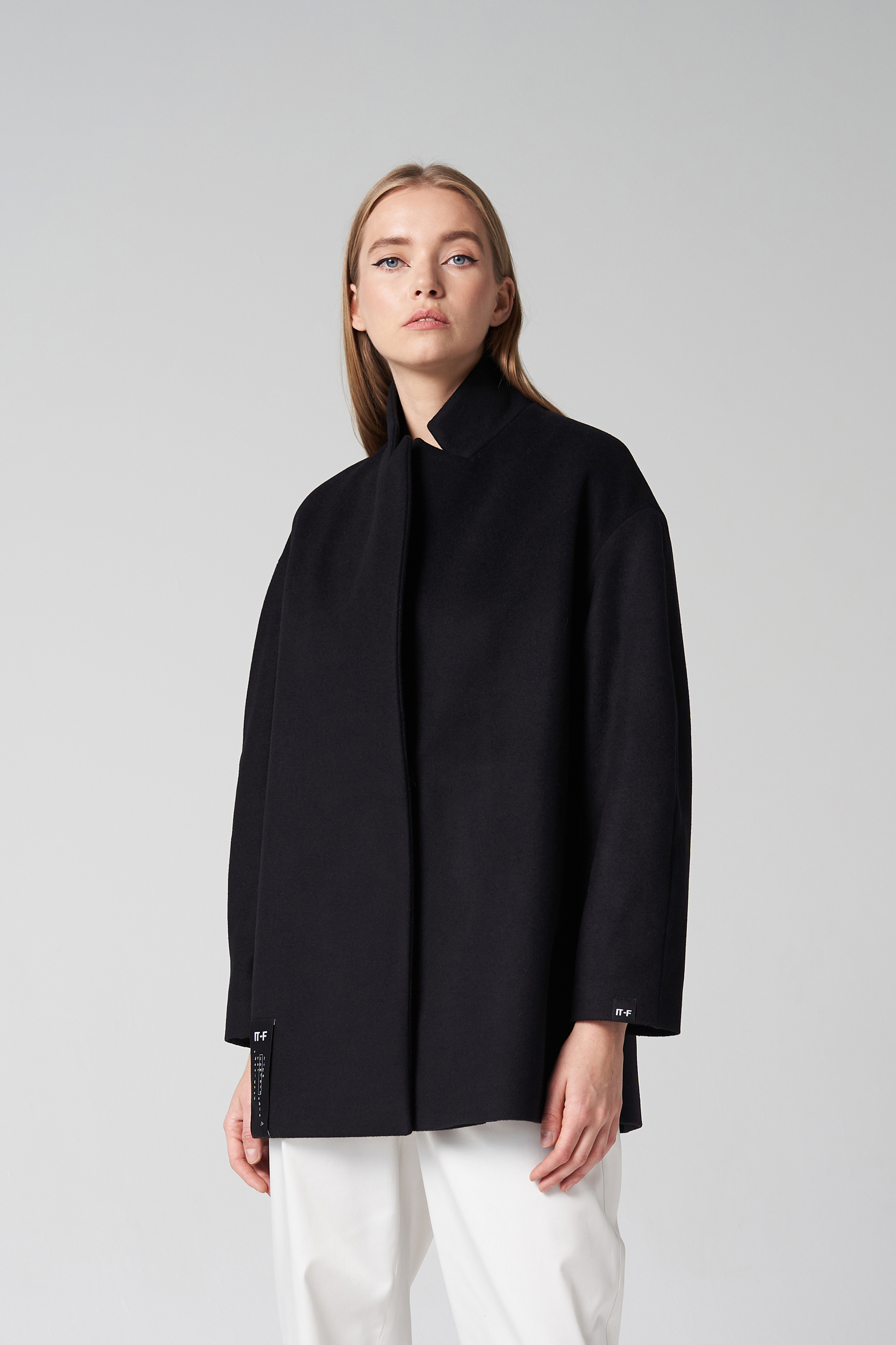 Laisvo kirpimo puspaltis su nuleista pečių linija iš vilnonio audinio su pamušalu. Paltas užsegamas 1 spaude, šonuose yra kišenės, rankovės patrumpintos.