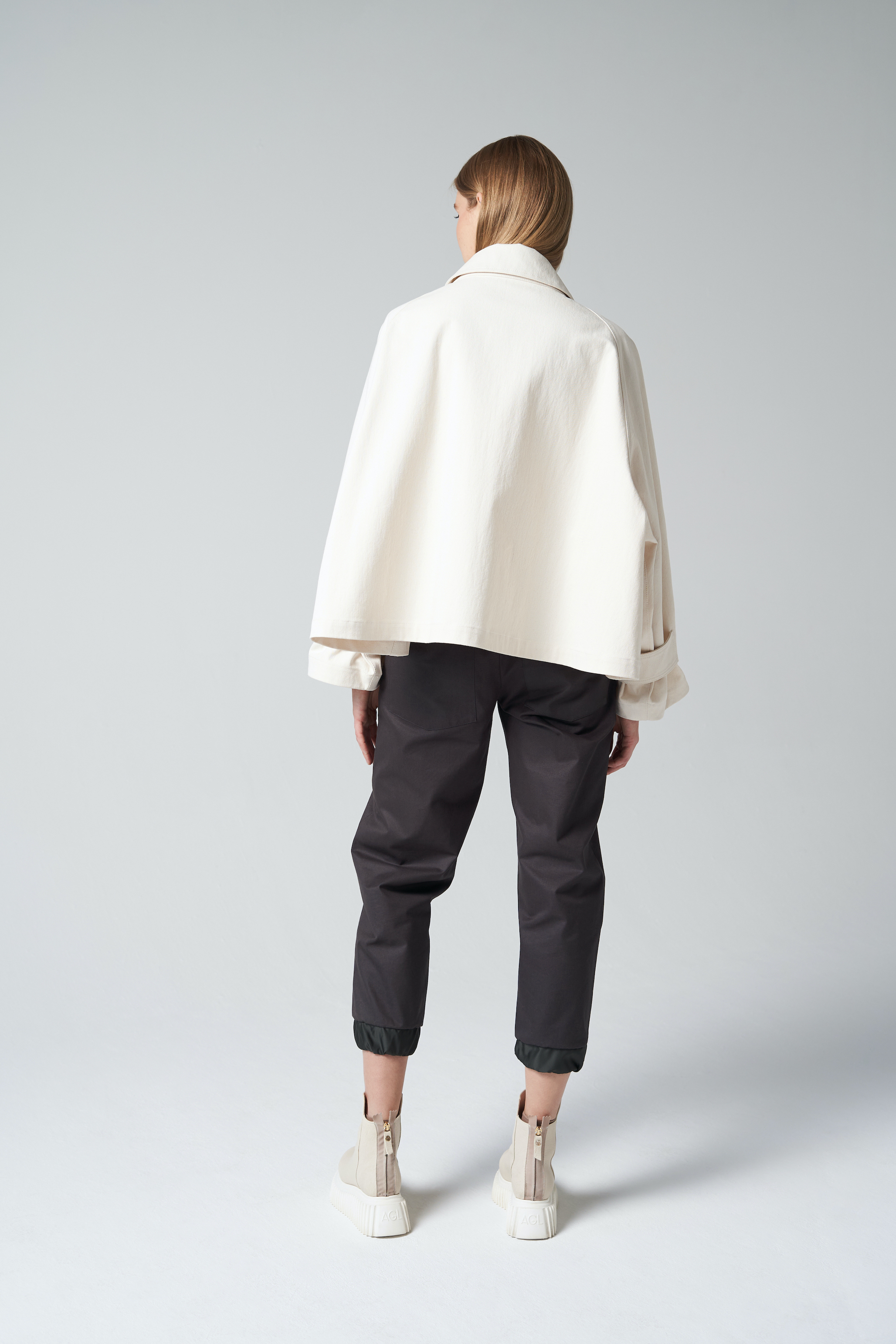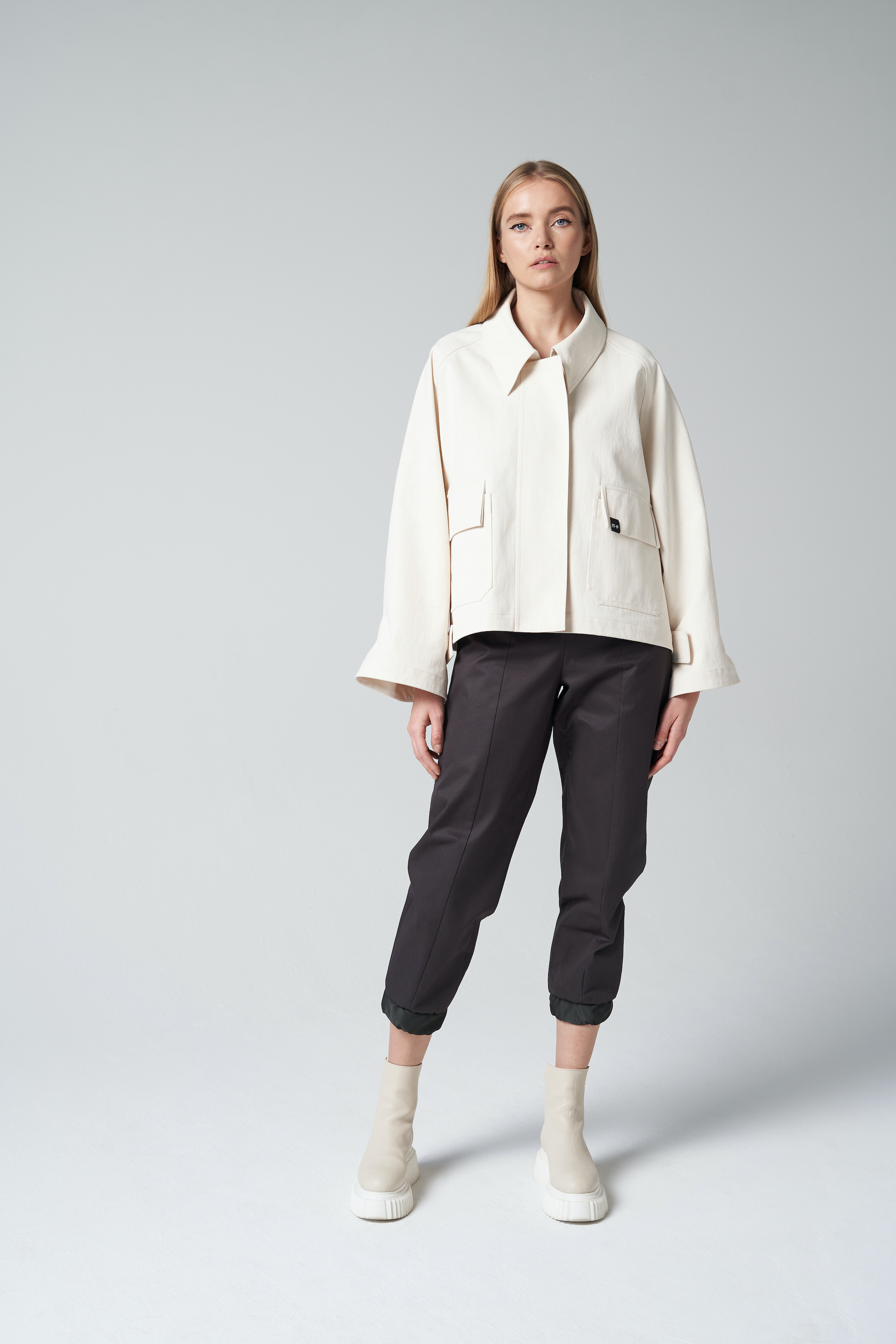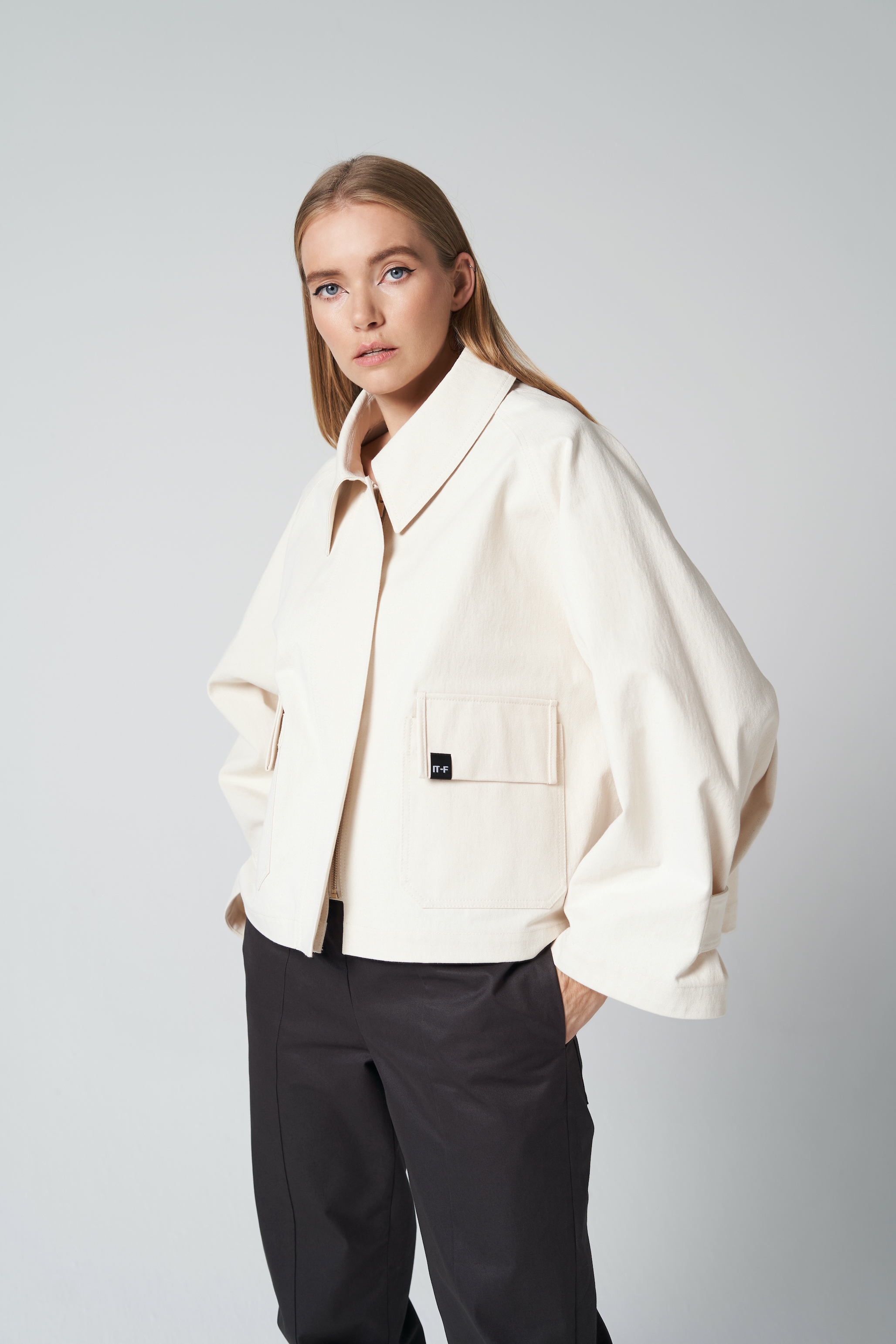 Platėjančio silueto striukė su klasikinio stiliaus apykakle ir ilgomis rankovėmis. Rankovių plotis reguliuojamas juostelėmis su kontaktine juosta. Priekyje – patogus užtrauktukas. Universalus pasirinkimas kasdieniam dėvėjimui.