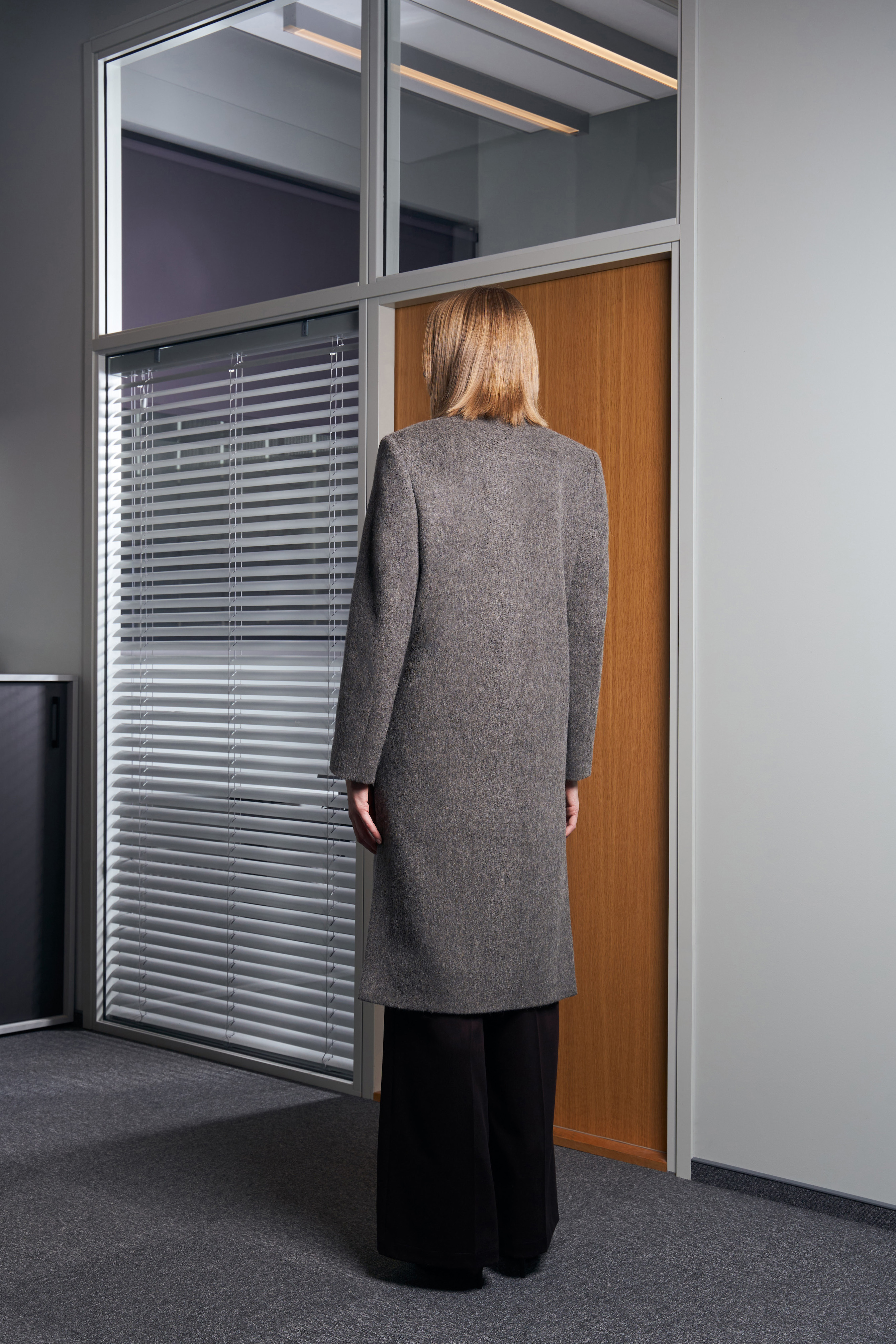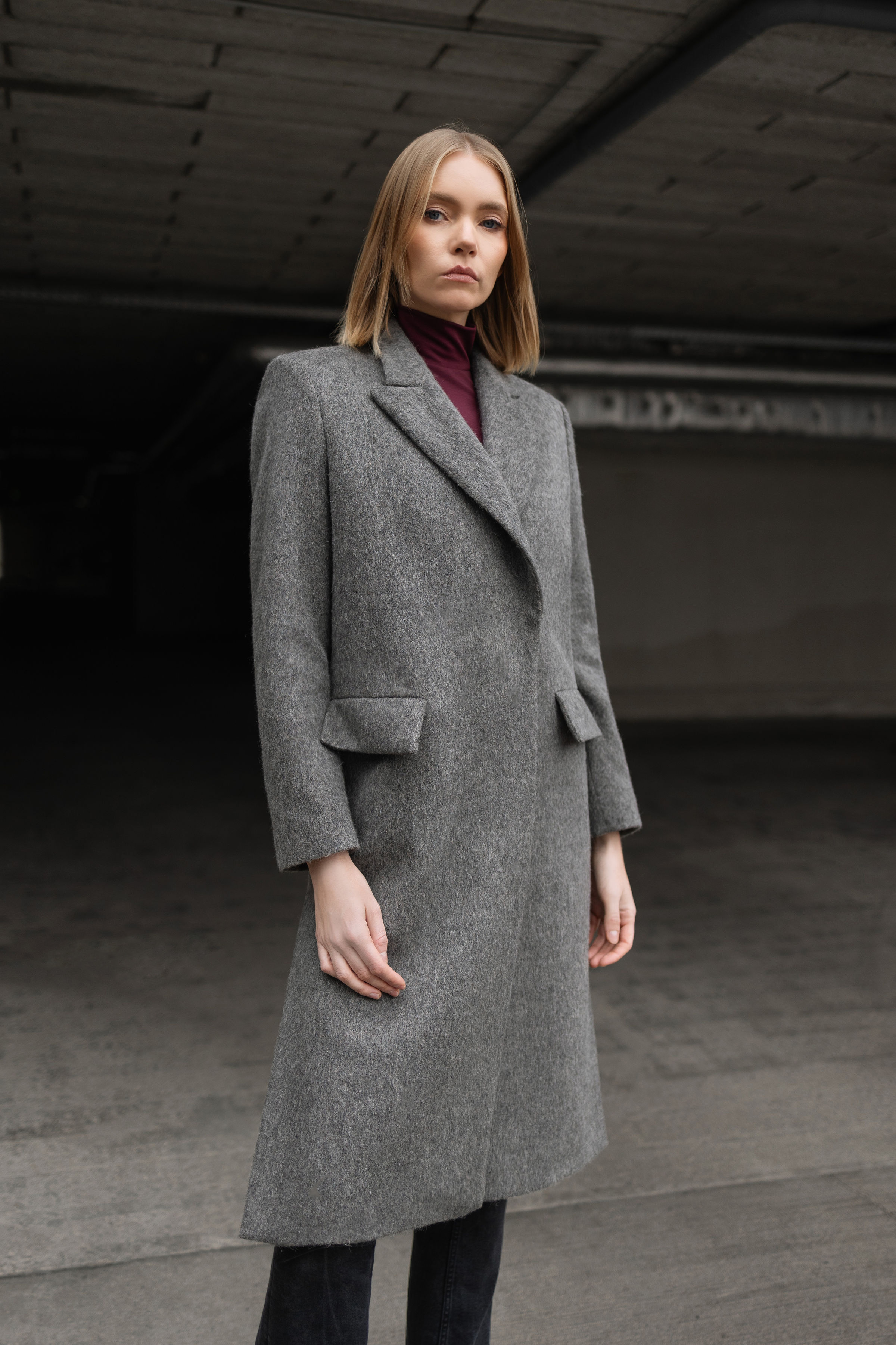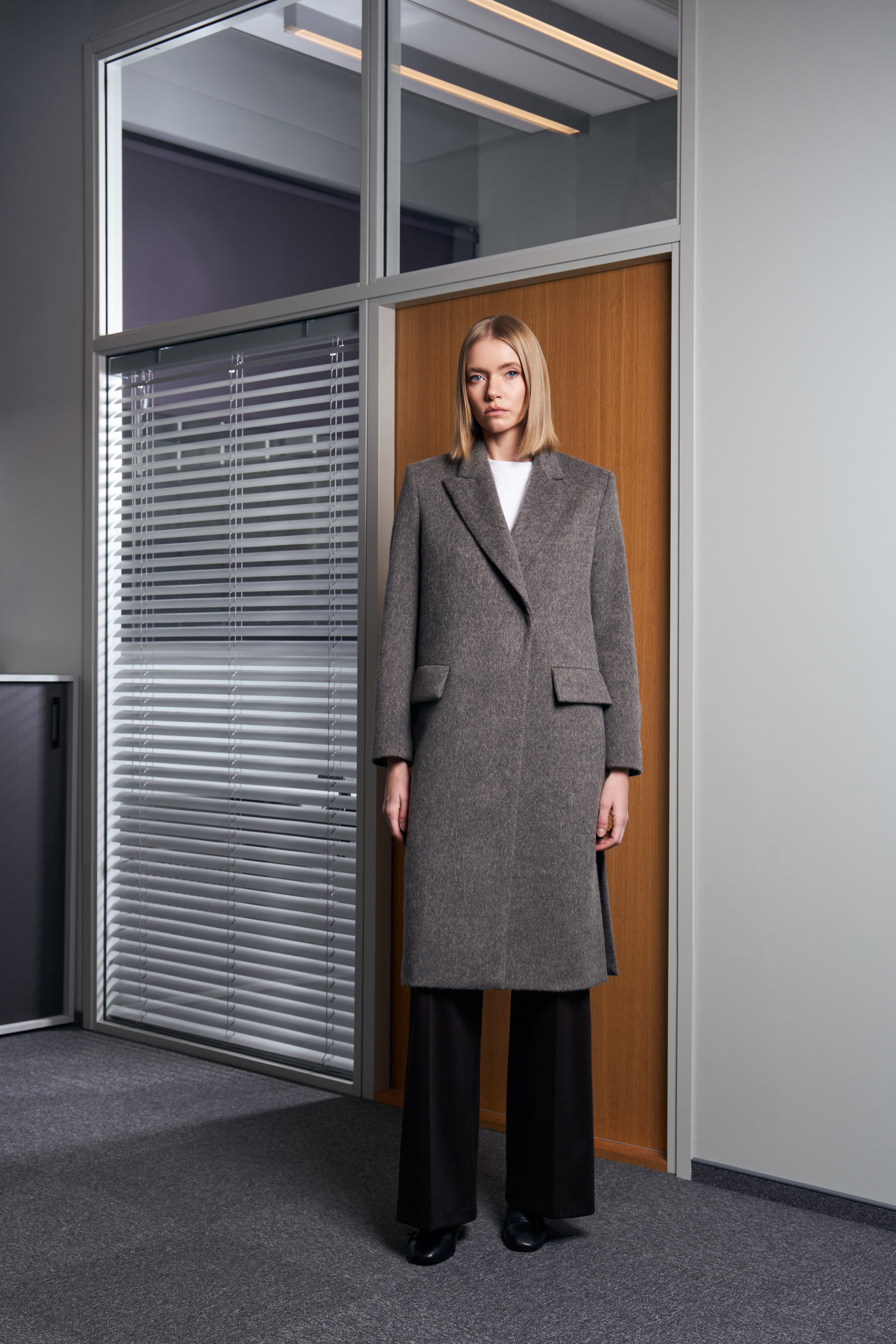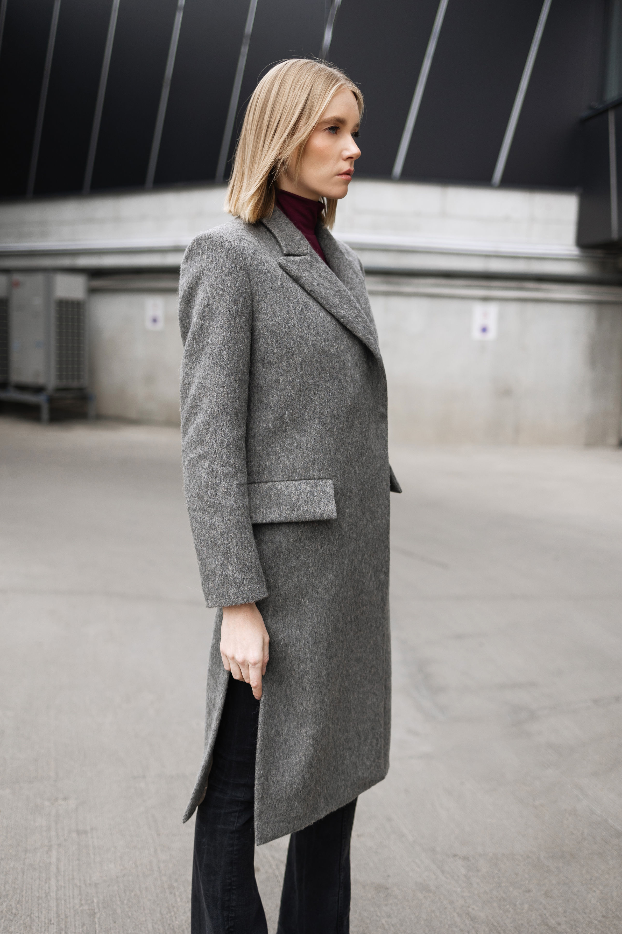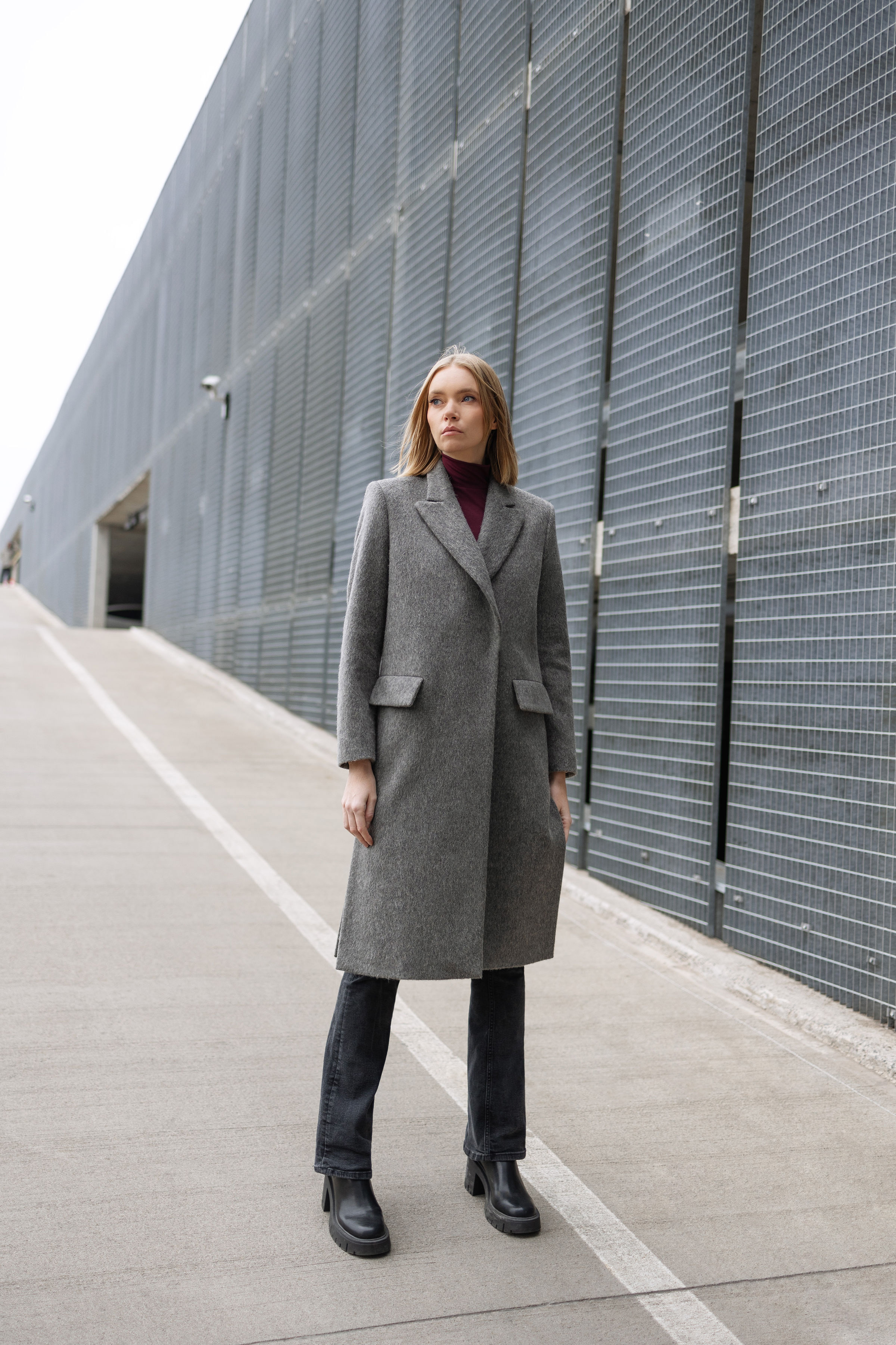 Paltas iš vilnonio audinio su pamušalu. Paltas užsegamas spaudėmis, priekyje yra kišenės su antkišeniais.