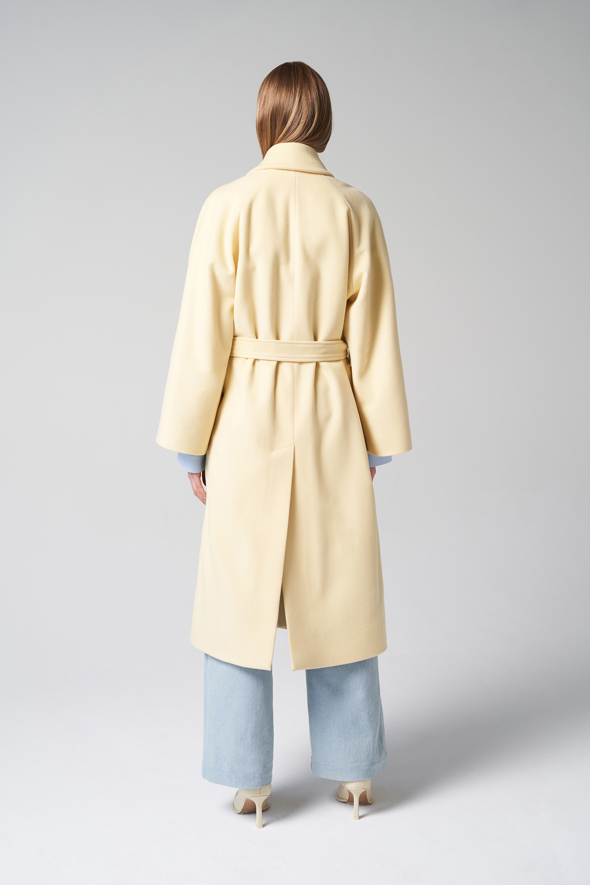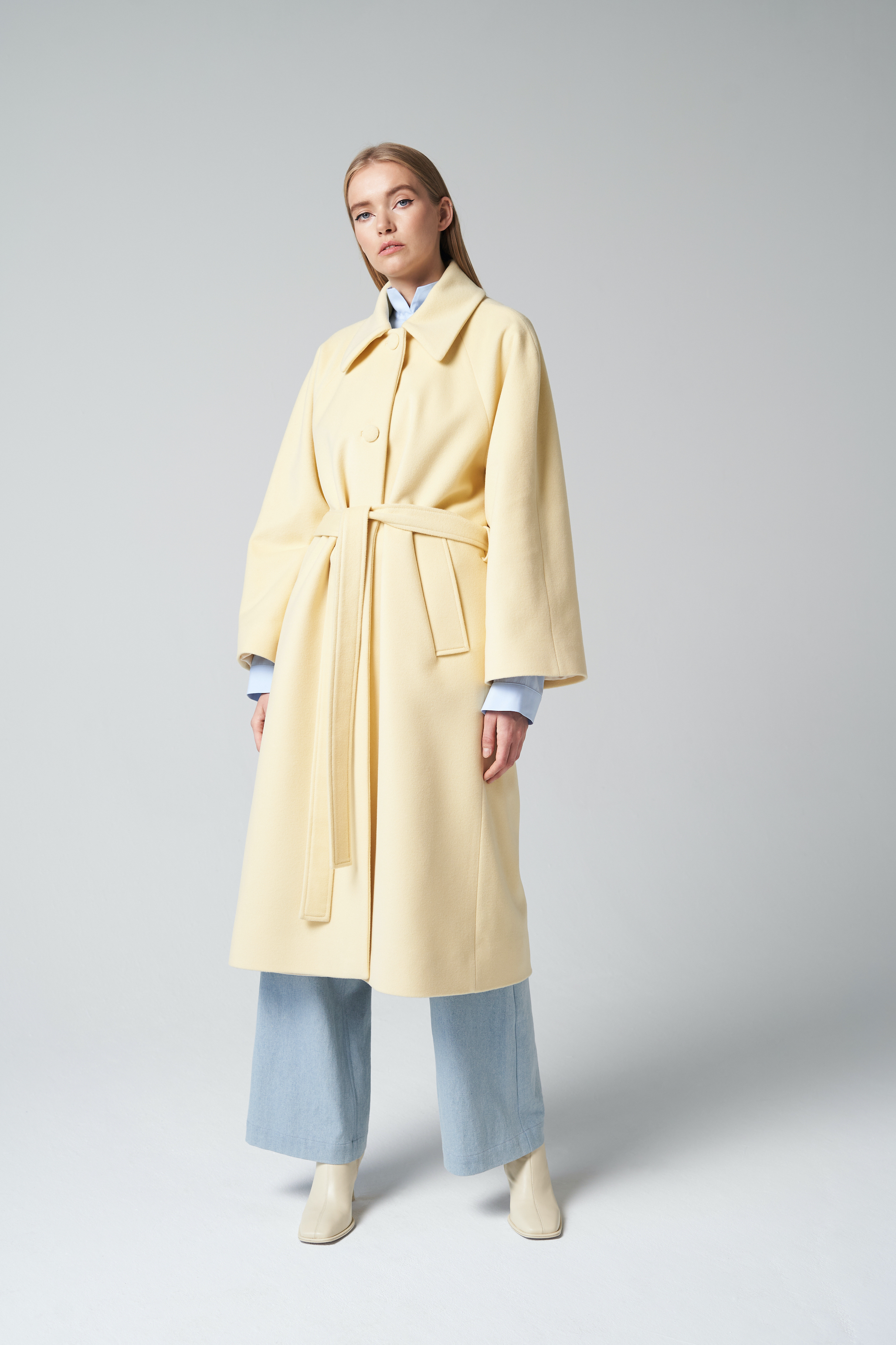 Ilgas vilnos ir kašmyro paltas su klasikine apykakle. Priekyje – patogios kišenės, paltas užsegamas sagomis ir surišamas to paties audinio diržu. Nugaros apačioje – skeltukas, paltas su pamušalu.