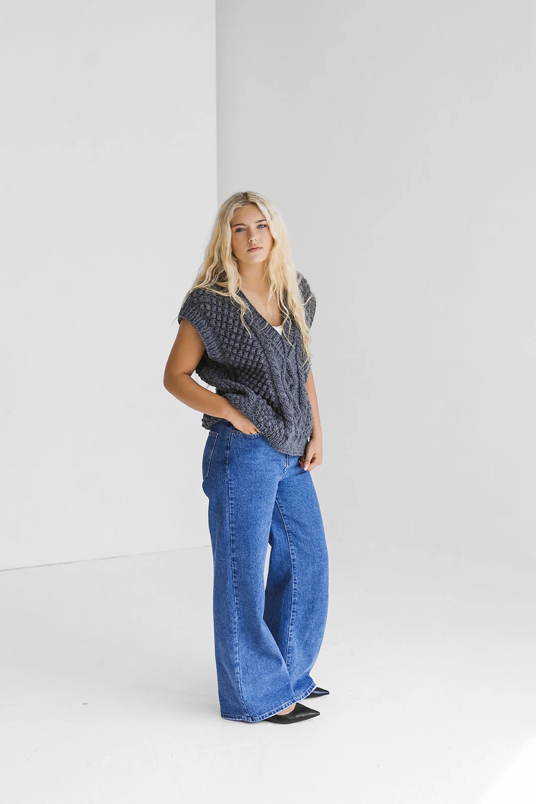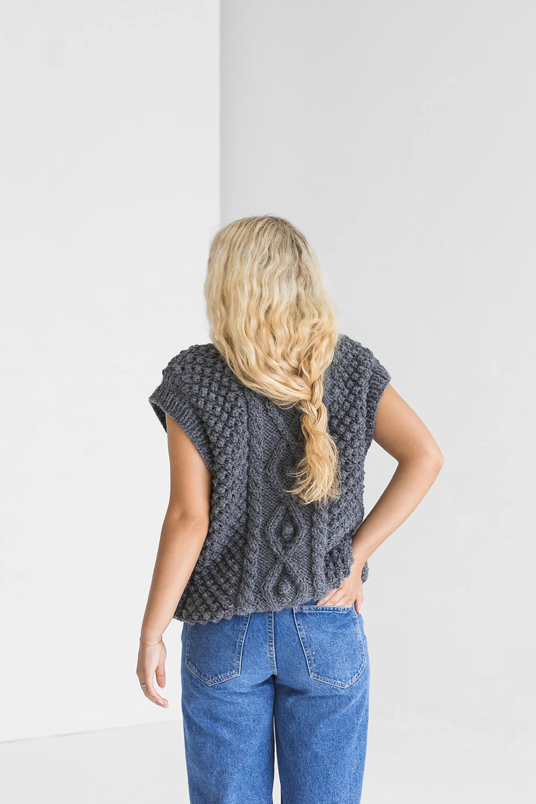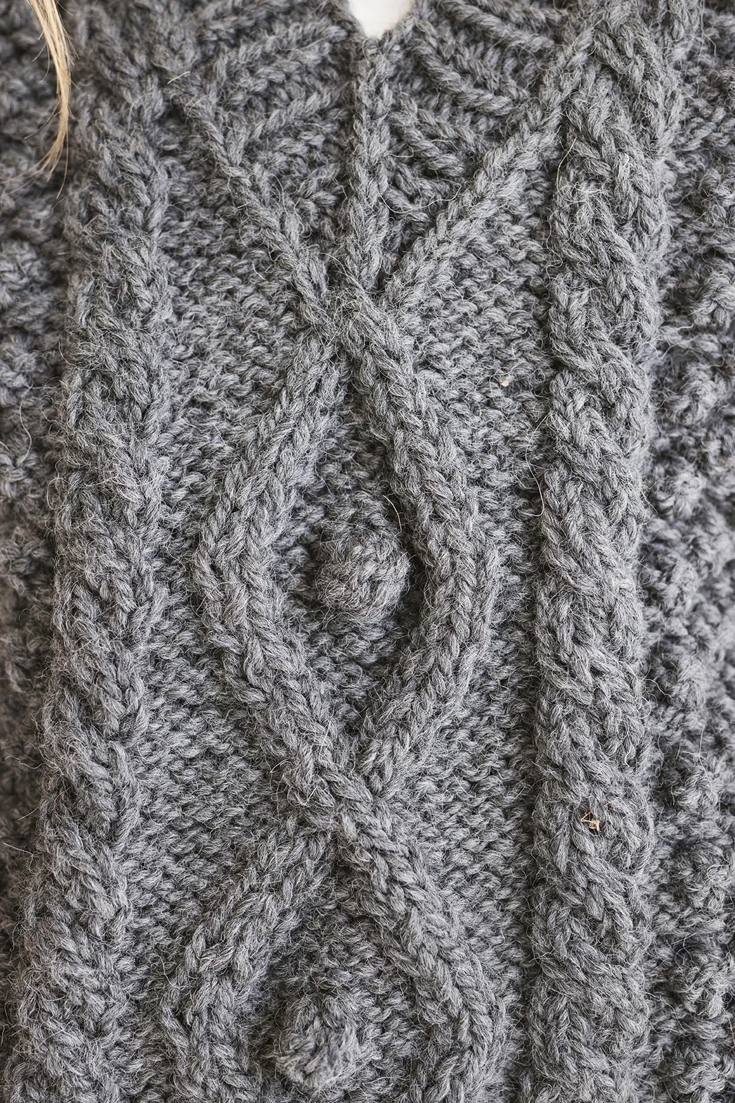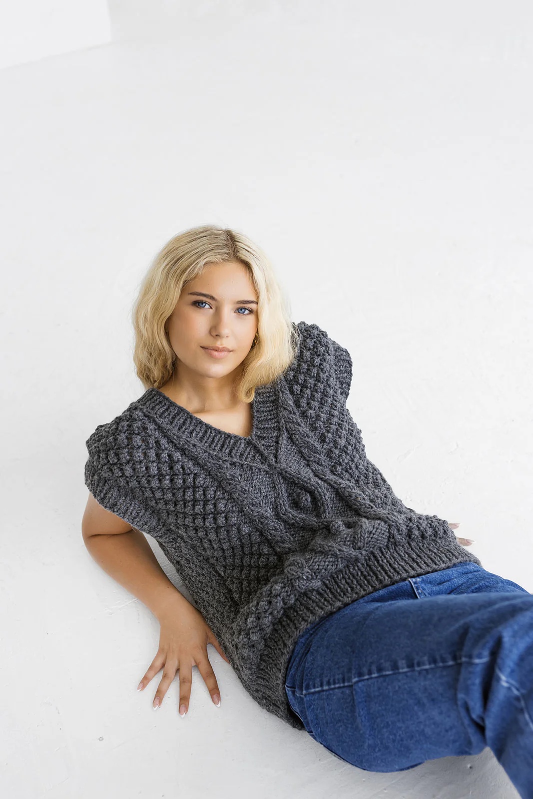 Ši stambaus mezgimo pilkos spalvos alpakos vilnos liemenė – tai stilingas šilumos ir elegancijos derinys. Universali ir laikui nepavaldi, ją galima dėvėti vieną kaip jaukų viršutinį drabužį, derinant su kelnėmis ar sijonais, arba sluoksniuoti ant marškinių ar palaidinių, siekiant rafinuotesnio įvaizdžio. Pagaminta iš prabangios alpakos ir ėriukų vilnos, ši elegantiška liemenė sujungia komfortą ir meistrišką rankų darbą, todėl tampa nepakeičiamu pasirinkimu mados pojūtį turinčioje spintoje.