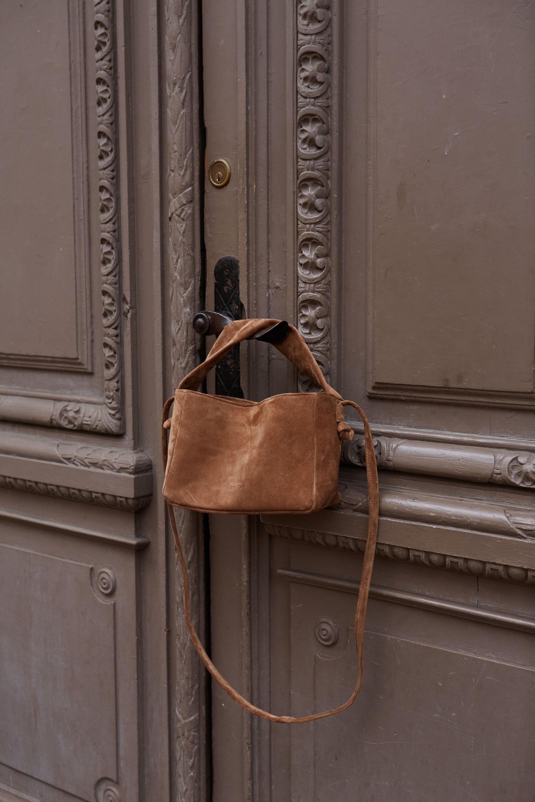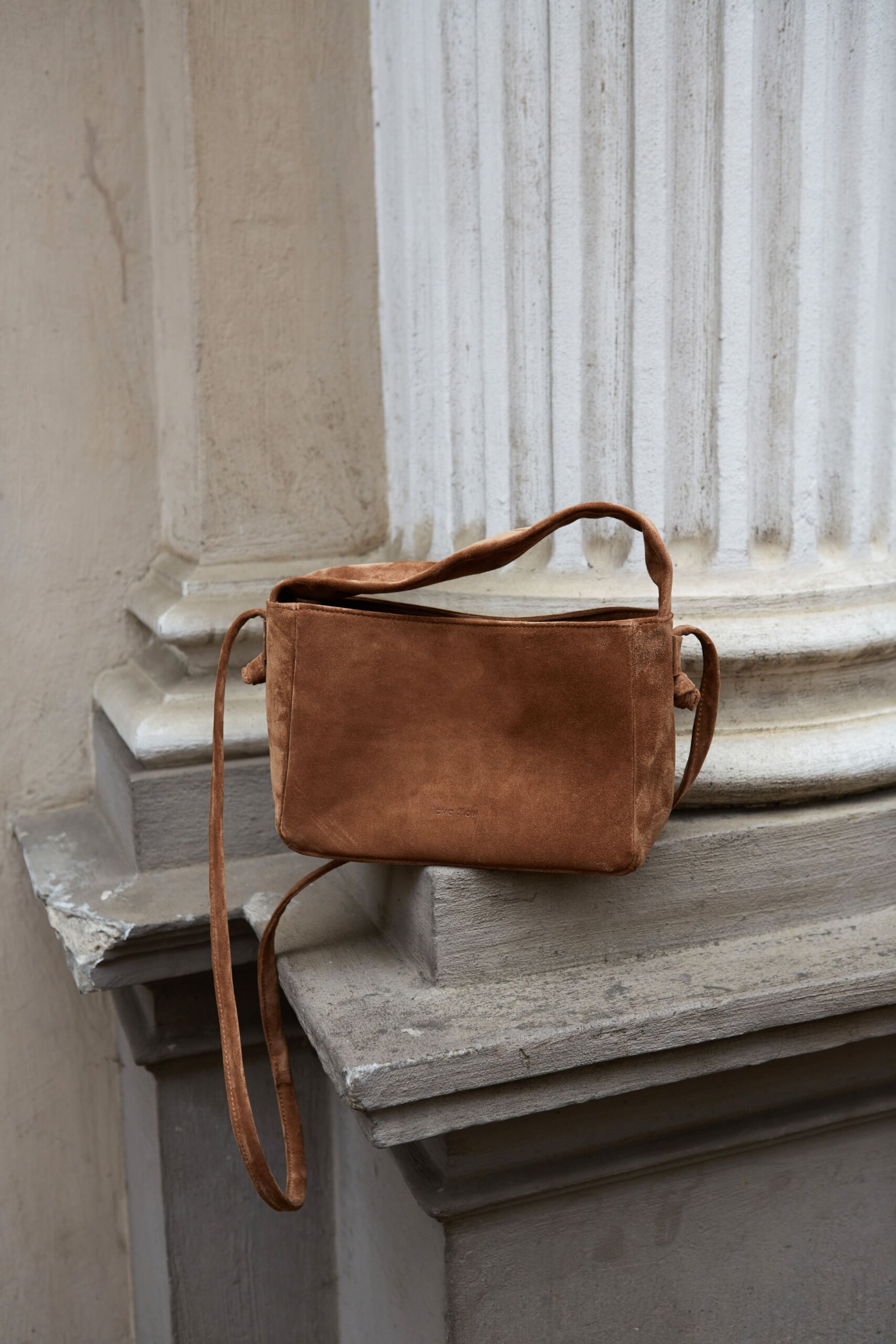 Paprastoji, minimalistinė rankinė Meru. Rankinę galima dėvėti keliais būdais: per petį naudojant ilgąją rankeną arba kaip delninę su trumpaja rankena. Rankinė užsisega magnetuku. Ilgosios rankenos ilgis 122cm. Jį galima reguliuoti mazgelių pagalba.