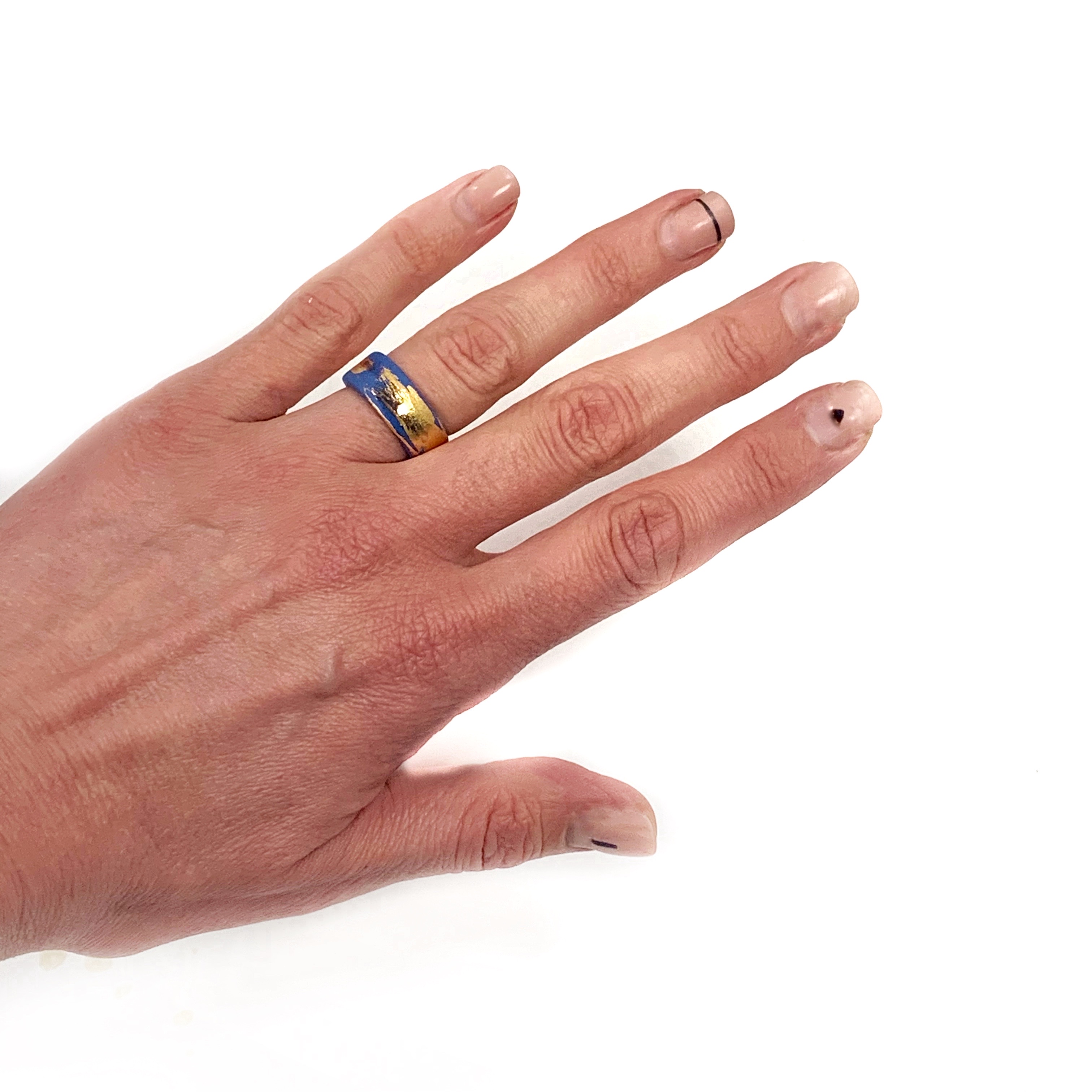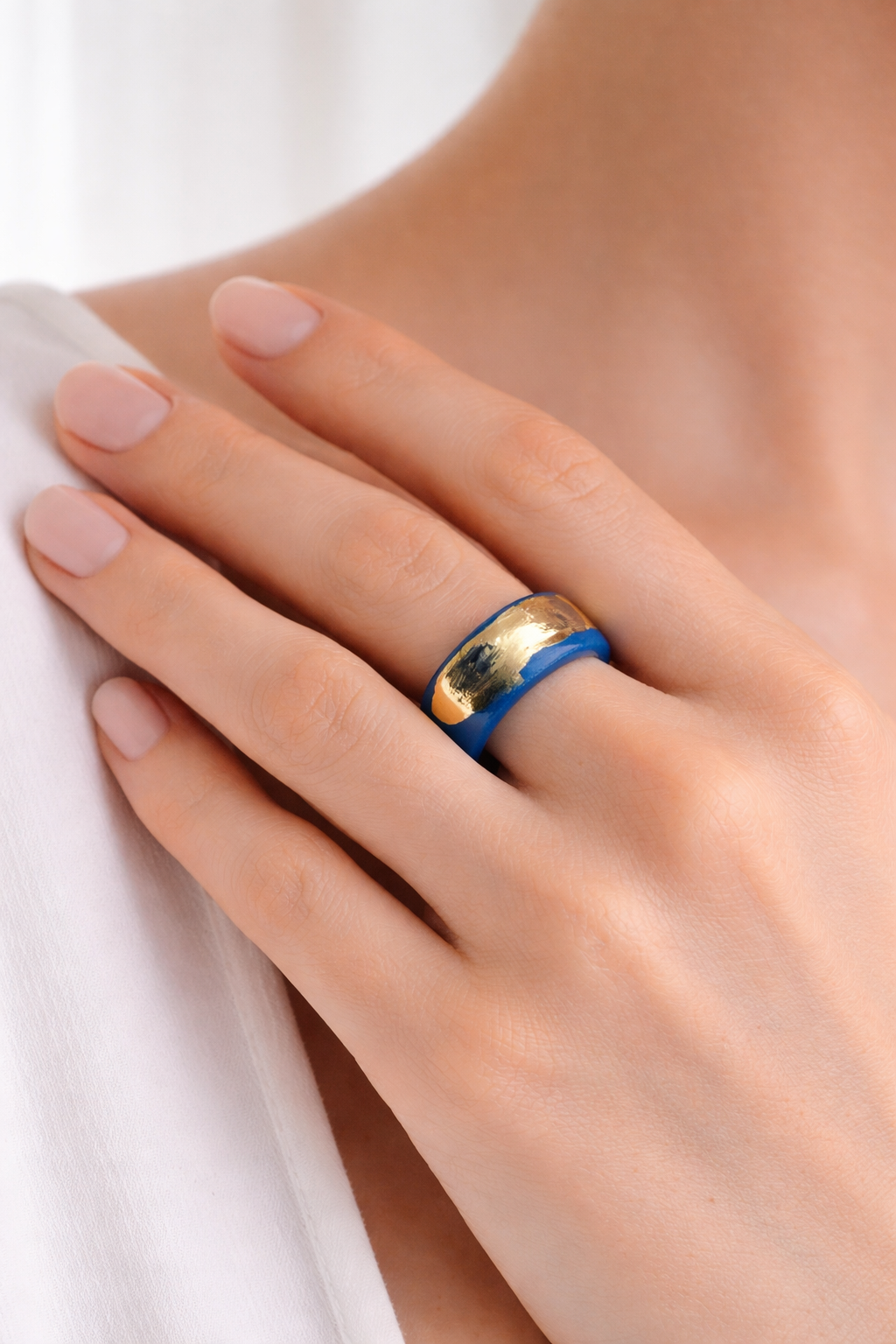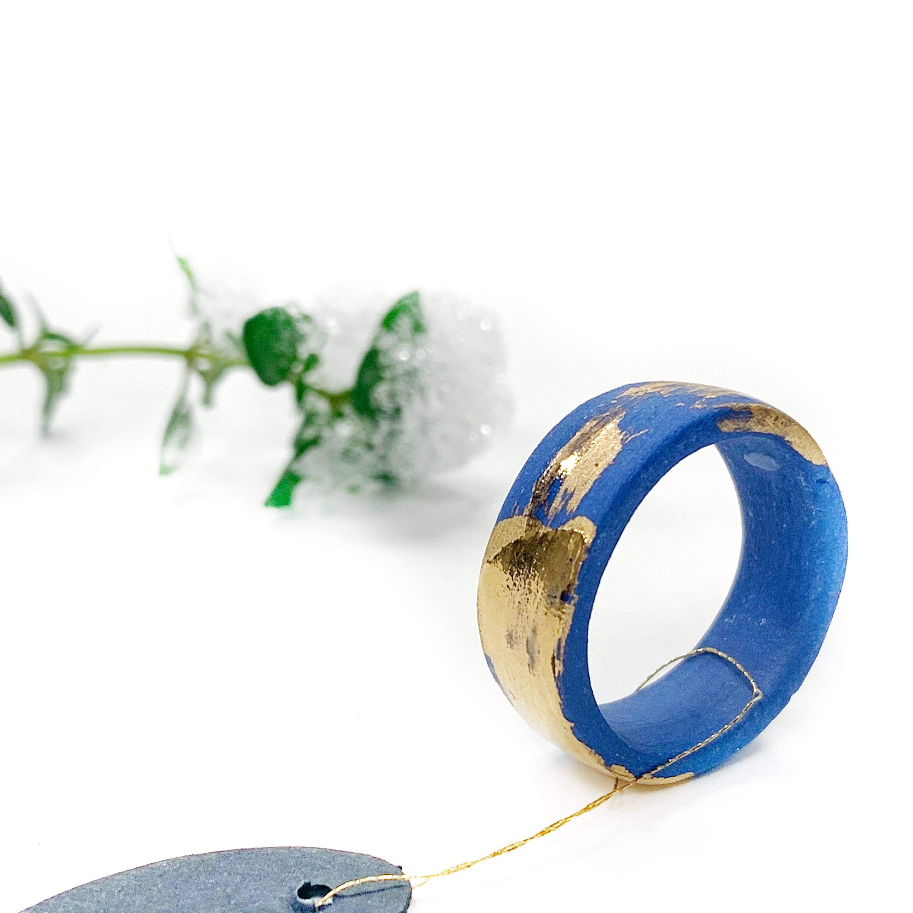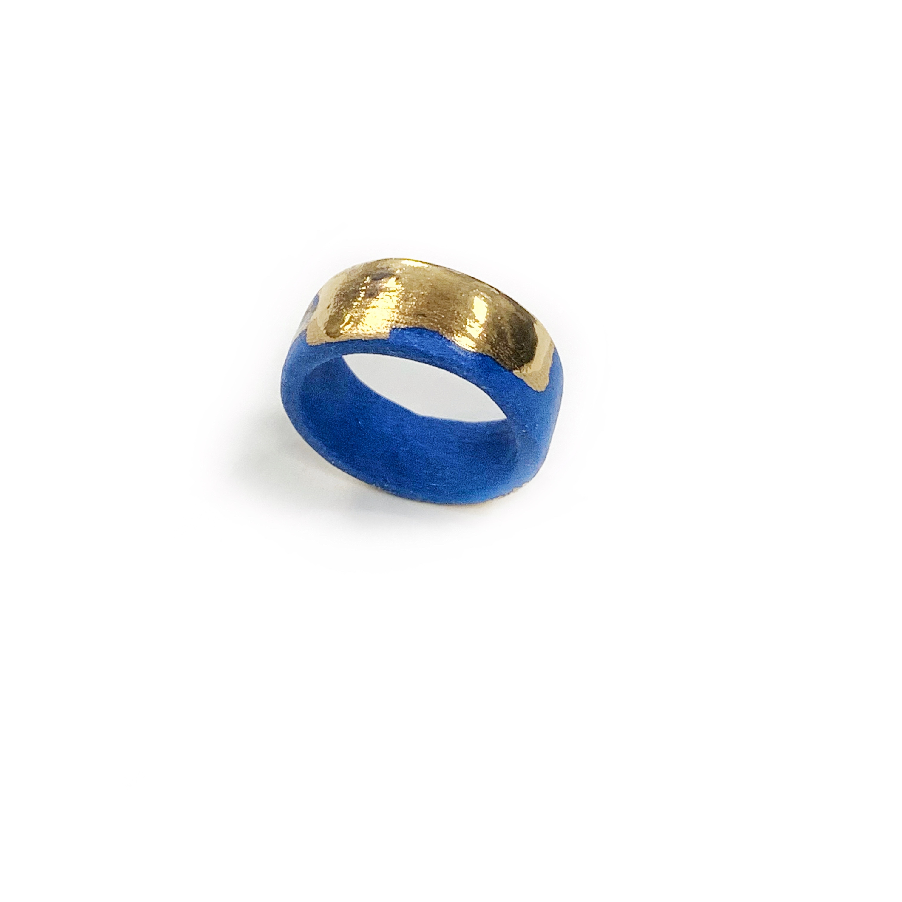 Auksu padengtas mėlynas porcelianinis žiedas.