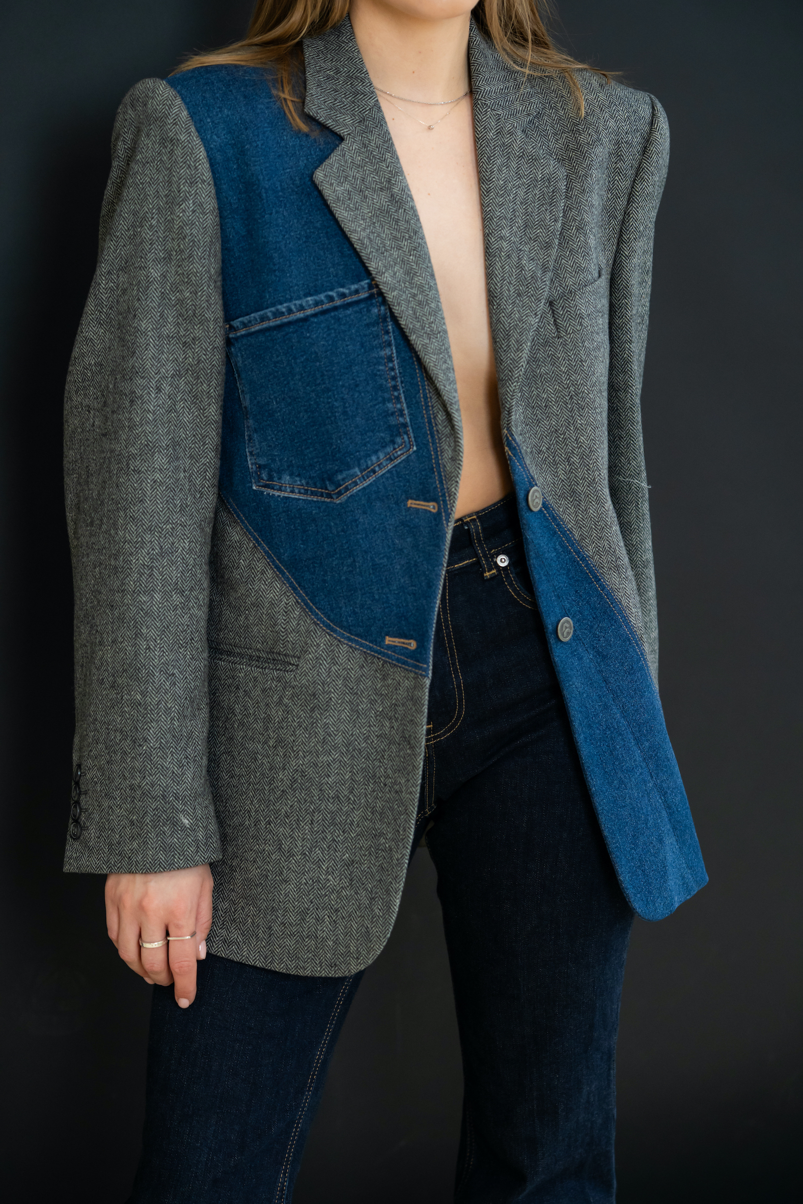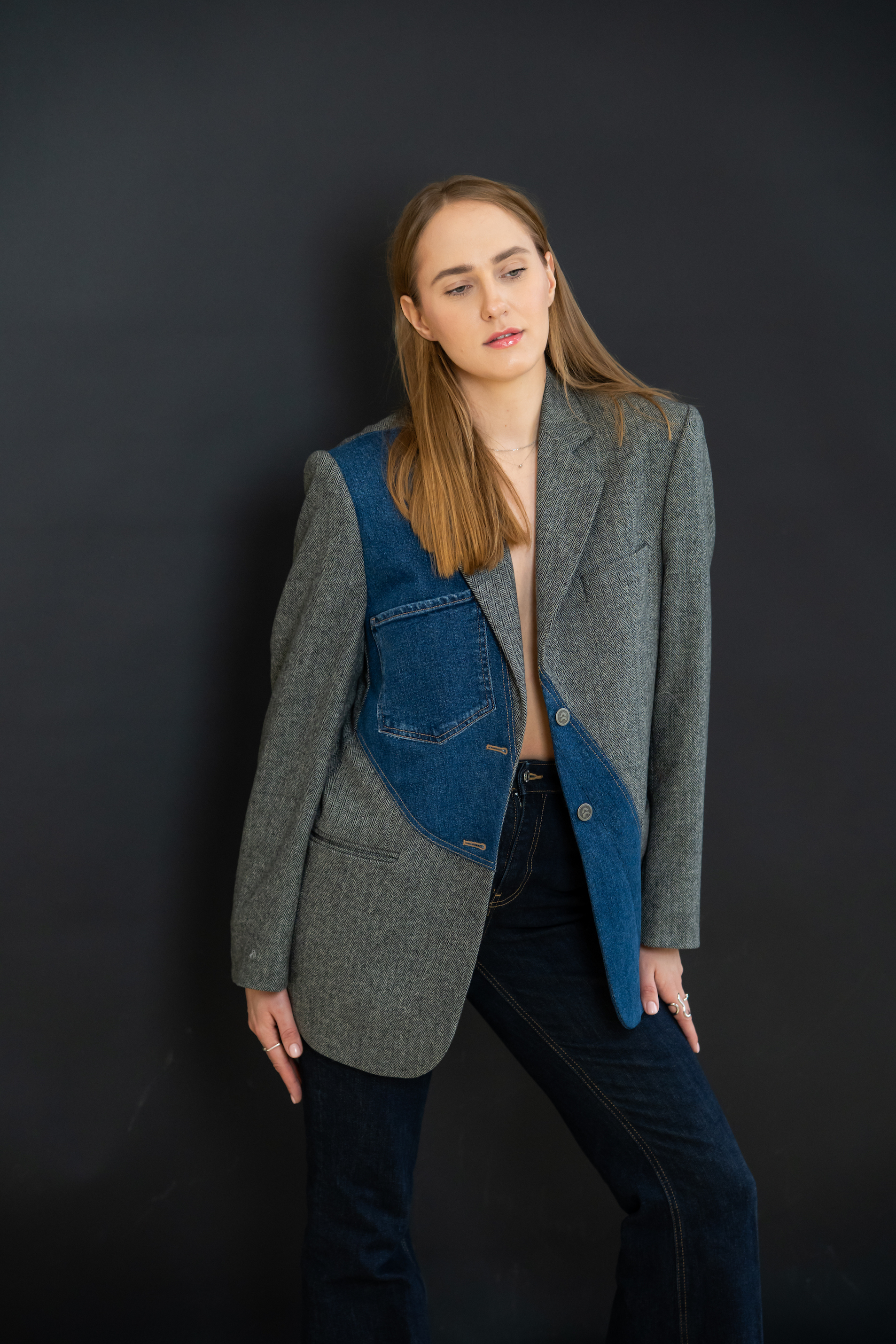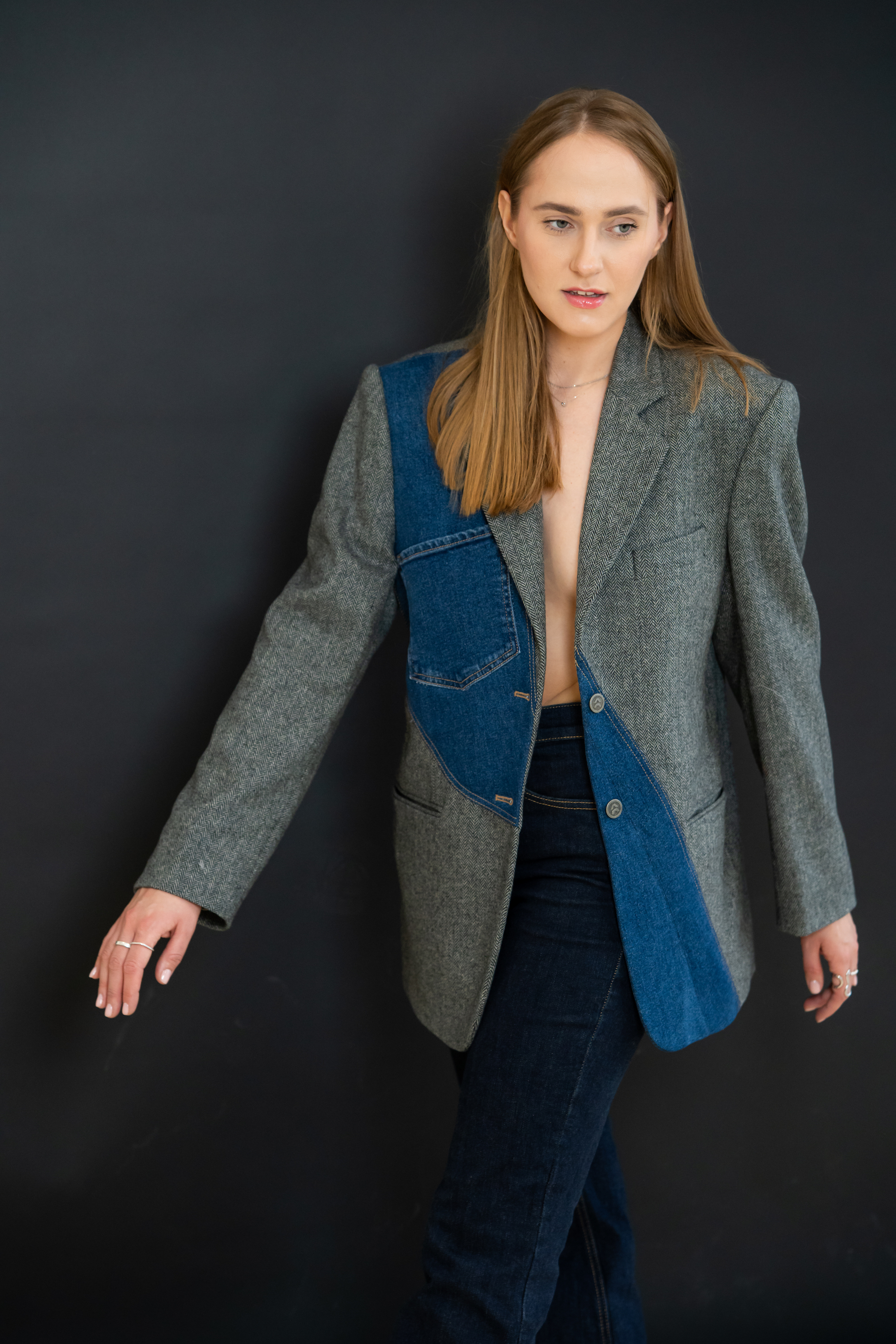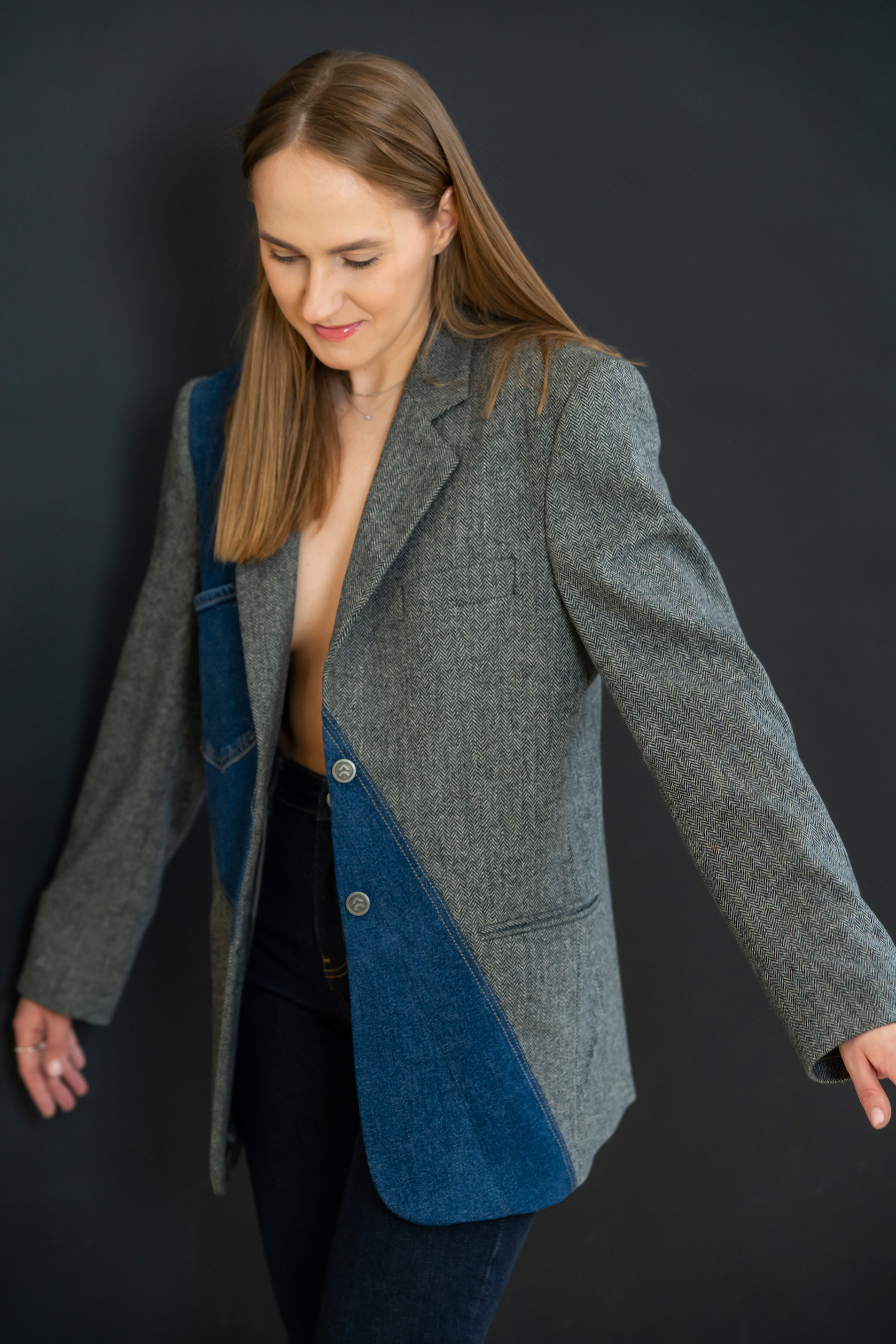 Iš senų audinių vertingai perkurtas švarkas, kuriam naują istoriją suteikia kontrastingos džinso detalės. Klasikinis pilkas audinys derinamas su mėlynu džinsu, išryškinant išskirtines silueto linijas ir suteikiant modeliui modernų, urbanistinį charakterį. Rankomis įsiūtos detalės ir tvarios mados principai pabrėžia kruopštų darbą bei atsakingą kūrybą. Idealus pasirinkimas ieškančioms stiliaus, originalumo ir sąmoningo vartojimo.