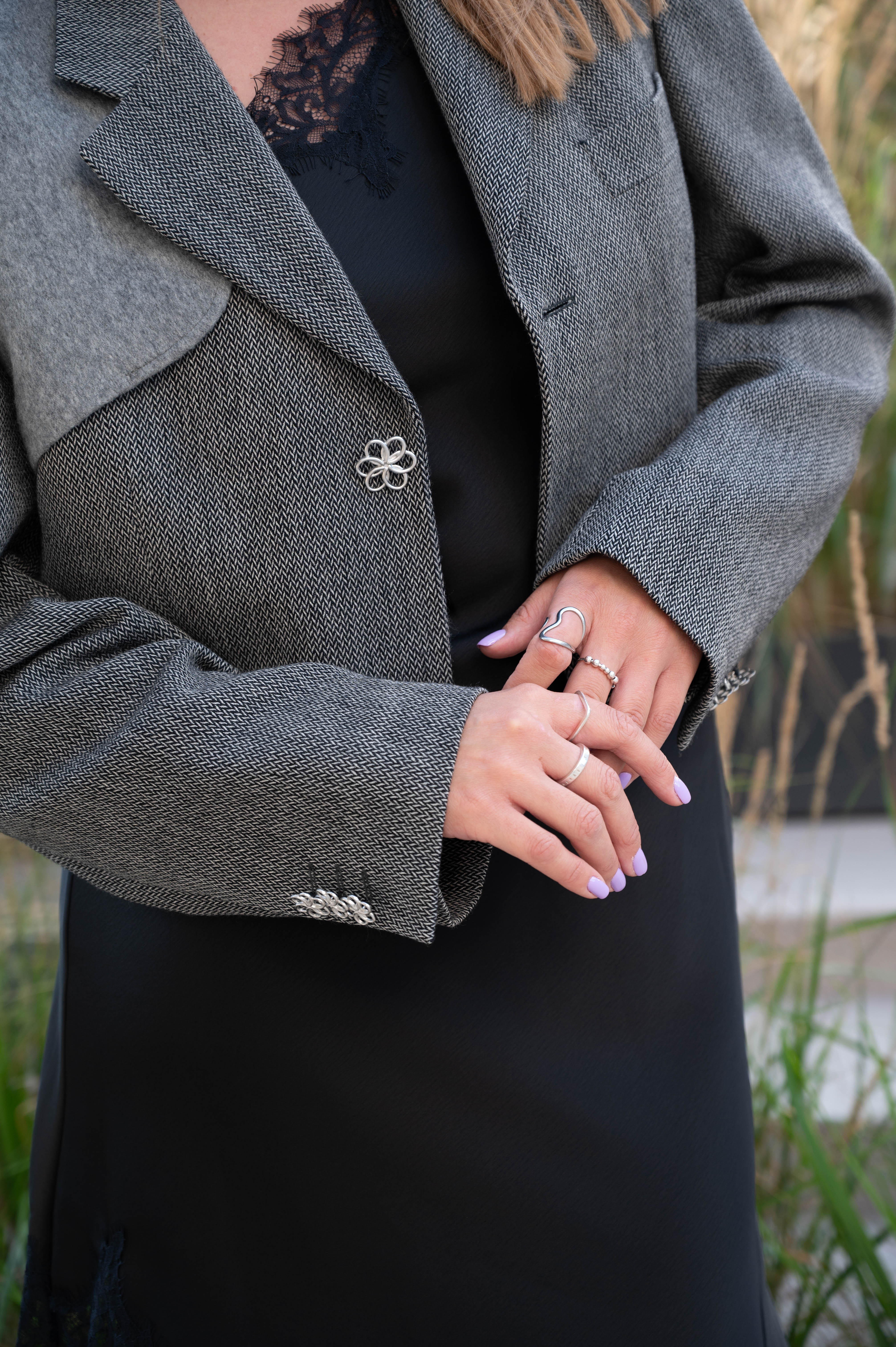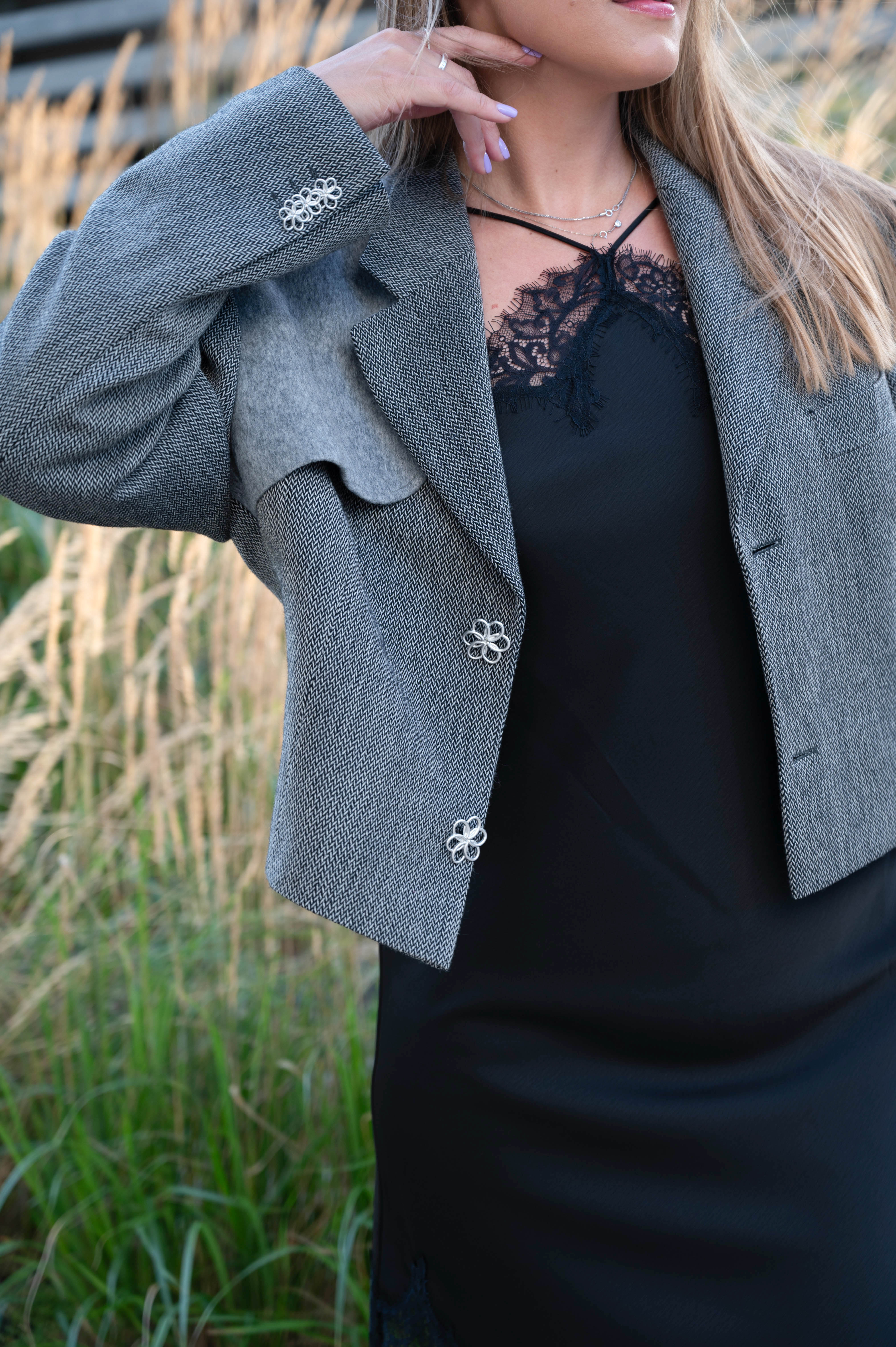 Stilingas trumpintas transformacinis švarkas, perkurtas iš seno į visiškai naują, modernų modelį. Dekoratyvinės sagos ir išraiškingi atlapai suteikia jam elegancijos, o tvarios mados principai – pridėtinę vertę. Klasikinio pilko atspalvio švarkas lengvai dera prie suknelių, kelnių ar sijonų ir tampa išskirtiniu akcentu tiek kasdieniams, tiek vakariniams deriniams.