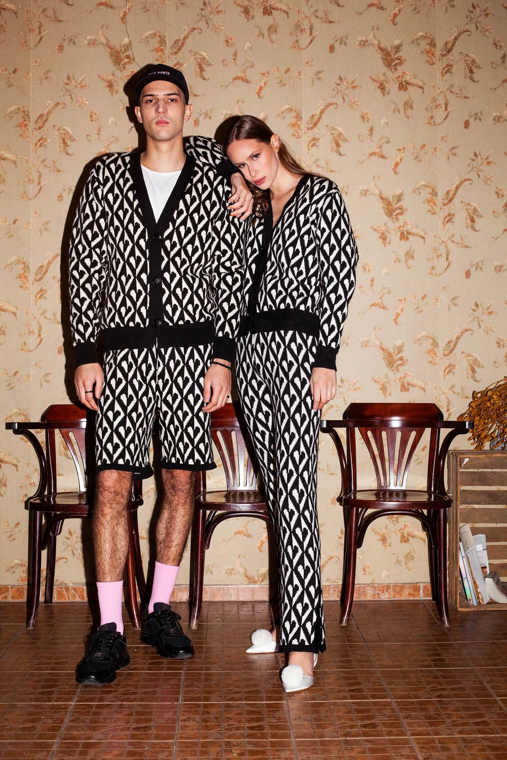 MILD POWER. Megztos kelnės su žakardo languotais raštais