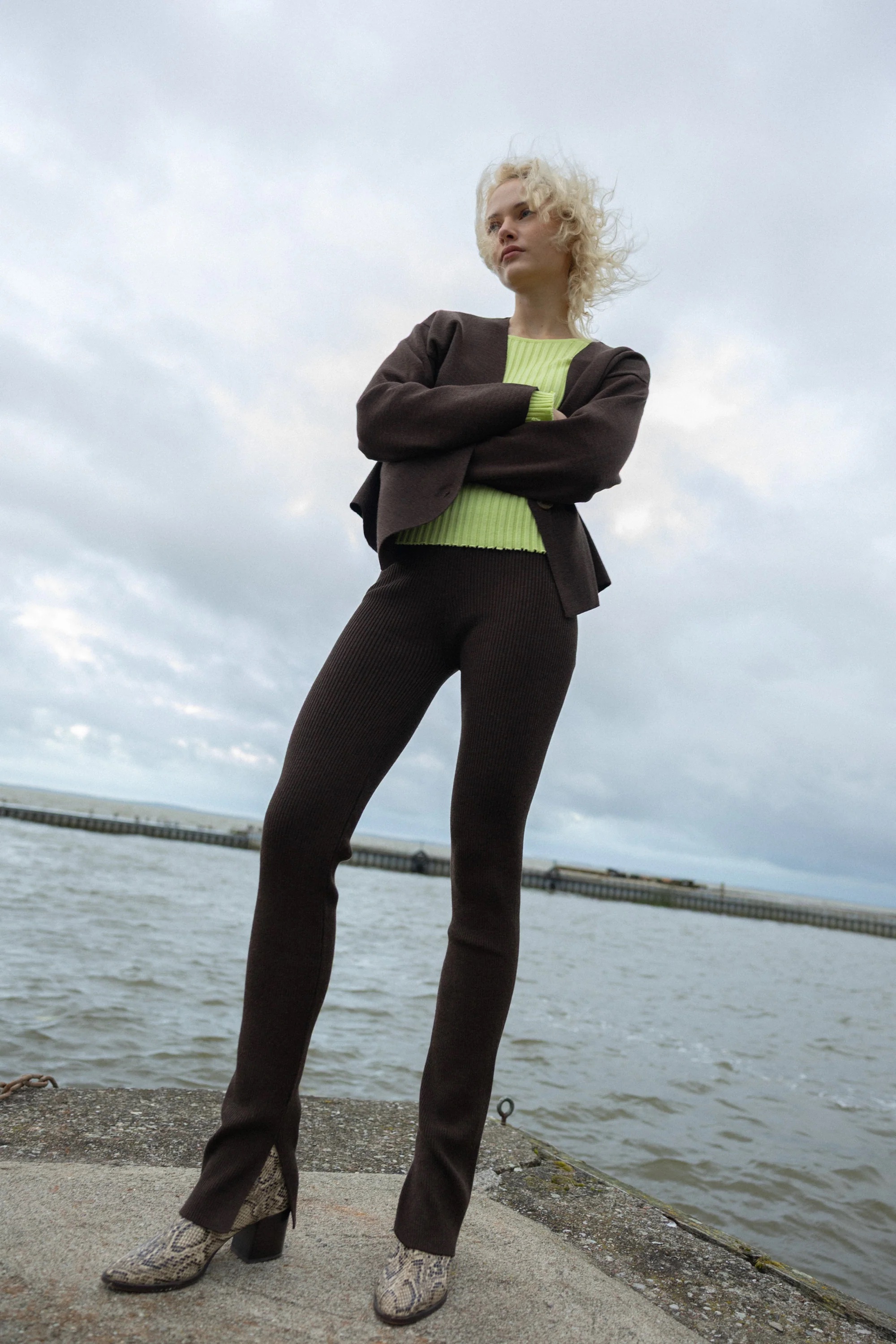 Megztos stulpeliu, prigludusio silueto su skeltukais apačioje bei sagute reguliuojamu liemeniu - taip, visai kaip vaikiškuose drabužiuose! Mūsų klientėms tai puikiai pasiteisino. Išbandėme jas ant daugybės įvairių moterų, turinčių skirtingas kūno formas, dydžius ir net nėštumo metu. Visos patikino, jog jos puikiai prisitaiko prie kūno! Dėvėkite deriniuose su mėgstamais marškiniais, švarku ar oversize stiliaus megztiniu.