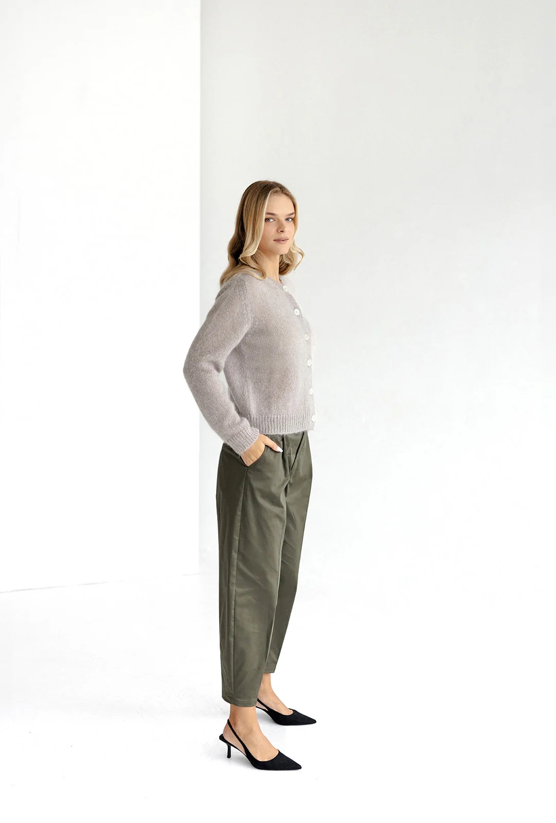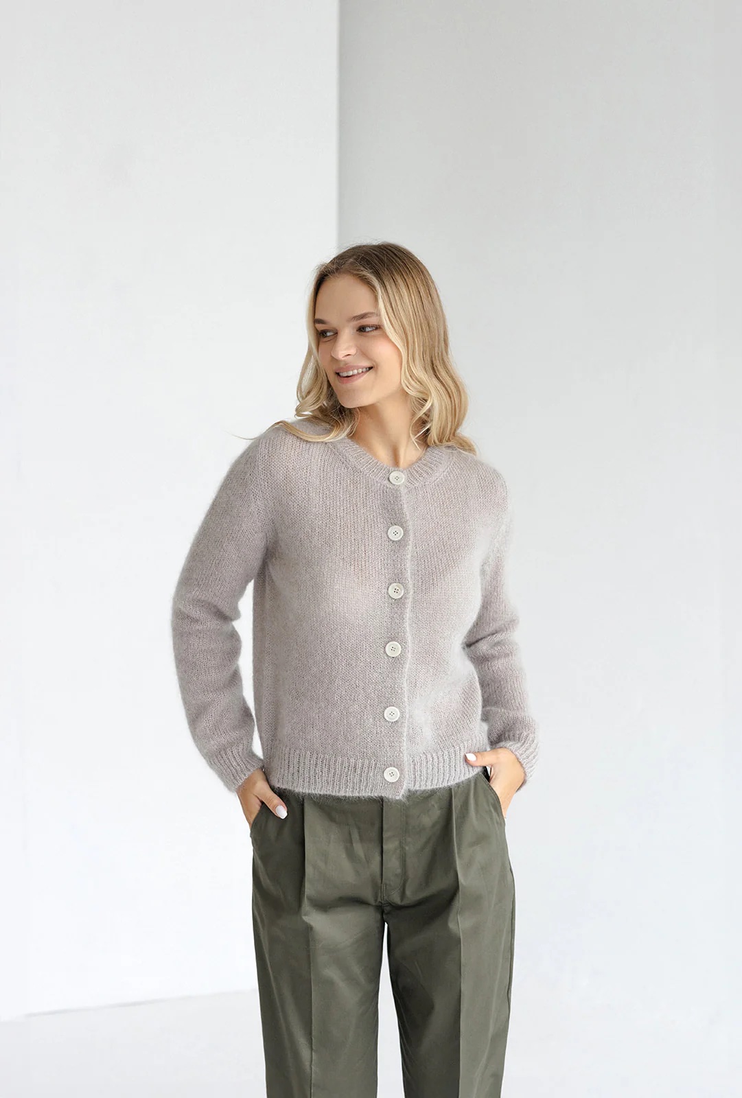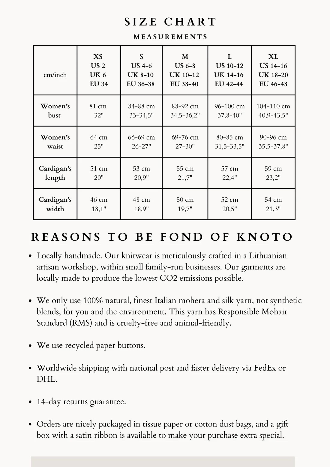 Sudėtis: moheros ir šilko mišinys. Jokio sintetinio pluošto – tiek jums, tiek aplinkai. Siūlai turi Responsible Mohair Standard (RMS) sertifikatą, yra cruelty-free ir draugiški gyvūnams. Naudojame perdirbto popieriaus sagas.