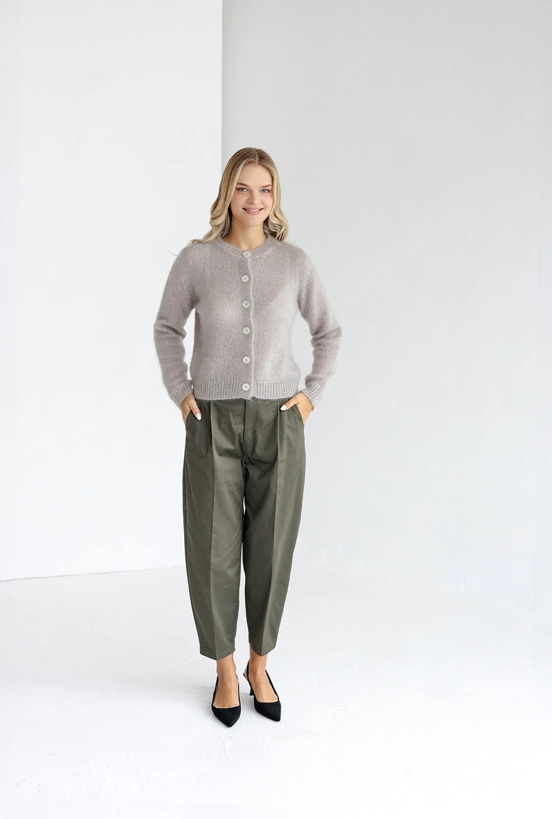 Apsigaubkite šiluma ir elegancija su šiuo baltu, pynės raštu megztu moheros kardiganu. Pagamintas iš minkštos, pūkuotos moheros, šis megztinis pasižymi klasikiniu užsegimu sagomis ir jaukia, stora tekstūra, idealiai tinkančia rudens ir žiemos sezonams. Smėlio atspalvis ir švelniai pūkuotas paviršius paverčia jį puikiu kapsulinio garderobo pasirinkimu ir stilingu sluoksniavimo drabužiu ypatingoms progoms. Trumpesnis ilgis suteikia modernumo, derinant patogumą ir rafinuotumą į laikui nepavaldžią stilistiką.
