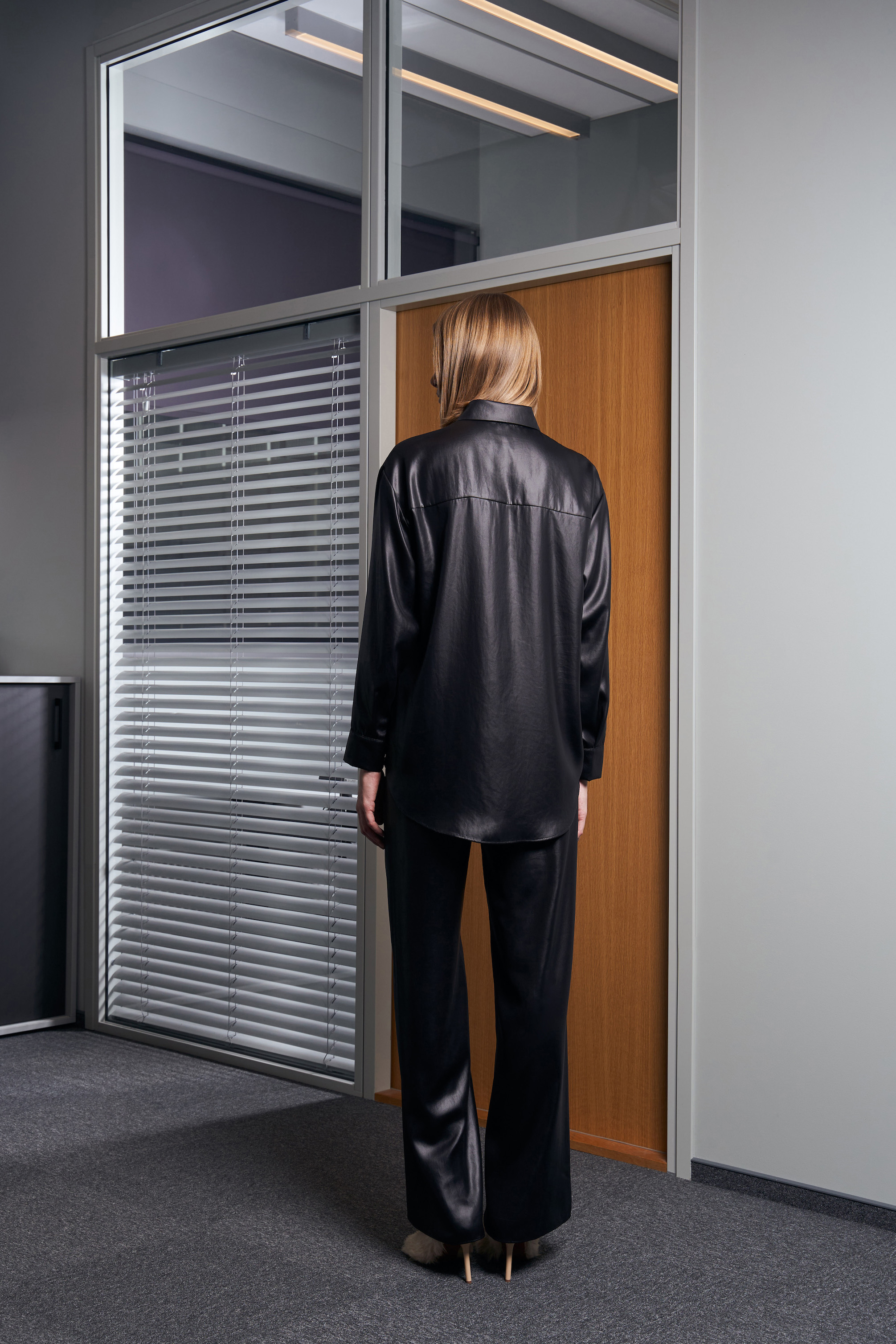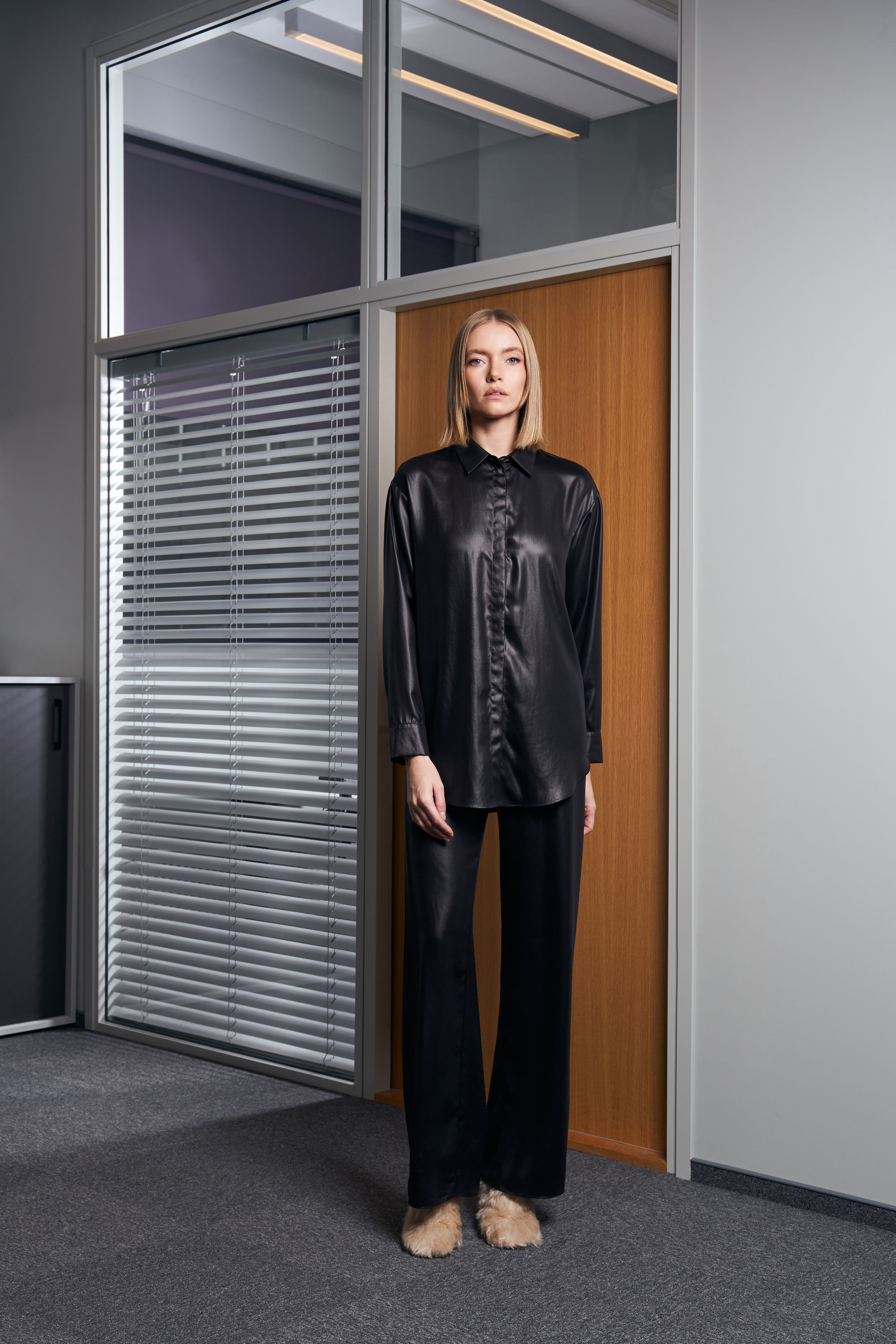 Laisvo kirpimo marškiniai, pasiūti iš juodo audinio su subtiliu blizgesiu, suteikiančiu elegantišką ir modernų įvaizdį. Užsegimas paslėpta spaude suteikia švarų ir minimalistinį įvaizdį.