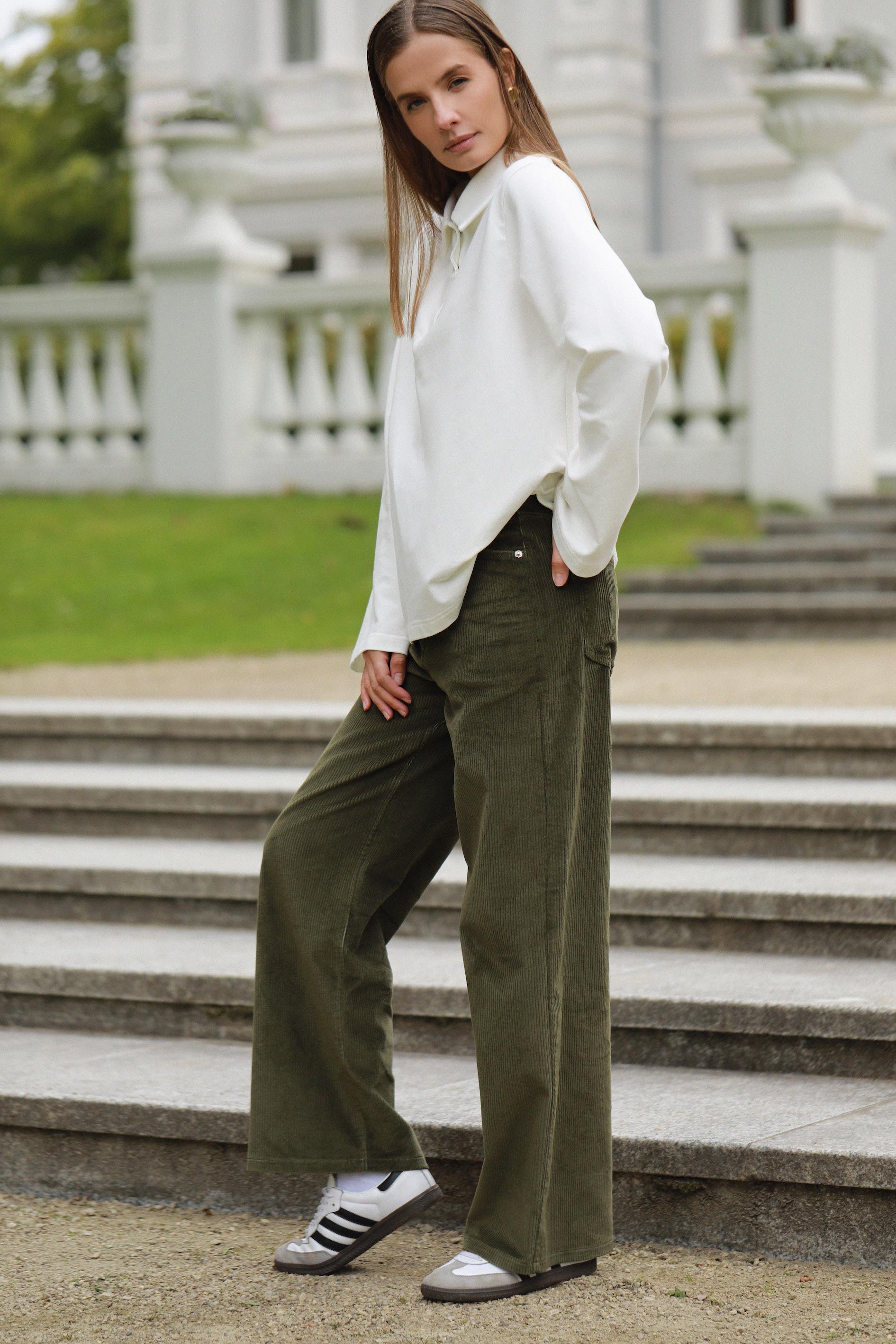 Platus rankovių kirpimas suteikia šiuolaikiškumo, o atlenkiamas apykaklės dizainas – klasikos ir elegancijos pojūtį.