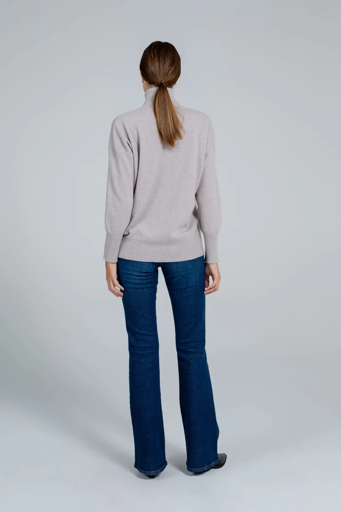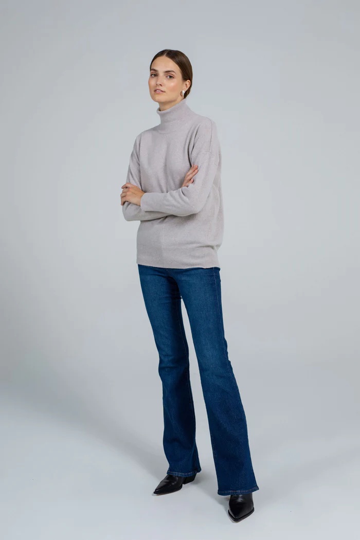 Klasikinis aukštu kaklu kašmyro megztinis – nepakeičiamas garderobo pagrindas. Šis laisvo kirpimo, stambaus mezgimo megztinis išlaiko laiko patikrintą dizainą ir aukštą kokybę. Jį galima dėvėti tiek kaip pagrindinį drabužį, tiek sluoksniuoti po liemene ar švarku.