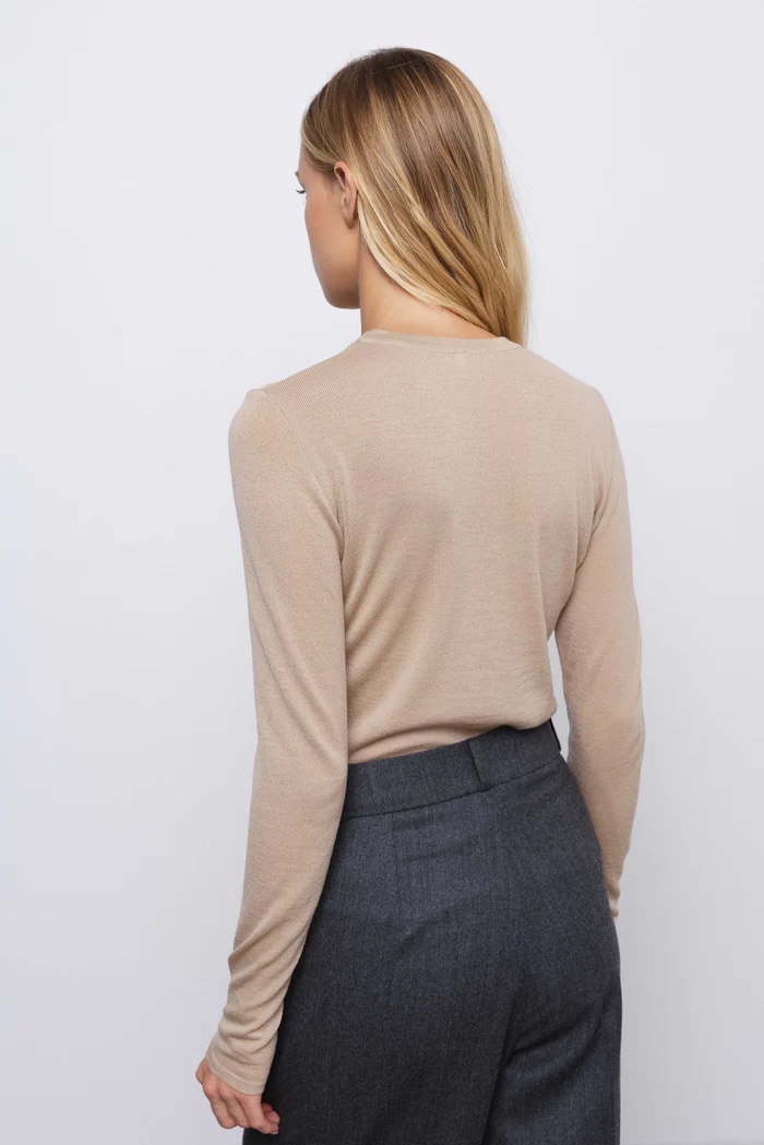 Patogi 'LINA' ilgomis rankovėmis palaidinė, pagaminta iš prabangios merino vilnos, pasižymi klasikiniu dizainu ir universaliomis spalvomis. Puikiai tinka sluoksniavimui vėsesniu oru arba nešiojimui savarankiškai. Palaidinė yra universali kasdienio garderobo dalis.