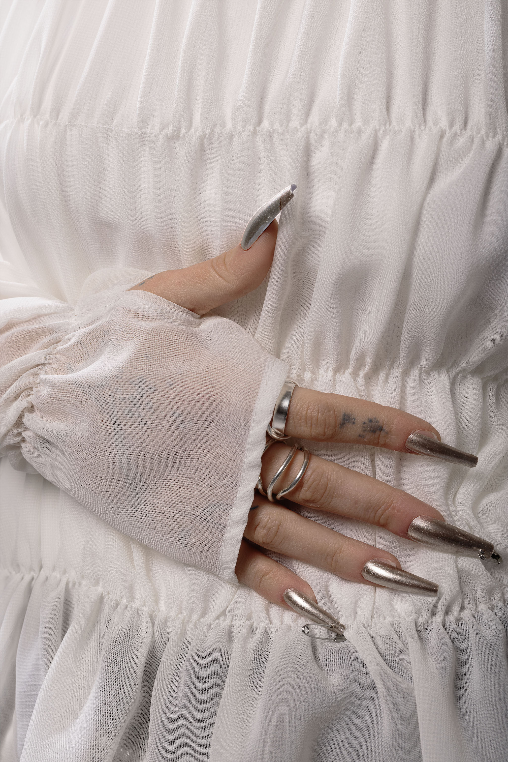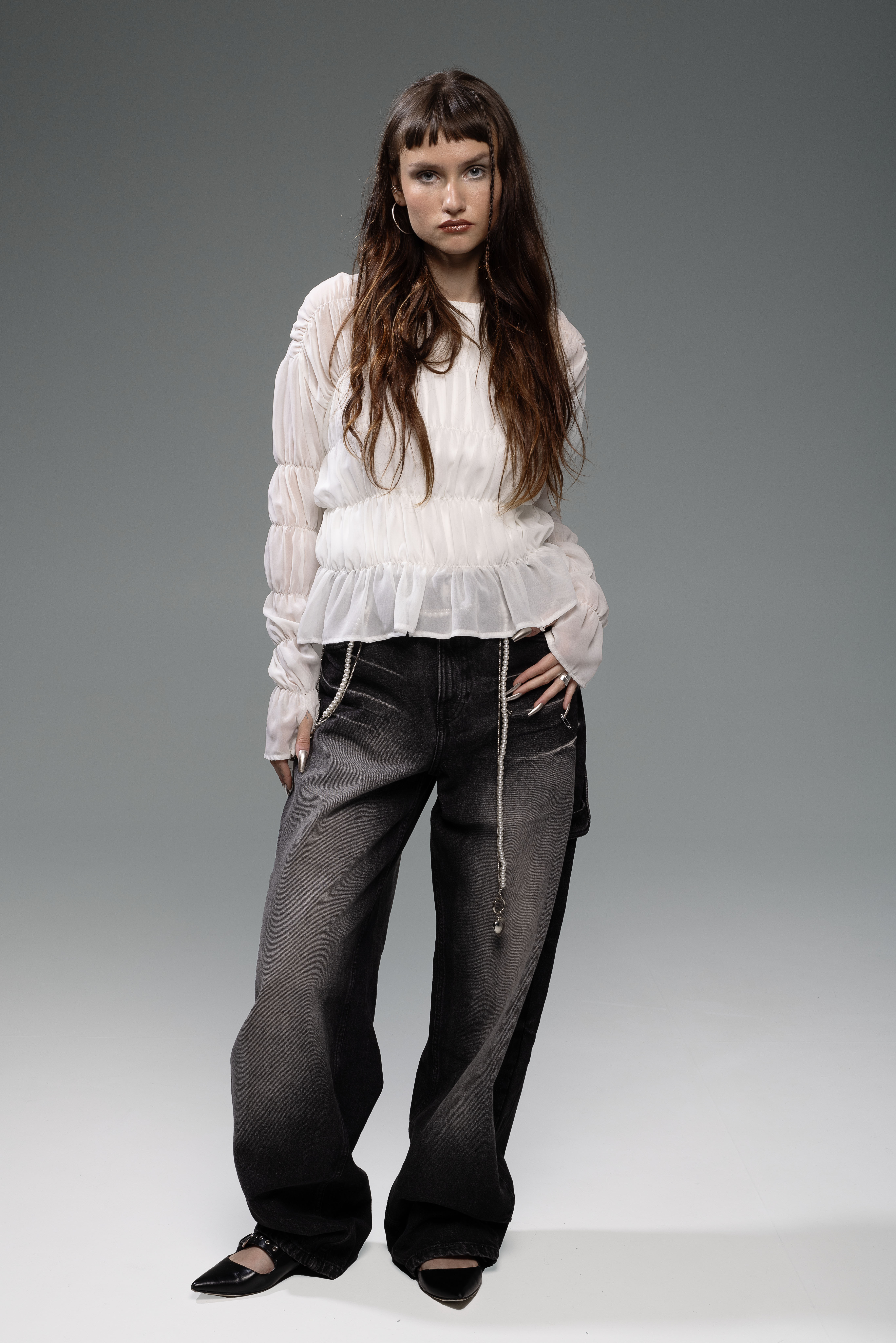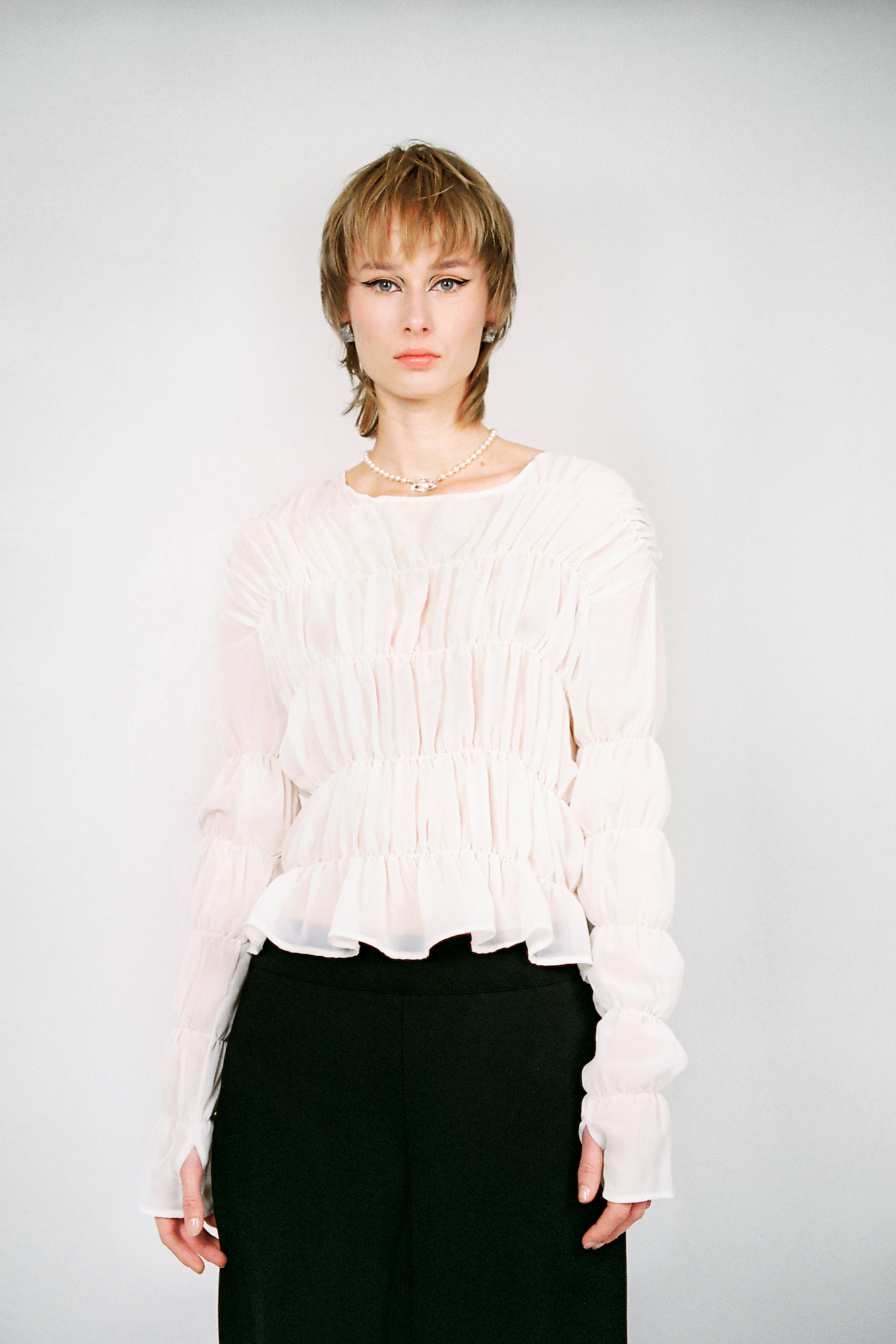 Palaidinė turi ilgas, pailgintas rankoves su nykščio detale, leidžiančia audiniui natūraliai priglusti prie rankos ir suteikiančia modernų, šiek tiek griežtesnį akcentą. Šifonas yra lengvas, pusiau permatomas, elastingas ir malonus odai, todėl palaidinė tinkama tiek sluoksniavimui, tiek dėvėjimui kaip pagrindinis drabužis.