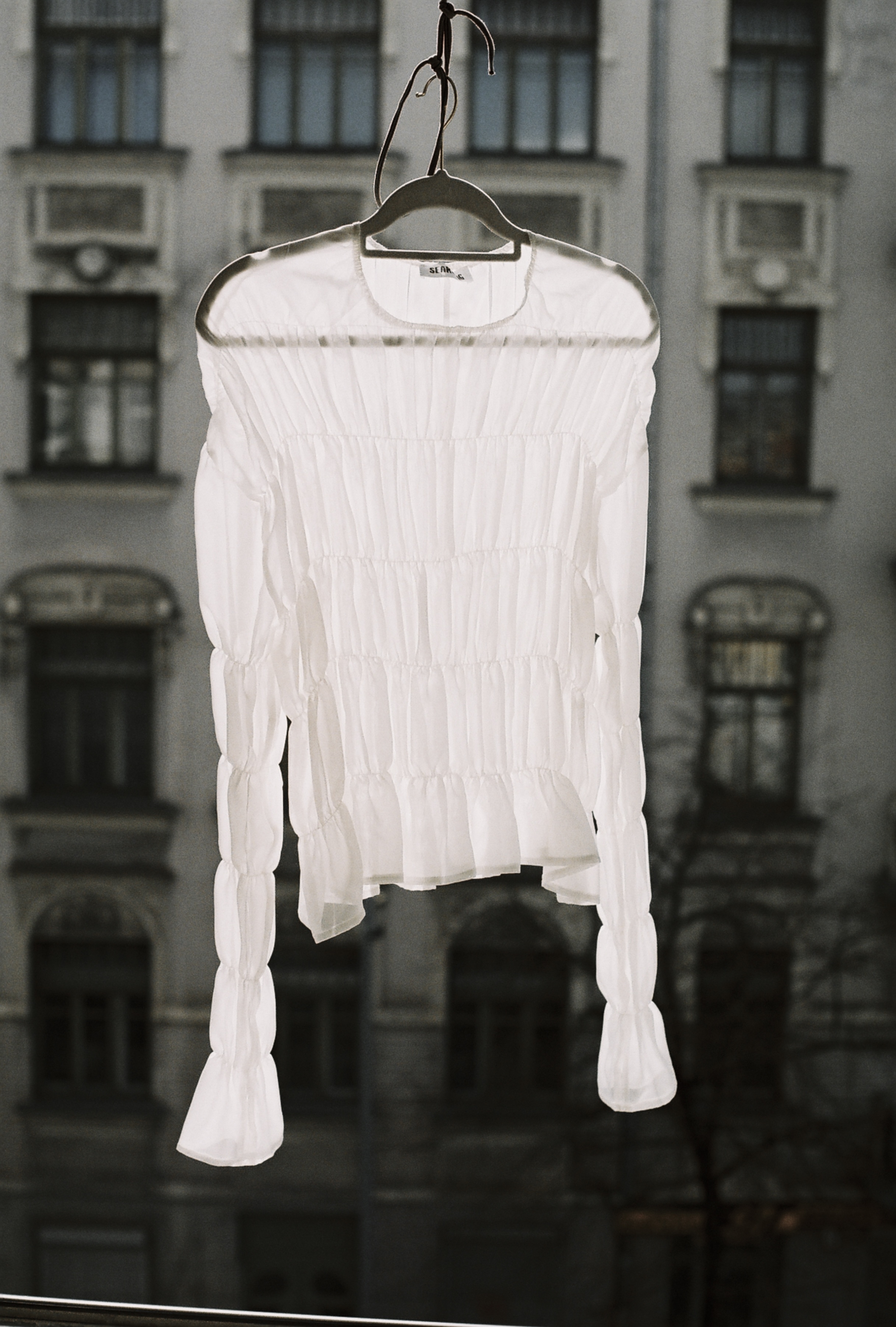 Raukta šifono palaidinė su subtiliai formuojamu siluetu. Modelis siūtas tampriu siūlu, kuris leidžia audiniui prisitaikyti prie kūno ir sukuria švelniai krentančią formą. Liemens ir rankovių raukimas išryškina figūrą, išlaikant lengvą ir neapsunkintą vaizdą.