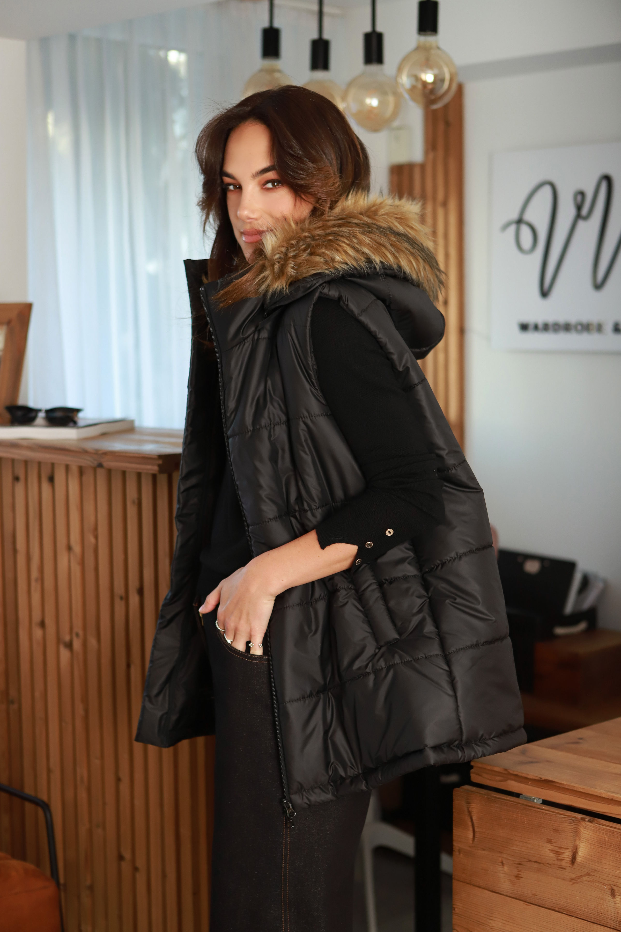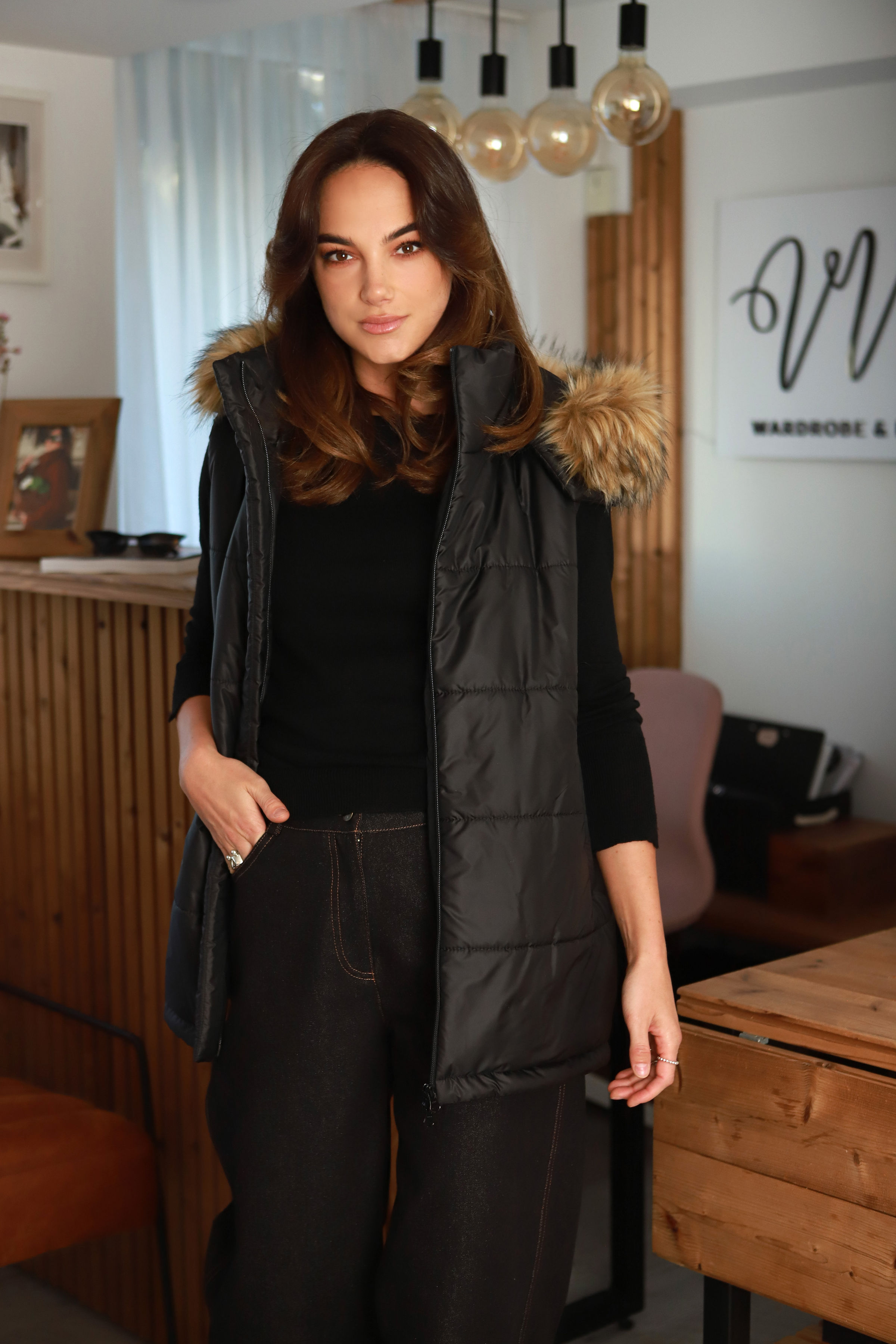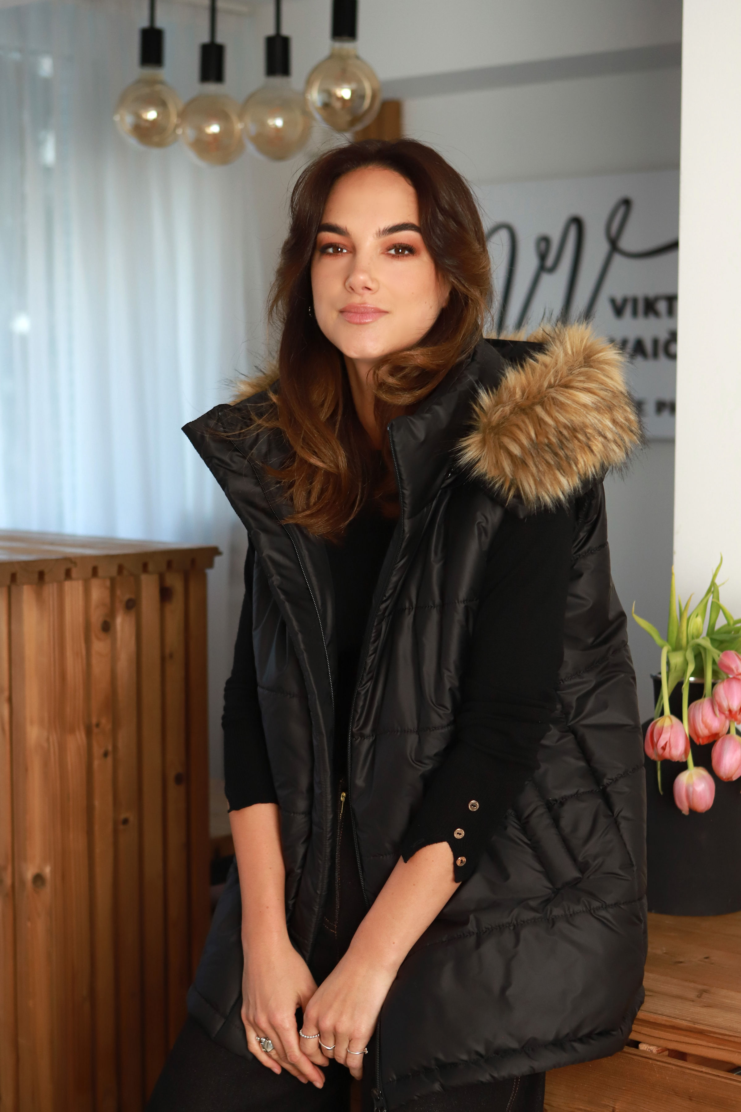 O dabar priešais Jūsų akis- tikras „transformeris“- liemenė, kuri nuo sportiškos ir „kapišonuotos“ , sudarančios šiltą įspūdį- „kailiuotos“- per sekundę gali tapti labai asketiška ir tinkanti ją derinti- net ir prie klasikinių derinių!