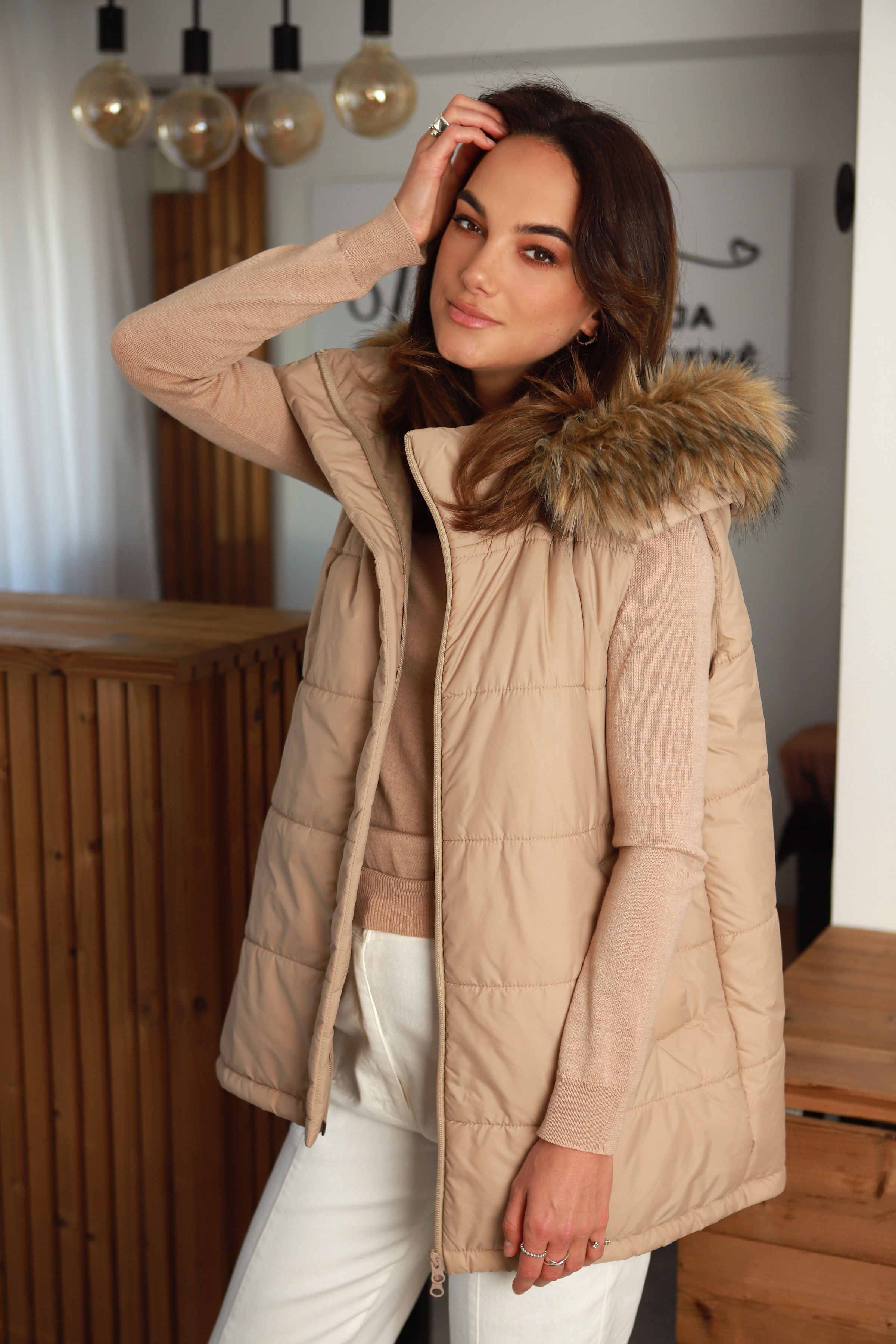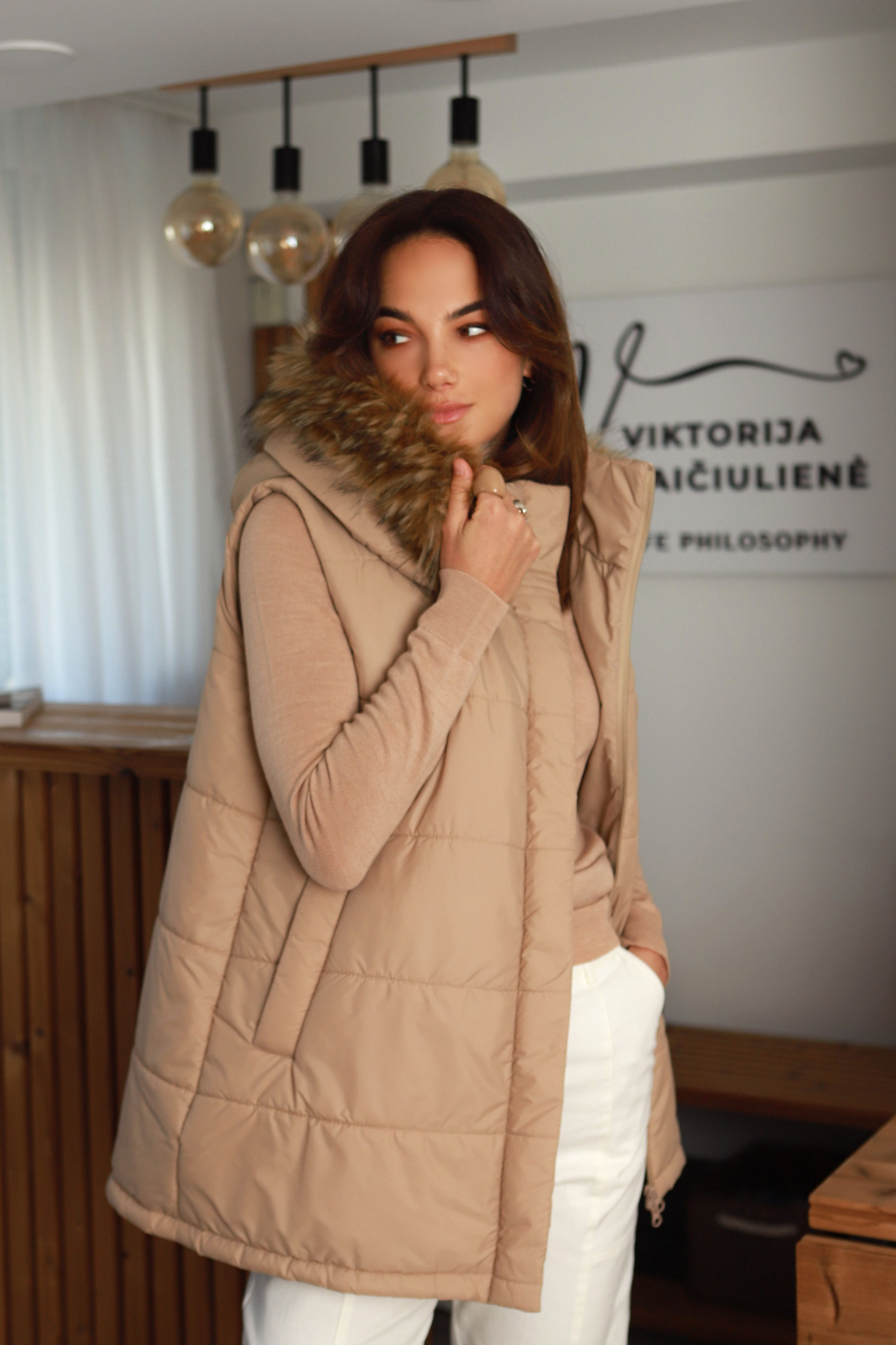 - Modeliui daugybę liaupsių galima skirti už ne tik nusisegantį kailiuką, bet ir patį „kapišoną“, kurį palikus namuose- liemenė puikiai gali jungtis ir į klasikinius derinius.