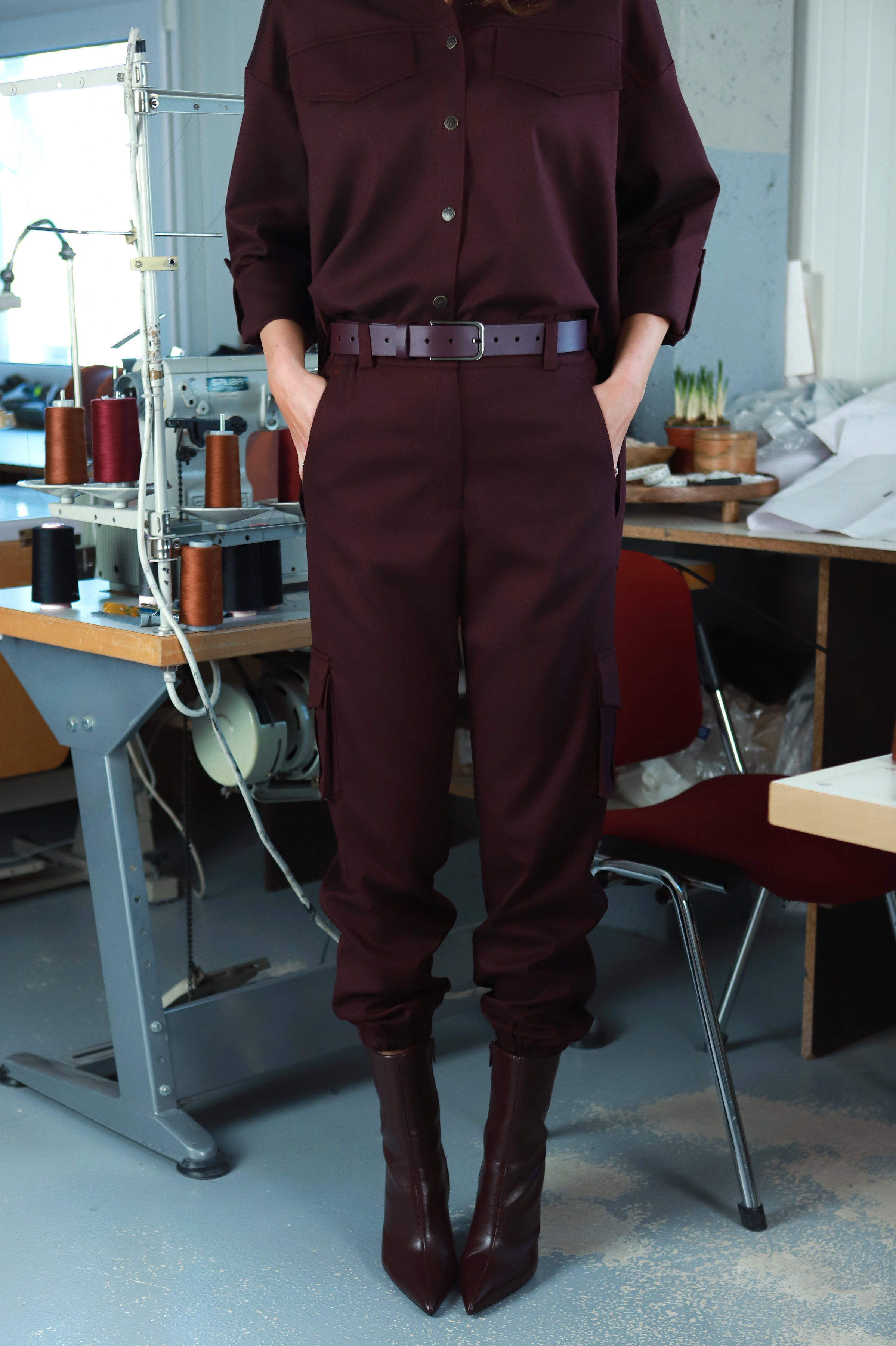 Šios kelnės pasiūtos iš akį traukiančios, subtilios tekstūros audinio, o sodri burgundiško vyno spalva įvaizdžiui suteikia gilumo. Tai viena iš trijų ,,Merlot"  kostiumo dalių, leidžianti kurti vientisą, bet nenuobodų, nuo klasikos šiek tiek ,,pasprukusį" derinį.