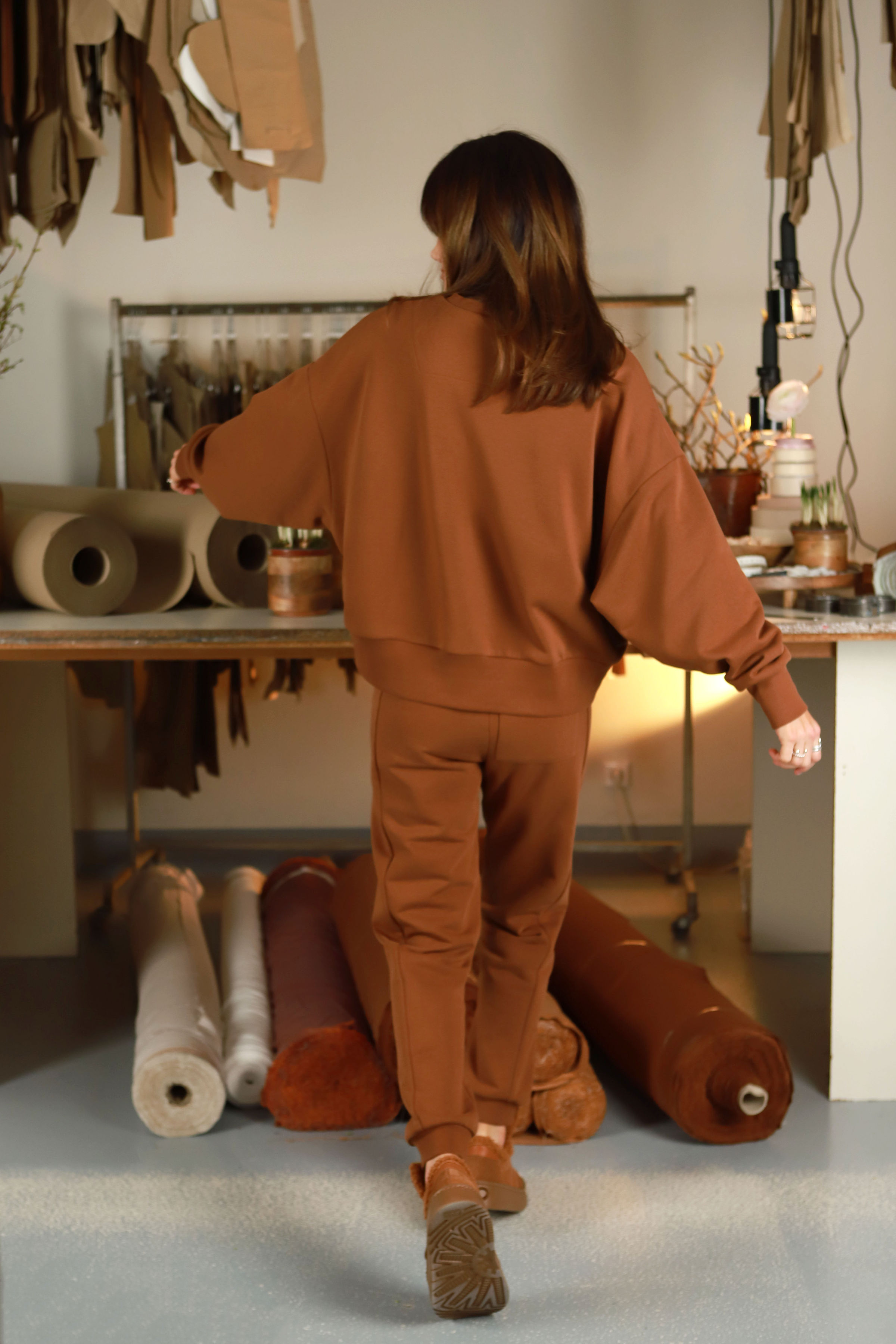 Ypatingą vietą šiame laisvalaikio kostiume užima išskirtinės kokybės audinys, kurį savo užsakymu dažėme Portugalijoje, specialiai priderindami prie Pavasaris /26 kolekcijos tonų. Tai audinys, kuriam skyrėme ne tik dėmesį, bet ir lūkestį – kad kostiumas būtų ne tik gražus šiandien, bet ir ilgaamžis „ilgai ir laimingai“. Jis malonus liesti, puikiai dėvisi, nenusikalbia ir nepraranda formos, todėl išlieka patikimu palydovu kasdienybėje ir kelionėse.