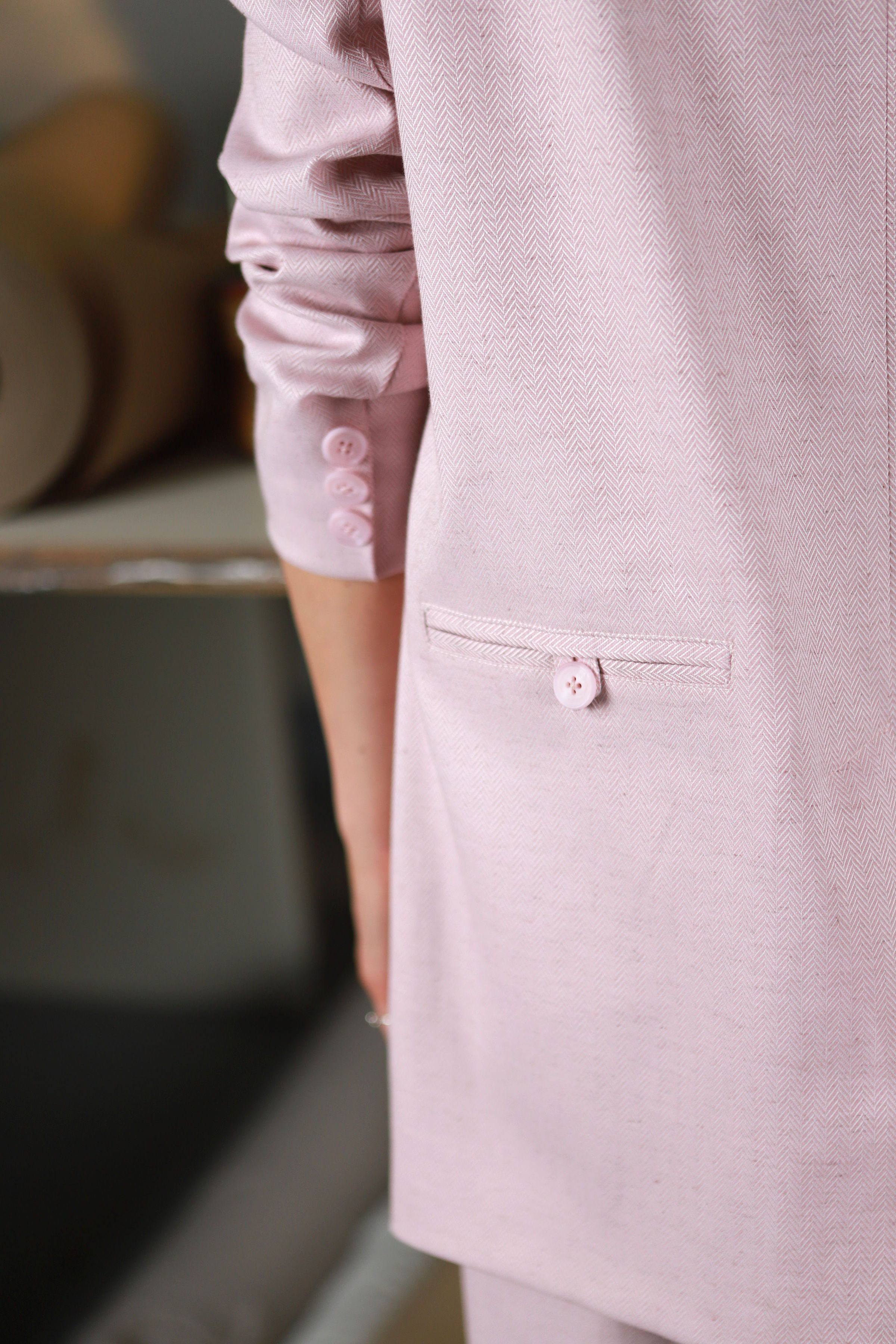 Tai ne šiaip švarkas, o tikras „Mes už kostiumus“  taisyklės herojus: dėvimas kartu su to paties audinio kelnėmis jis virsta pilnaverčiu, stilingu kostiumu, kuris tinka ir miestui, ir ypatingoms progoms. Žaisminga spalva, klasikinis siluetas ir apgalvotos detalės – tobula kombinacija toms, kurios mėgsta klasiką su saldžiu, netikėtu prieskoniu.